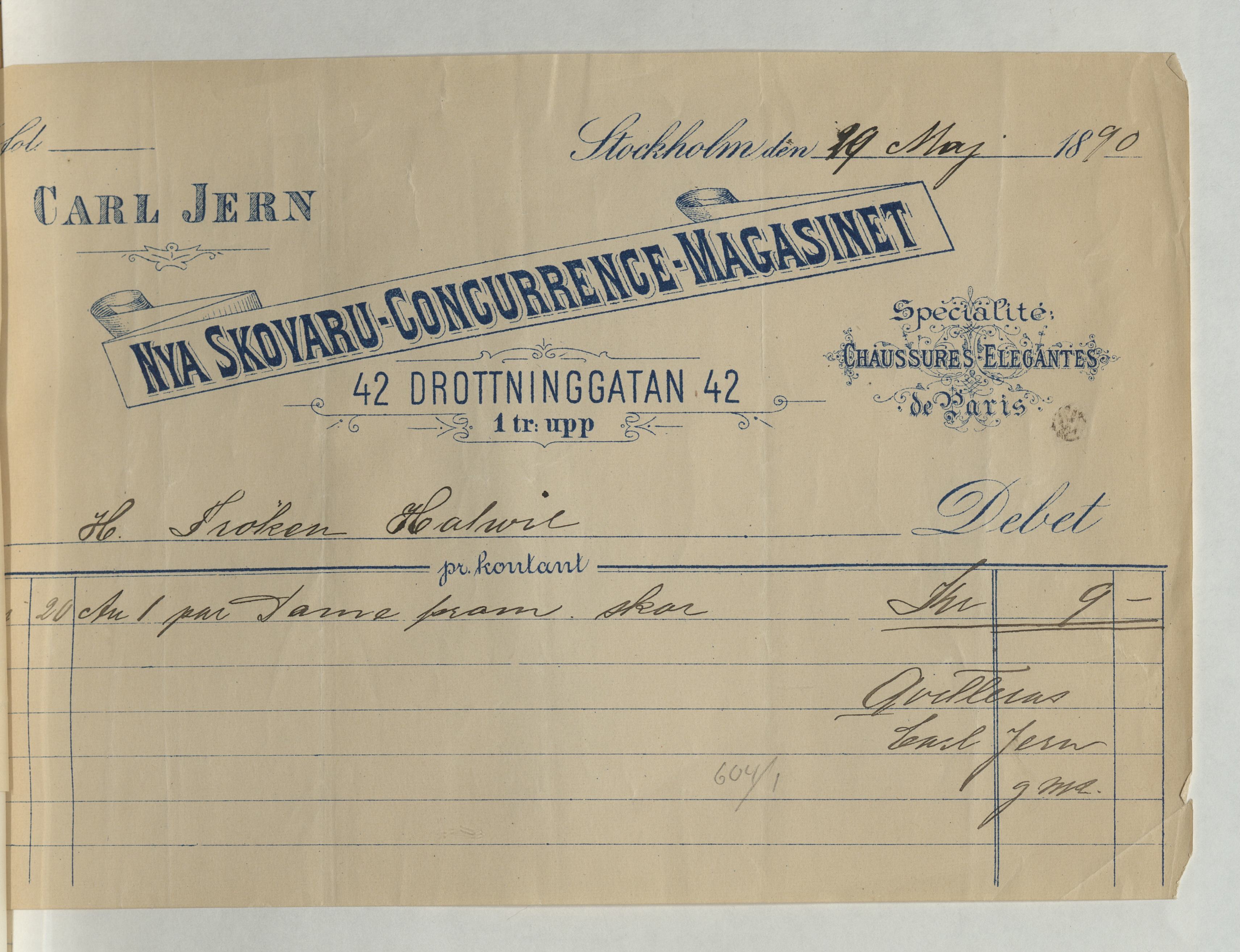 Kvitto från Nya Skovaru-Concurrence-Magasinet, för inköpta skor för 9Kr. Stockholm 20 maj 1890.