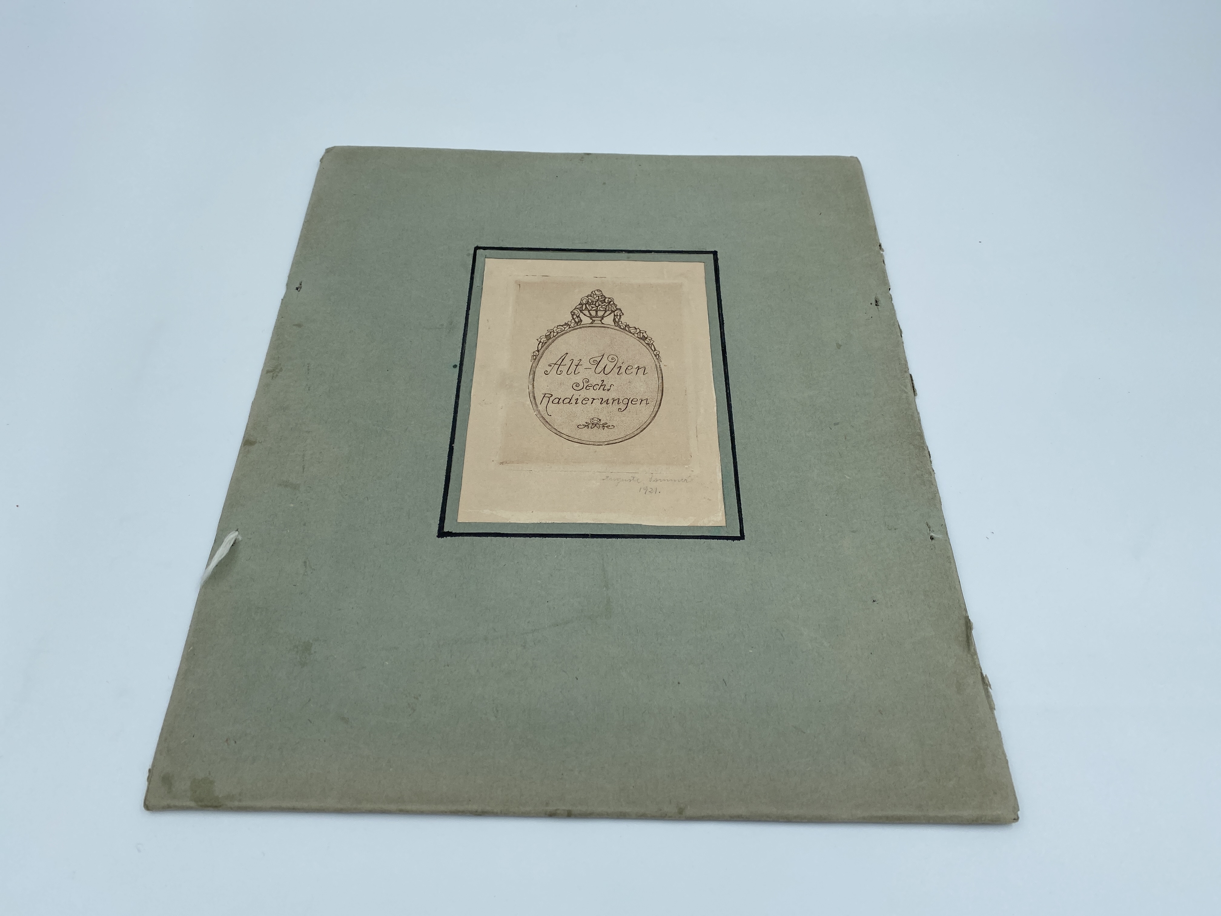 Framsida till grön mapp märkt "Alt-Wien Sechs Radierungen" (ung. "Sex etsningar föreställande det gamla Wien". Mappen har troligen hållits samman med band längs långsidorna, vilka inte längre finns kvar. Mappen är troligen tillverkad av den österrikiska konstnärinnan Auguste Sommer och har innehållit kopparstick.