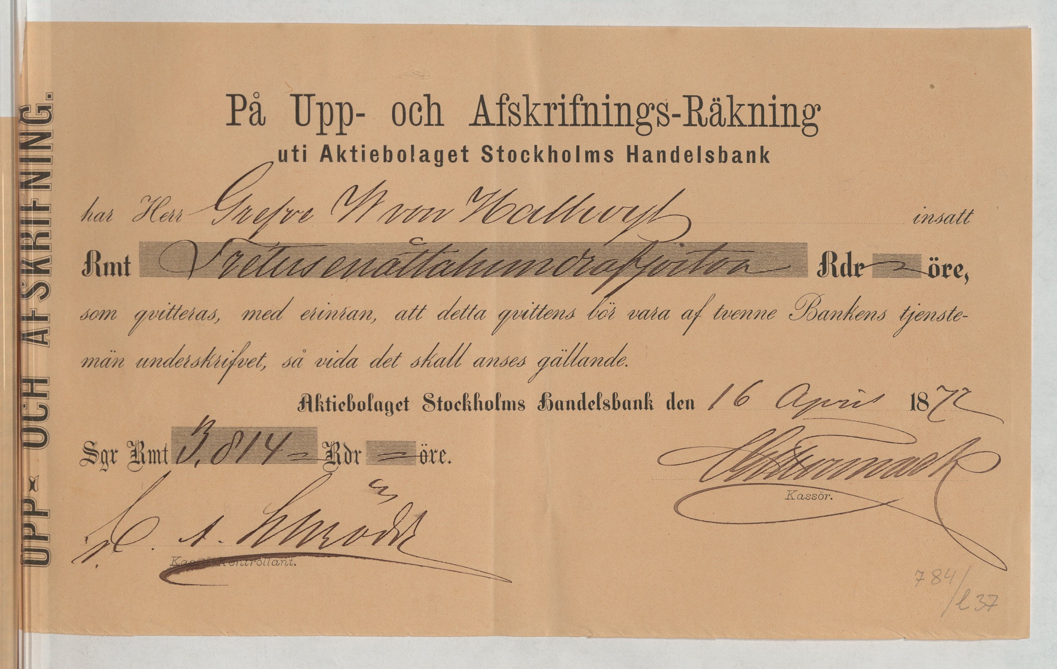 Kvitto från Aktiebolaget Stockholms Handelsbank rörande Upp- och Afskrifnings-Räkning