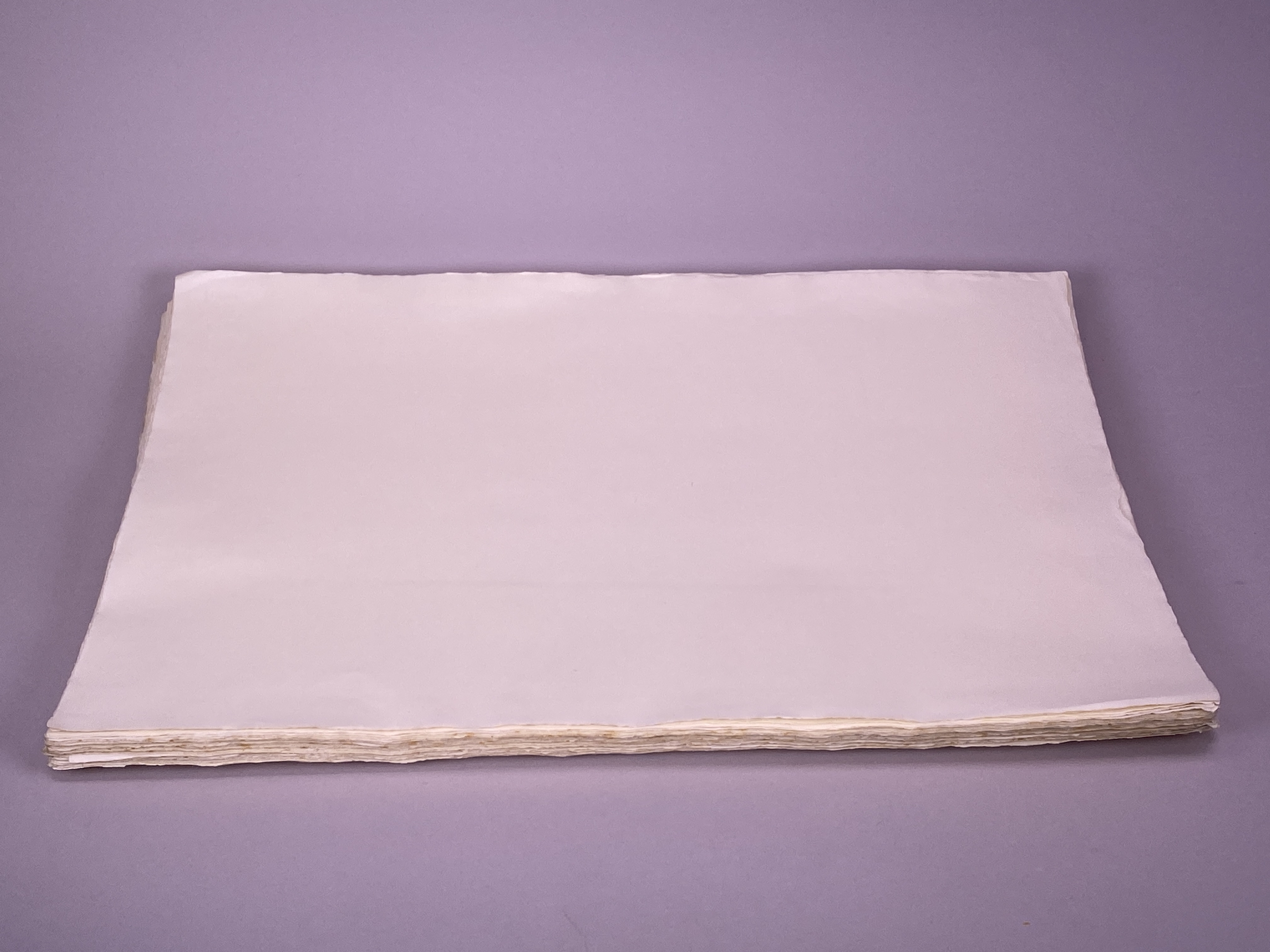En bunt pappersark tillverkade vid Tumba bruk. Pappersarken med antikrandig struktur samt enkelverkade vattenmärke föreställande Tumba bruks logotyp.