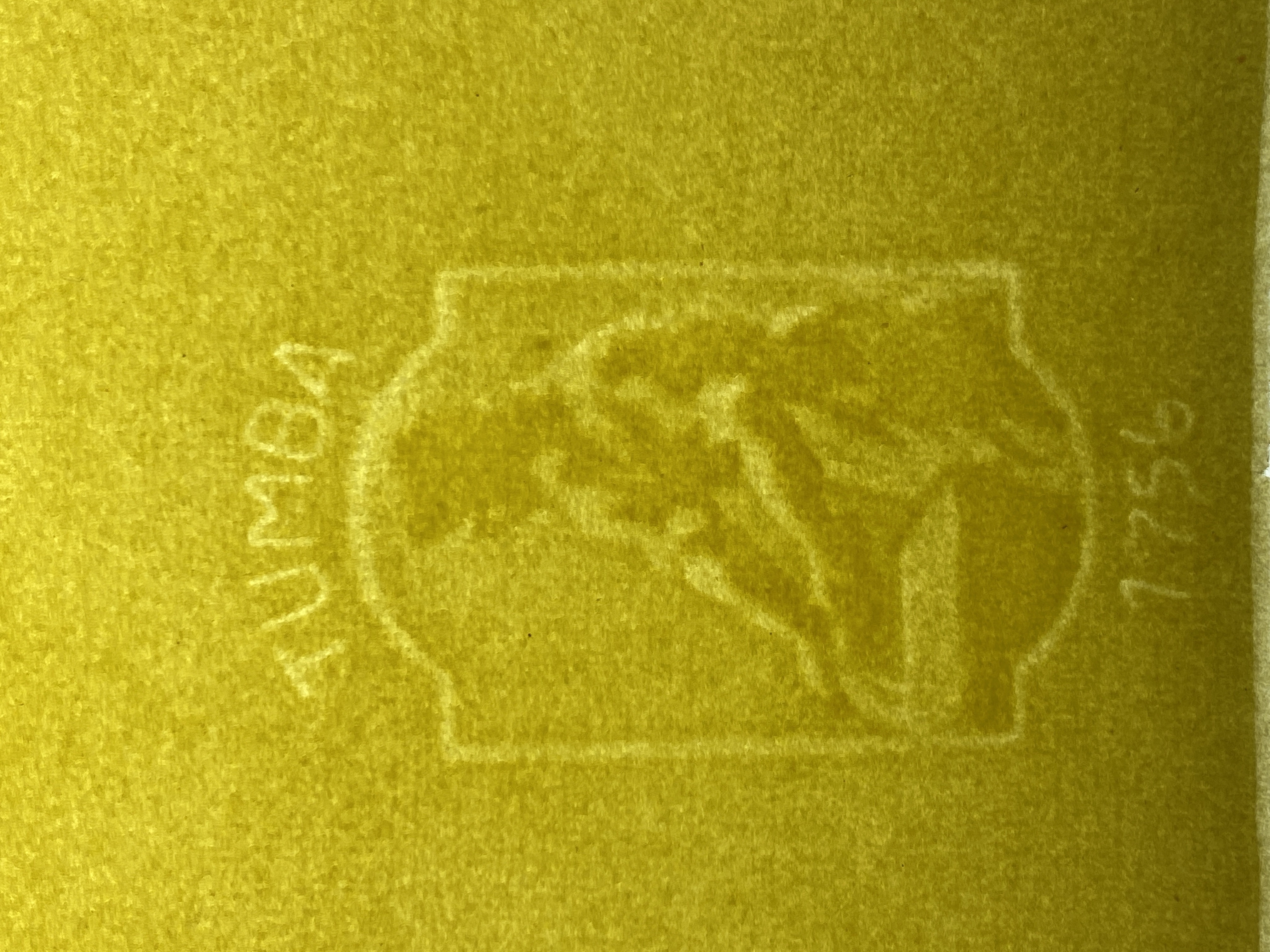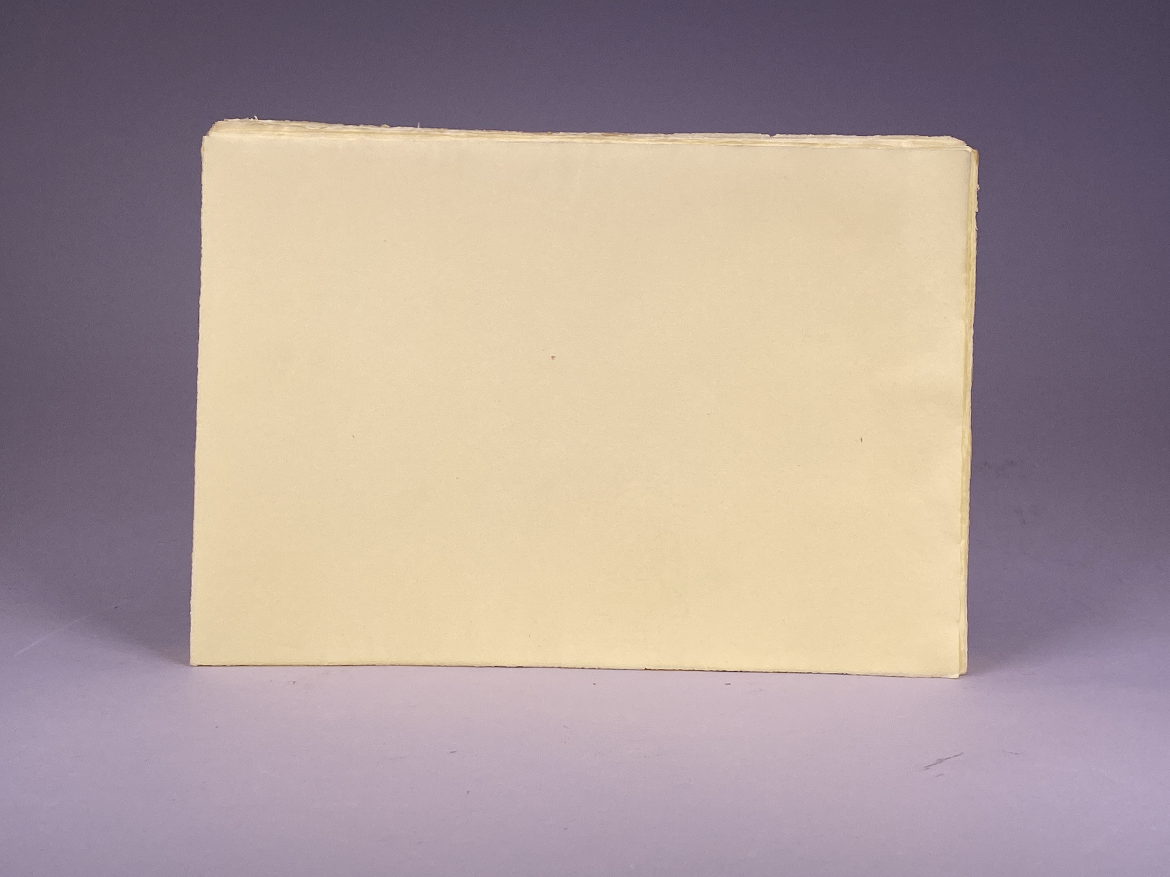 Papper, en bunt på 108 stycken pappersark. Handgjort med vattenmärke föreställande handpapperstillverkning, samt skriften "TUMBA 1756".