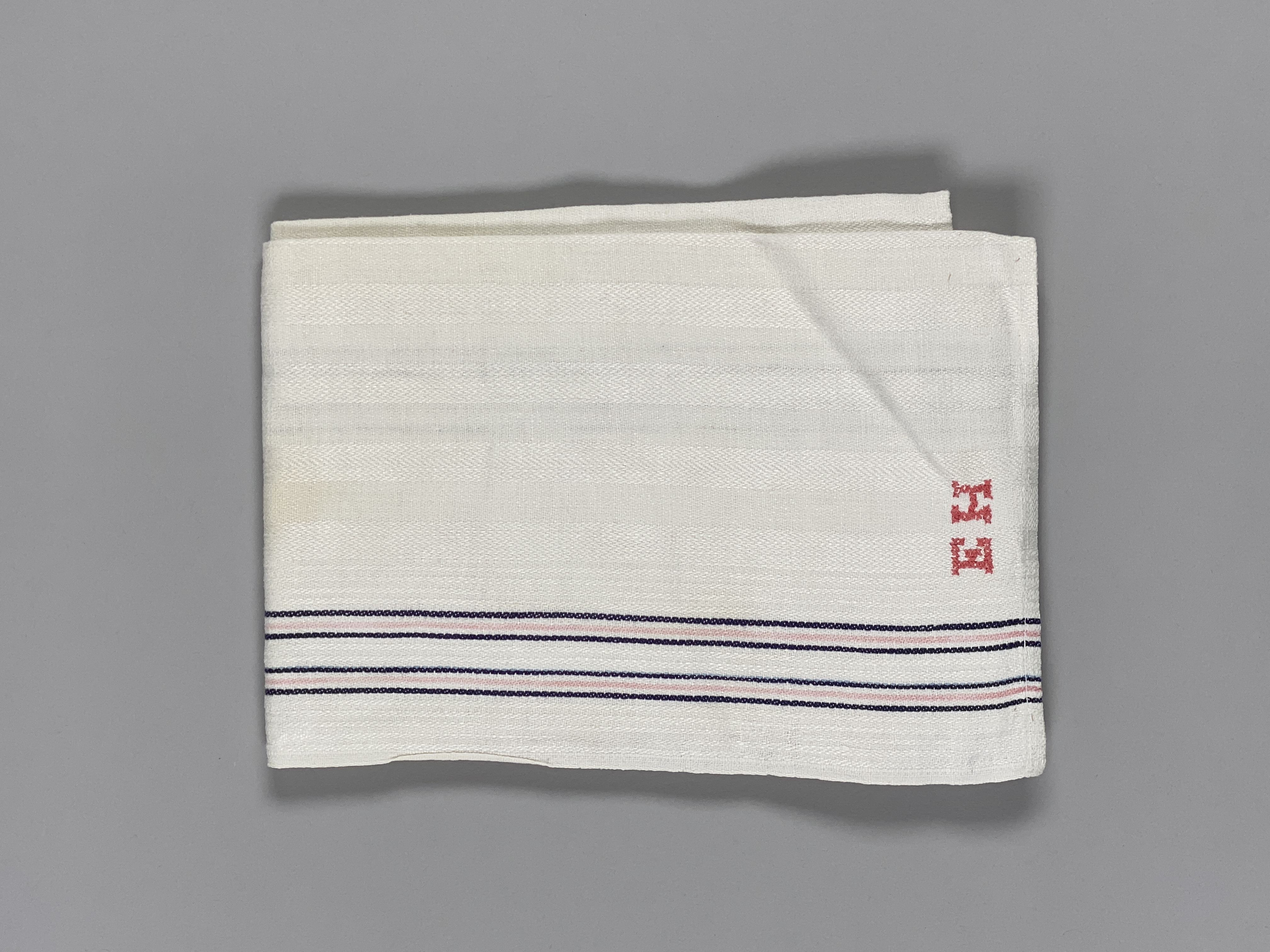 Handduk som medfördes vid Elsbeth Israels flykt till Sverige 1939. Handduken är vävd i bomull med blå och rosa linjer på långsidorna. I nedre hörnet finns initialerna EH (Elsbeth Hess) broderade.