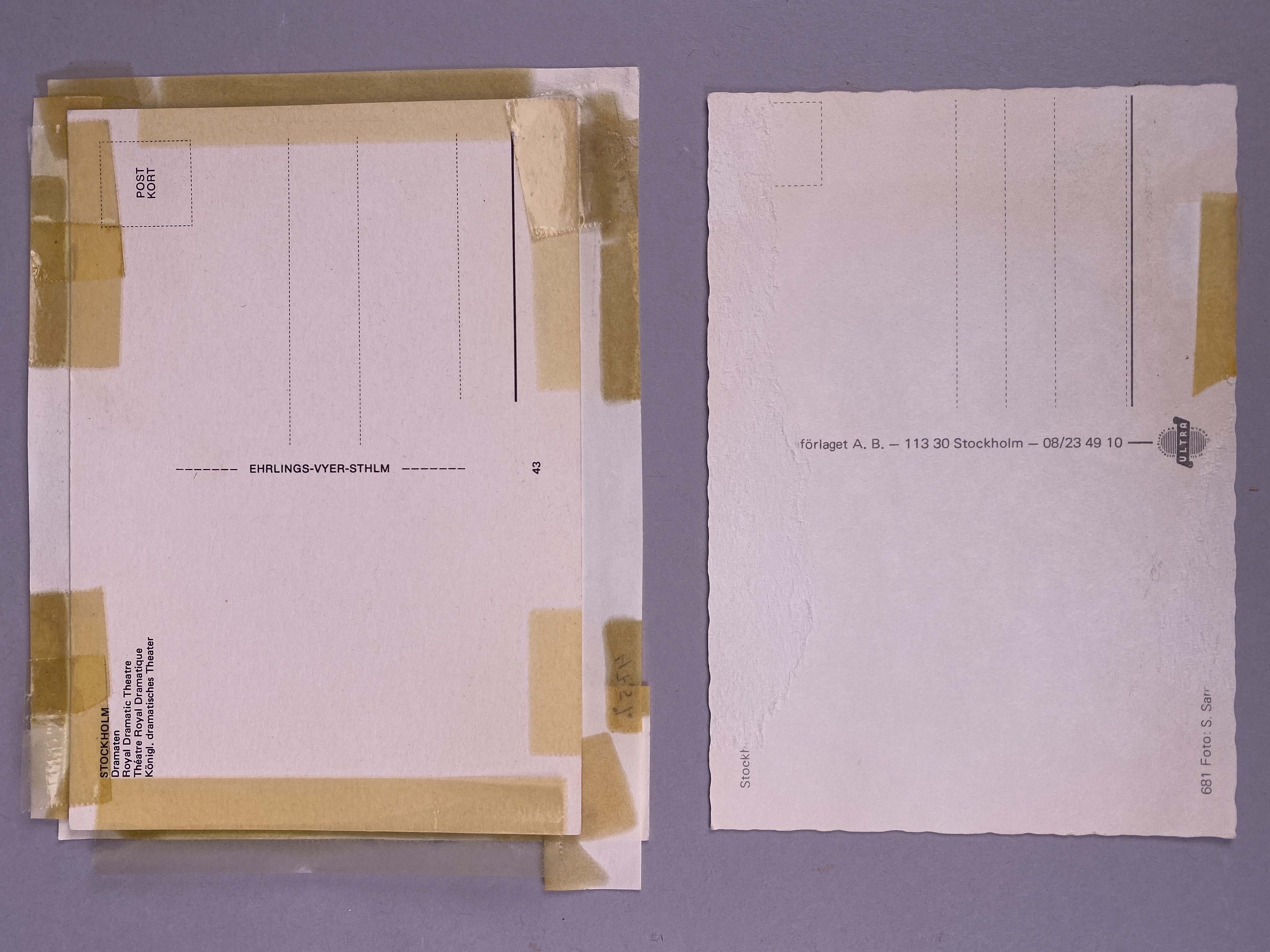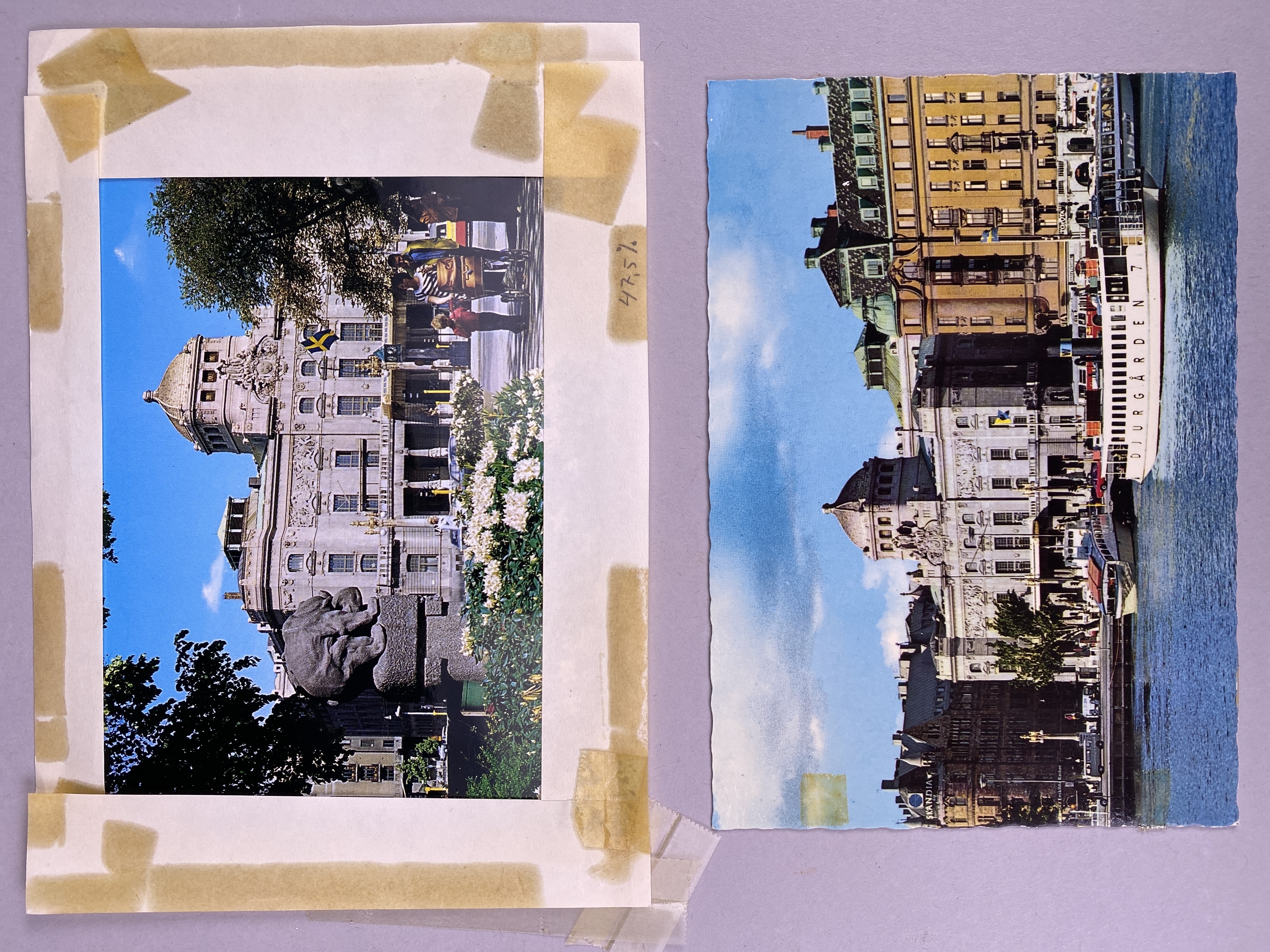 Två vykort: Dramaten, Stockholm. Ett med ram av tunt papper (faller isär). Vykorten användes i tillverkning av lotterisedlar hörande dragningen som ägde rum den 10 april 1979 (jfr. provtryck 3145071).
