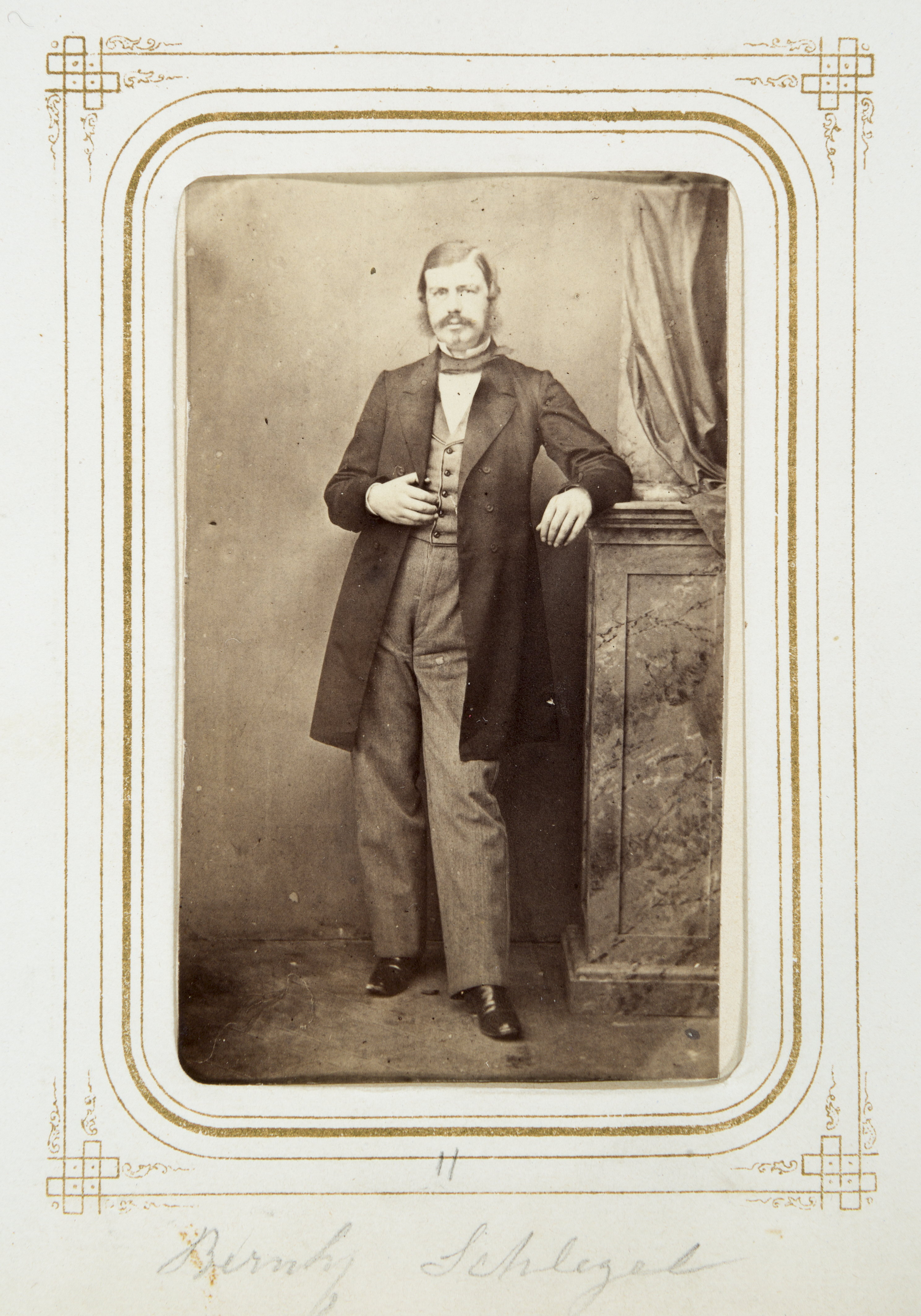 Biografi. Fotografiporträtt. 101 porträtt i album. BERNHARD SCHLEGEL. Erhållet av Johanna Kempe, f. Wallis på 1860-talet.26,5x20,7x4 cm. Wilhelminas kusin.