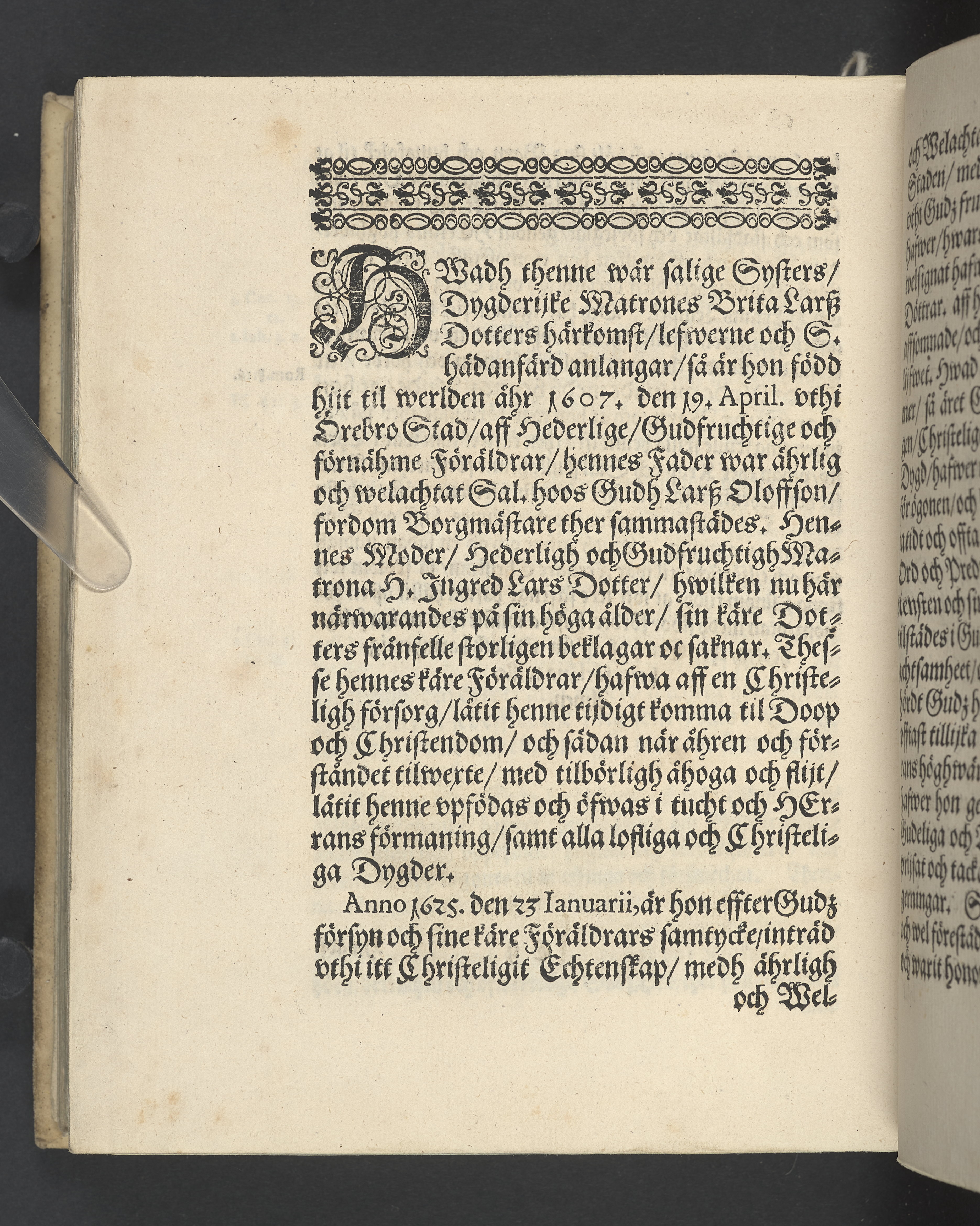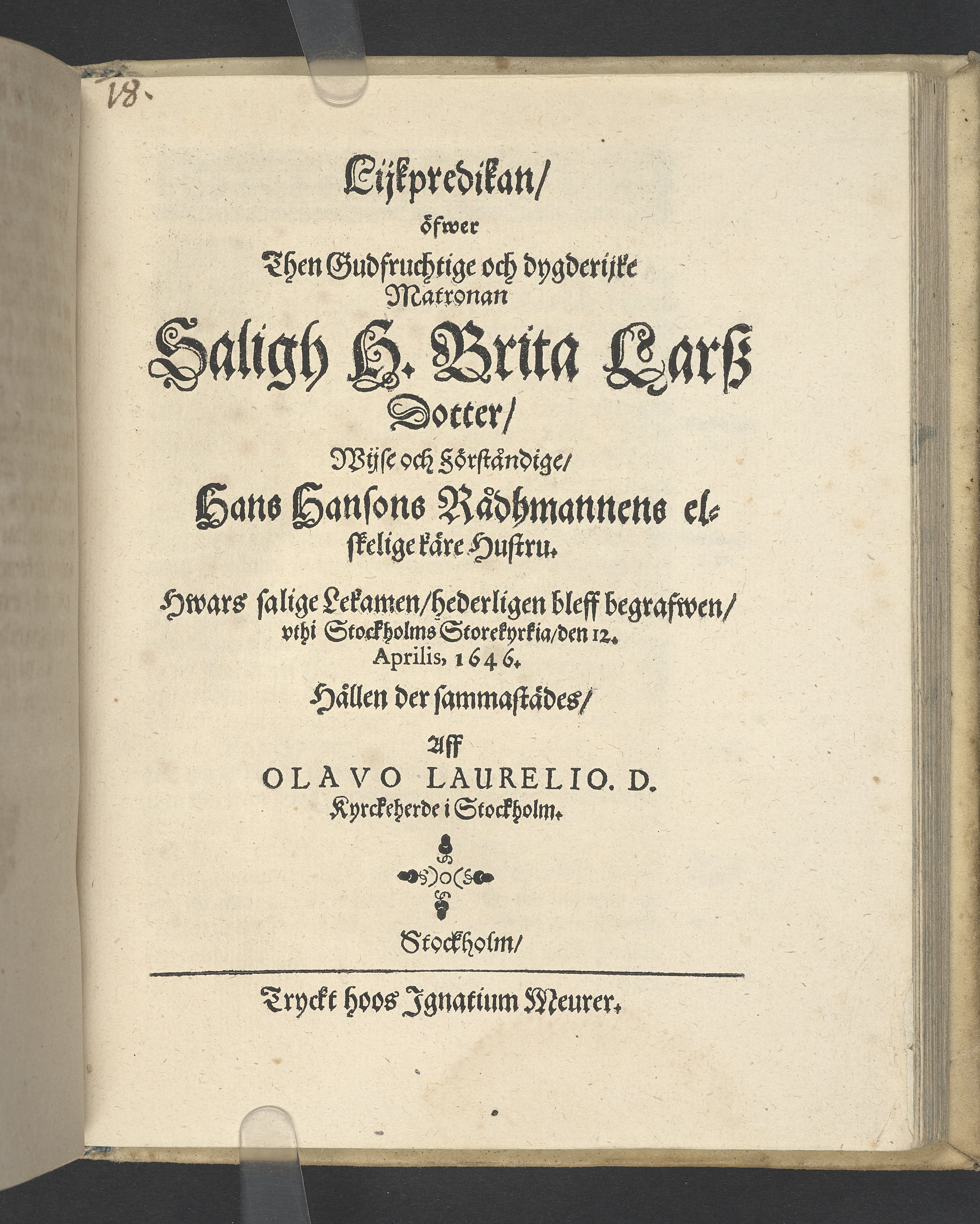 Lijkredikan öfwer... H. Brita Larsz Dotter... Hans Hansons rådmannens... hustru... begrafwen, uthi Stockholms Storekyrkia, den 12. aprilis, 1646... Tryckt hoos Ignatium Meurer.
