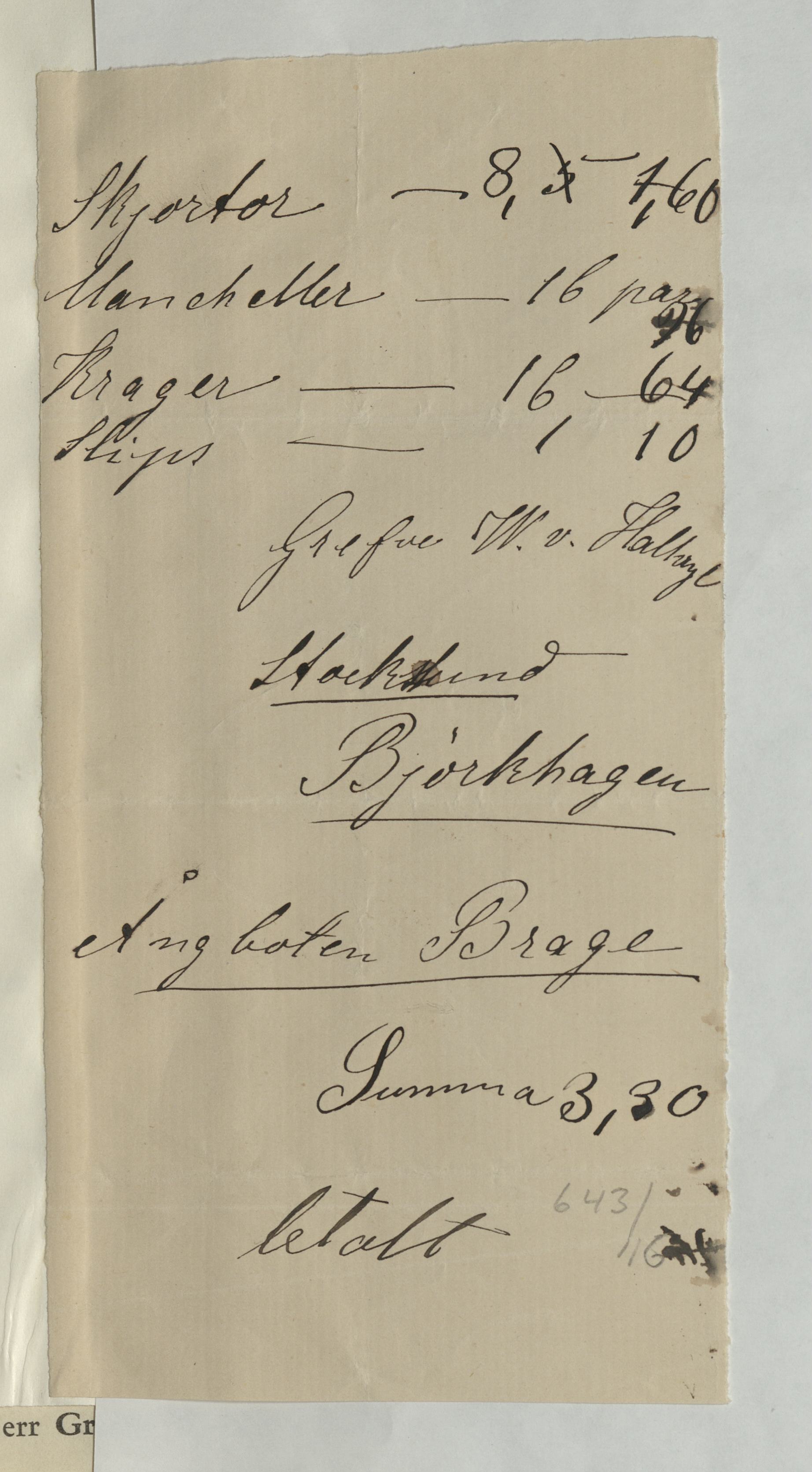 Kvitto från Fru Pettersson, Skjorttvätt, för bl a skjortor, manchetter, kragar. 3:30Kr betald av Greve Hallwyl. Odat.