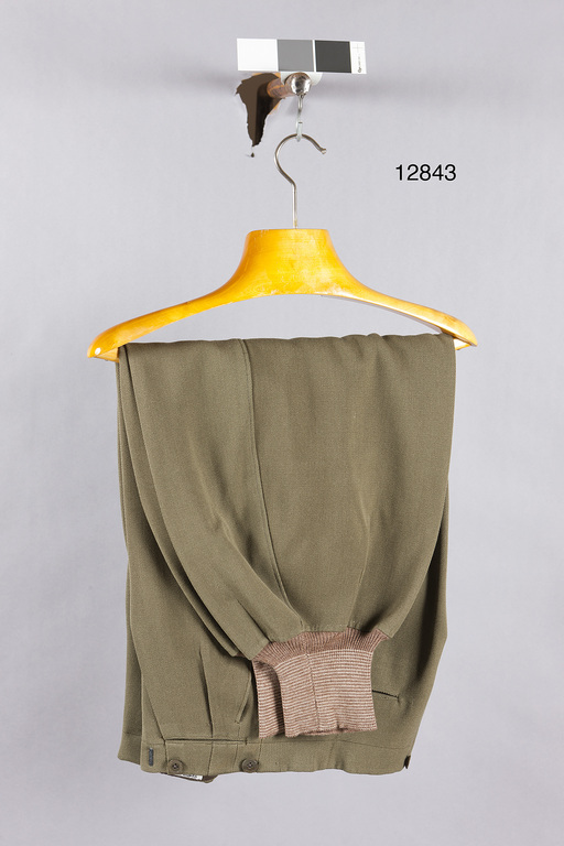Knäbyxor av grön yllediagonal med resårstickning nedtill. Gylf med dold knäppning, sex knappar på ena sidan och en på knapphålssidan. Knapparna plana, av ljusbrun plast, d: 14 mm. Upptill hake och hyska, märkta: " SOLIDE " och " EINGETRAGEN ". Vid linningen sex skålformiga plastknappar, bruna med på utsida firmamärke: " NORDISKA KOMPANIET STOCKHOLM ", d: 17 mm. Liten stolpficka upptill, två sidsömsfickor. Två stolpfickor bak, med en brun, skålformig knapp var, d: 14 mm, och knapphål. Nedtill på byxorna en stickning med längsgående söm, brun med vita horisontella ränder av gummitråd, l: 120 mm, vidd nedtill 220 mm. Linningsfoder av rödbrun sidendiagonal. Fickfoder av mörkröd bomullstuskaft. Tygögla baktill. I linningen framtill till v. en slejf av röd bomullstuskaft, med knapphål.