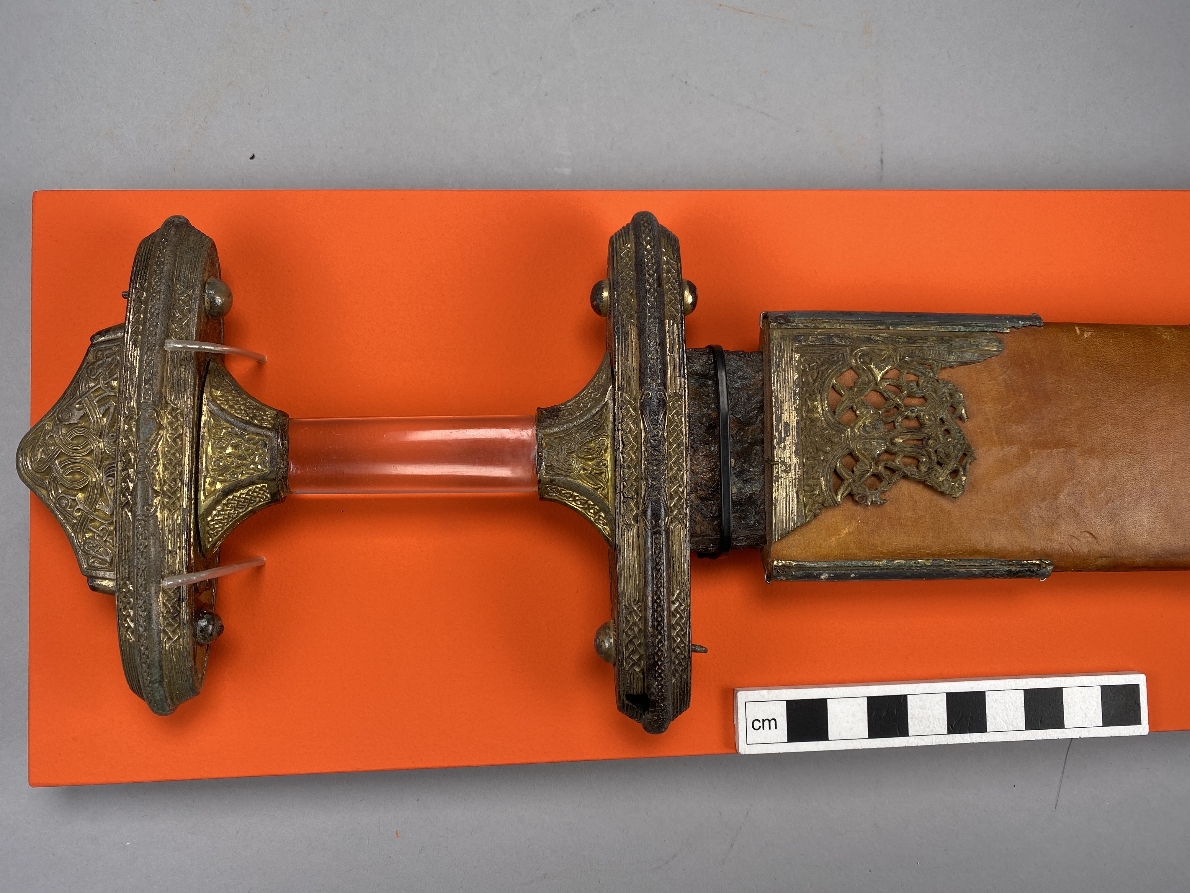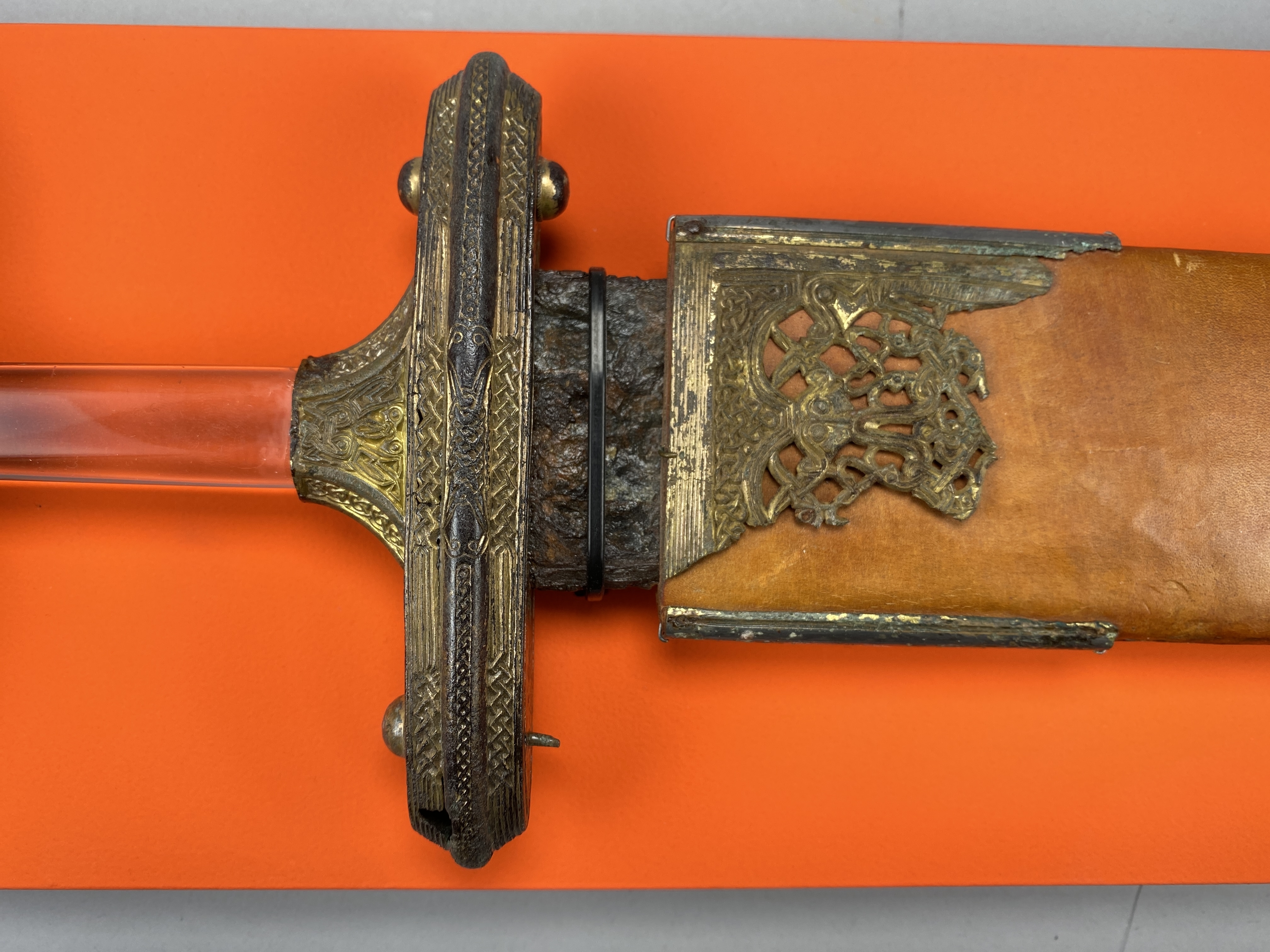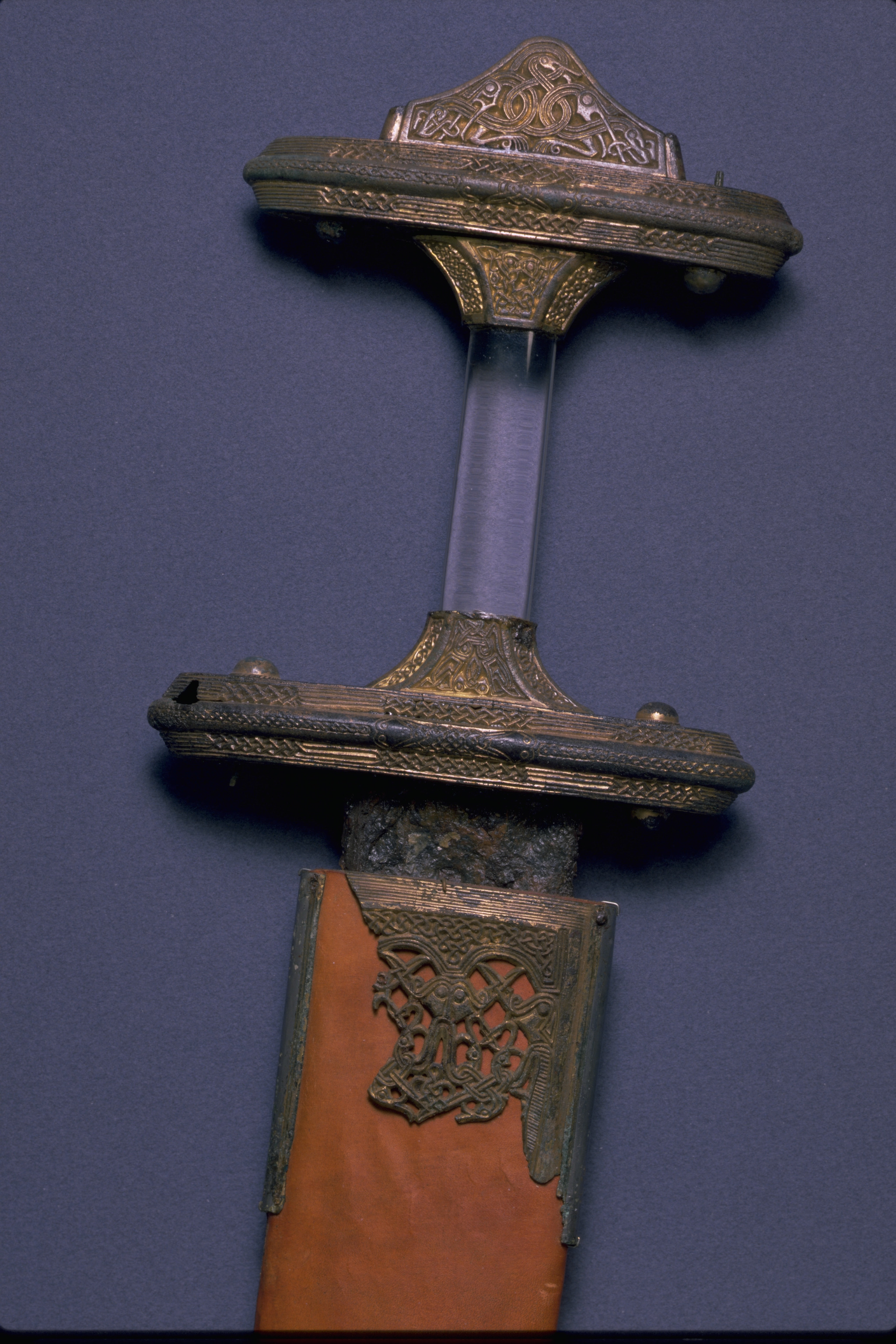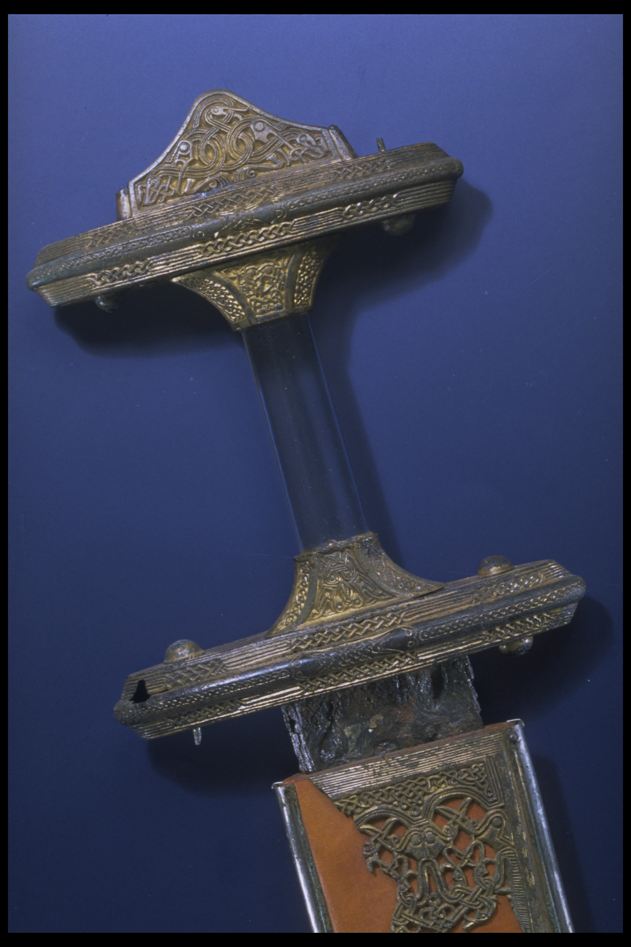 Tveeggat svärd i rekonstruerad skida som är avbruten. Har beslag längs sidorna och mot fästet. Parerstång och knapp är bevarade men inte tången. Fästet är av brons och praktfullt, en bit av slidan är även den av brons och är ornerade med drak- och slingsirater. Fästet är brutet i tre delar. Små långa kannelerade beslag har omfattat skidans kanter. Svärdsskidan är rekonstruerad.