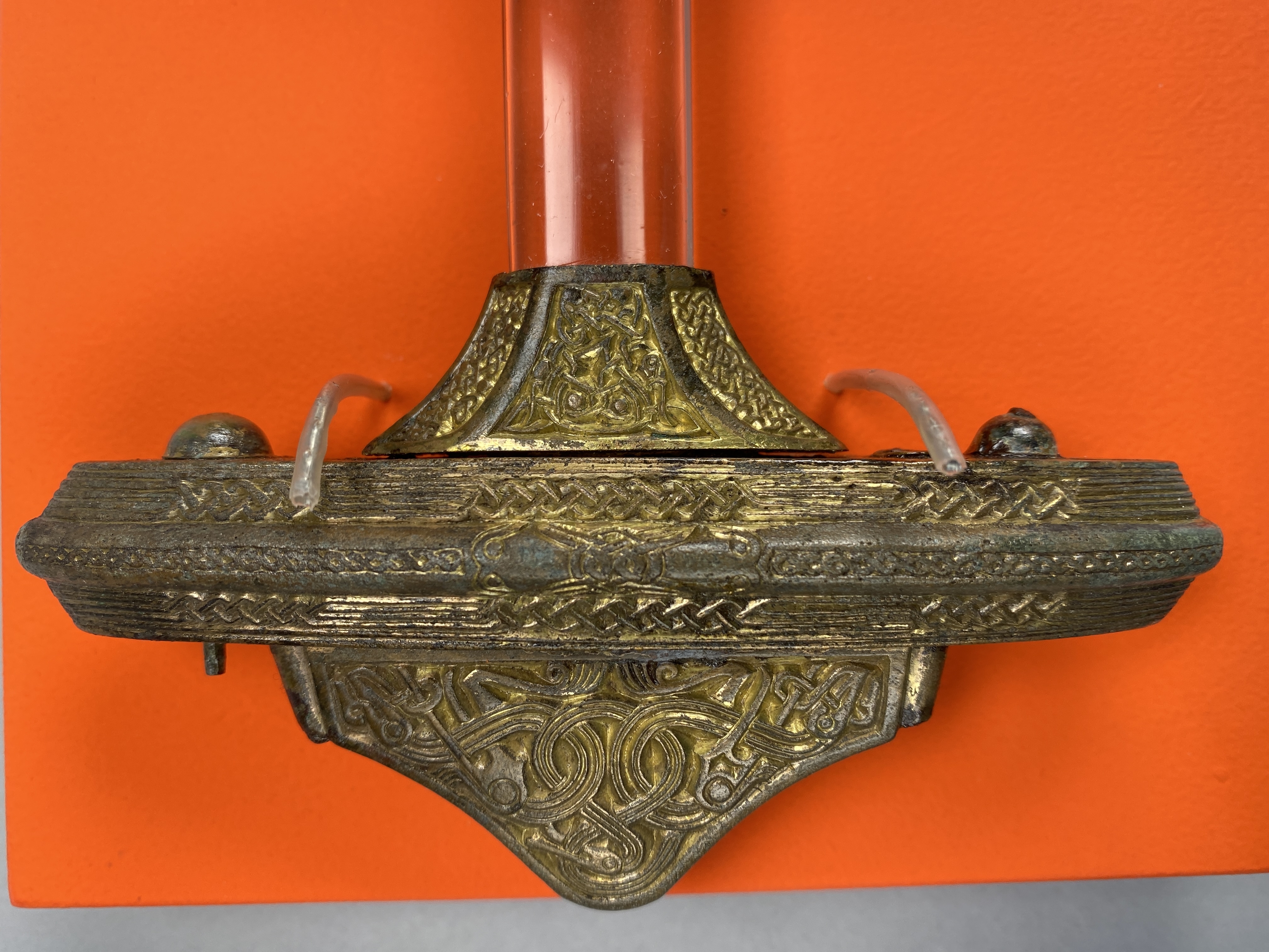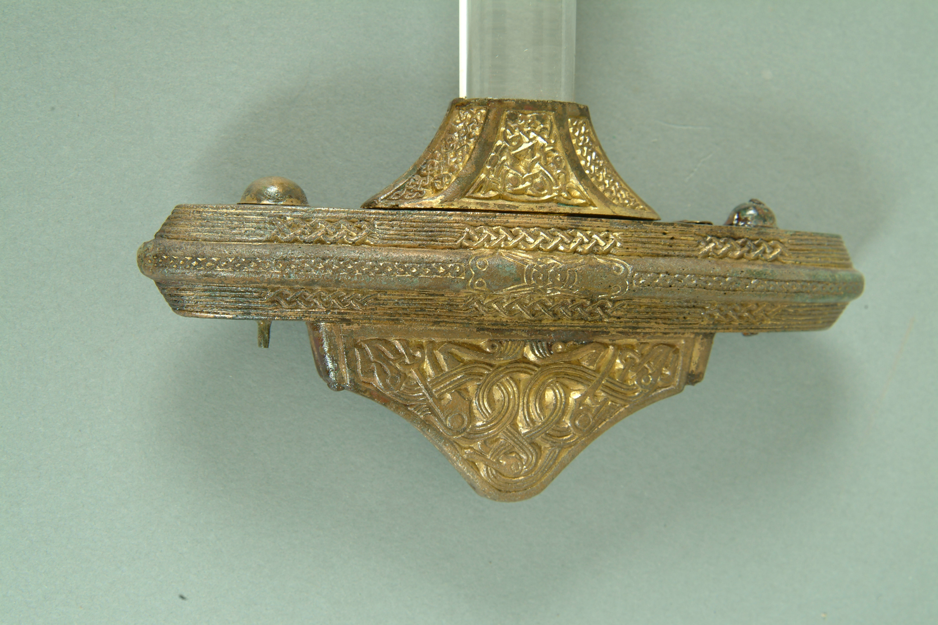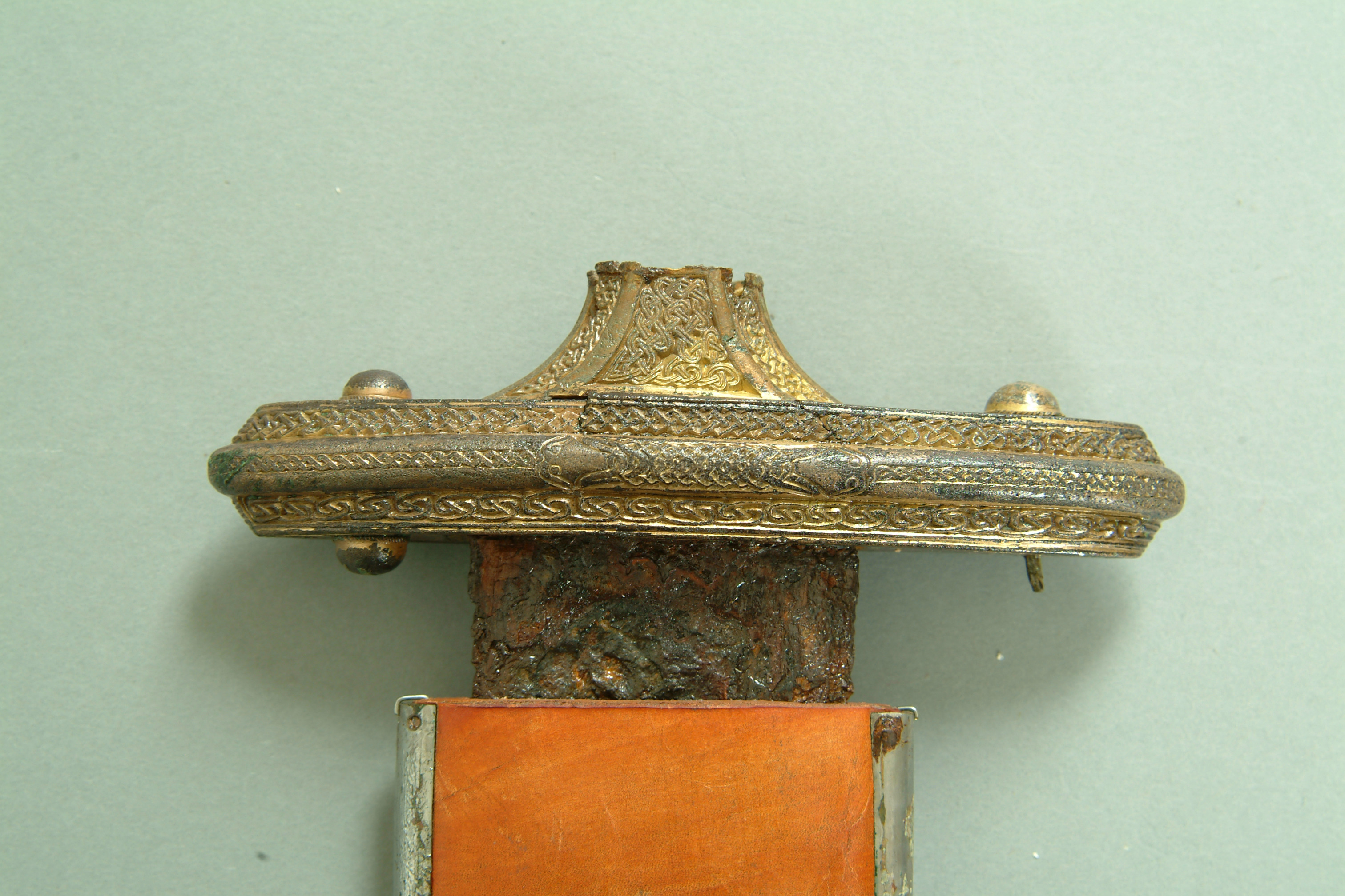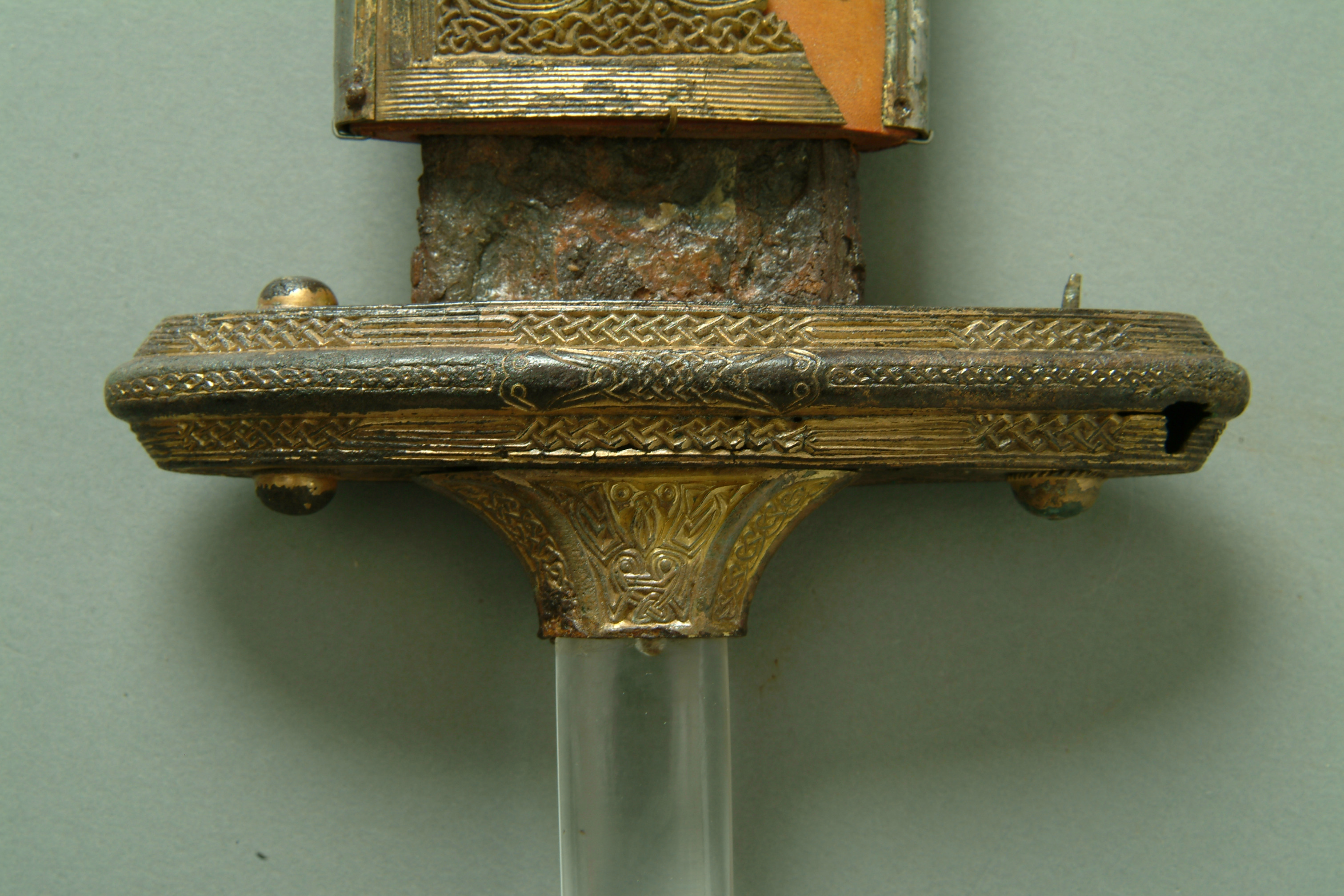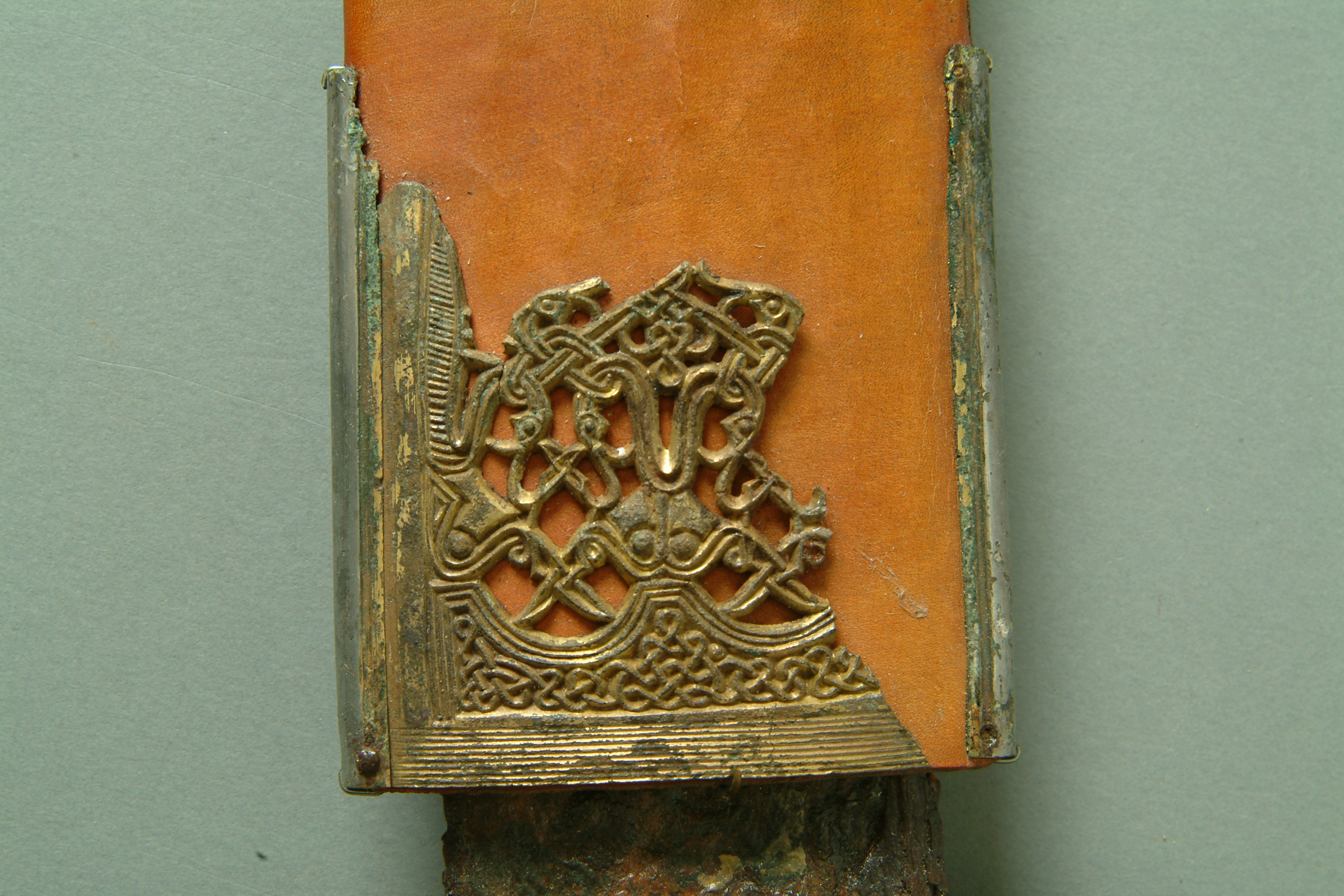 Tveeggat svärd i rekonstruerad skida som är avbruten. Har beslag längs sidorna och mot fästet. Parerstång och knapp är bevarade men inte tången. Fästet är av brons och praktfullt, en bit av slidan är även den av brons och är ornerade med drak- och slingsirater. Fästet är brutet i tre delar. Små långa kannelerade beslag har omfattat skidans kanter. Svärdsskidan är rekonstruerad.