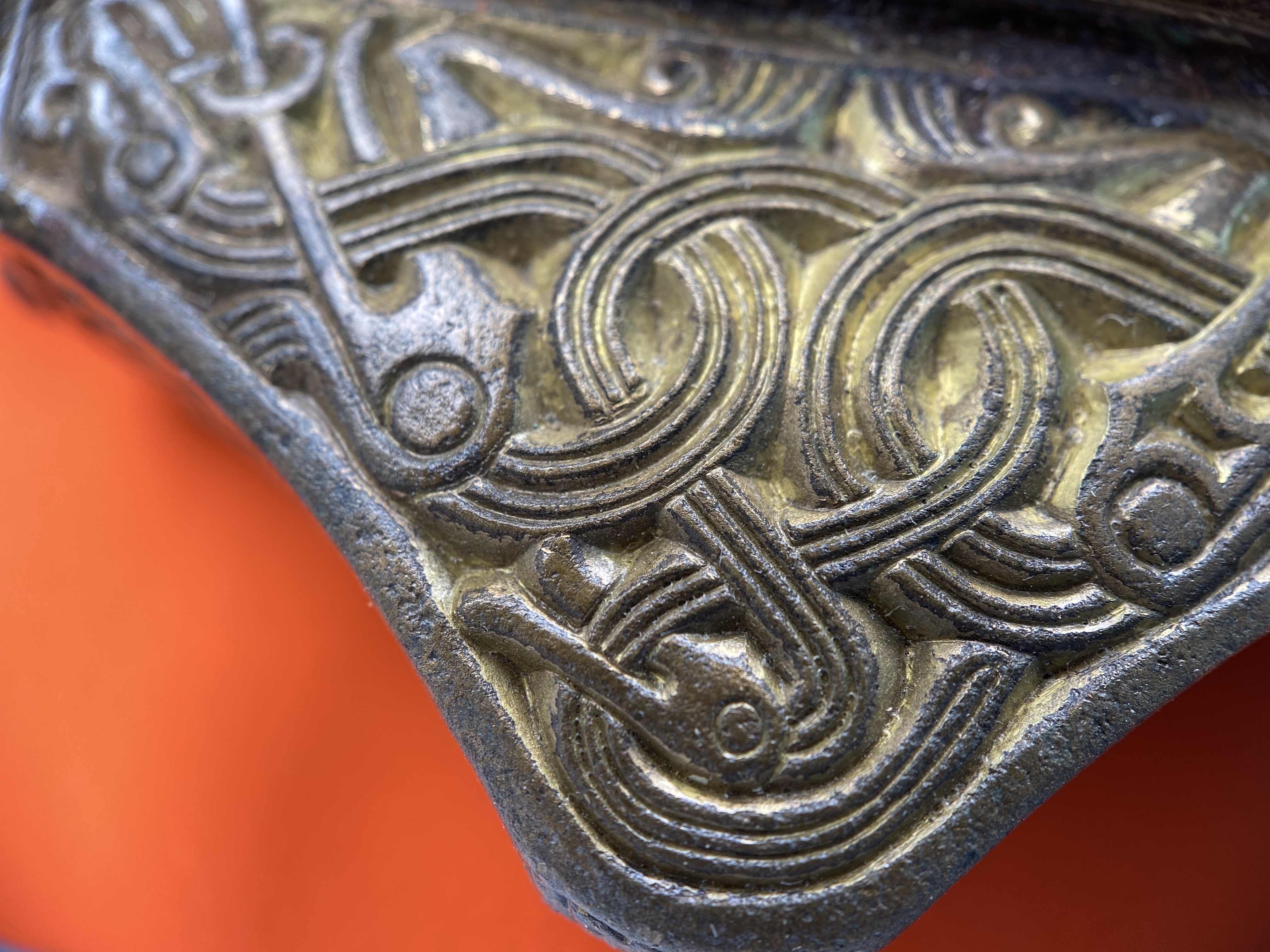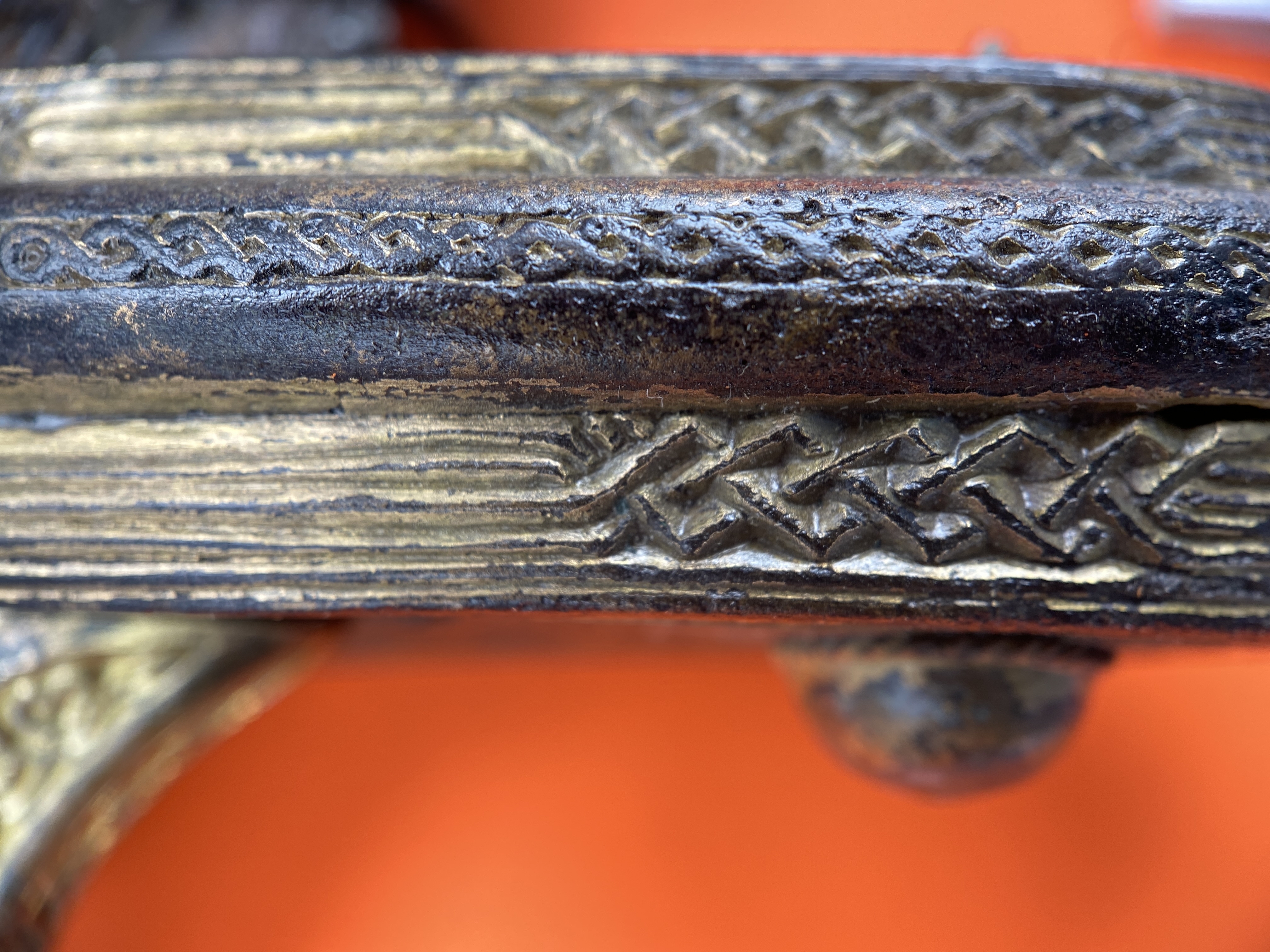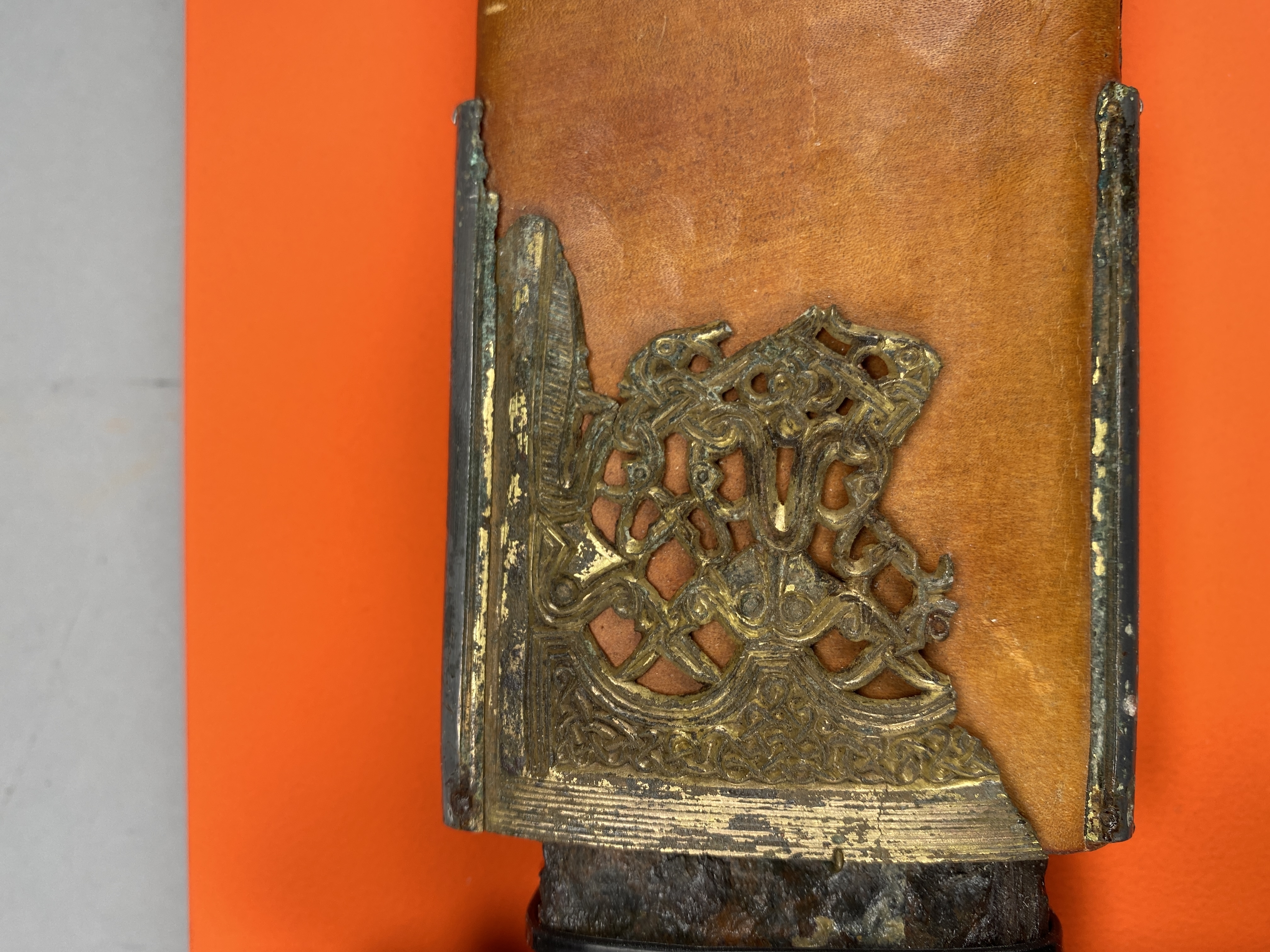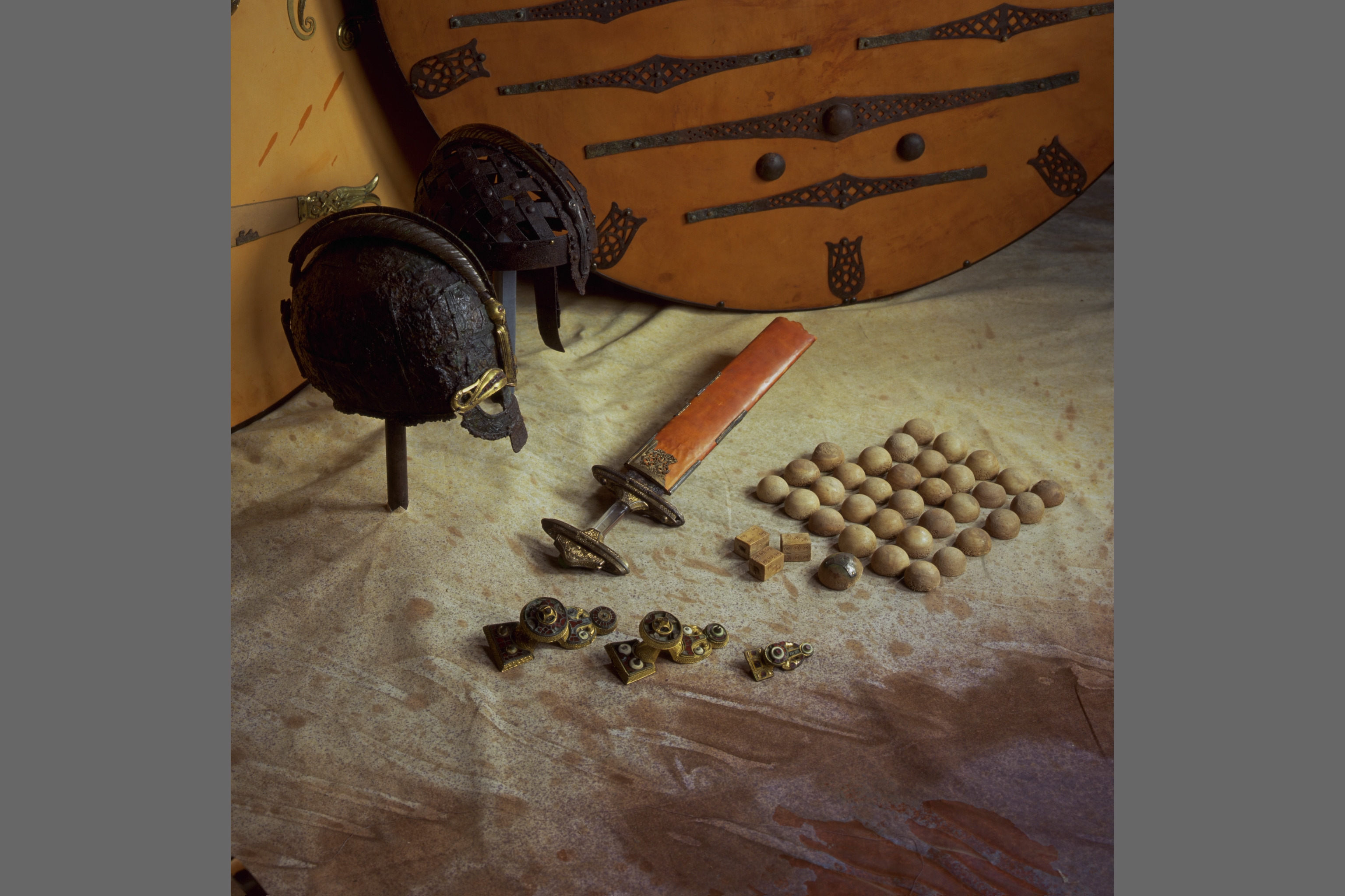 Tveeggat svärd i rekonstruerad skida som är avbruten. Har beslag längs sidorna och mot fästet. Parerstång och knapp är bevarade men inte tången. Fästet är av brons och praktfullt, en bit av slidan är även den av brons och är ornerade med drak- och slingsirater. Fästet är brutet i tre delar. Små långa kannelerade beslag har omfattat skidans kanter. Svärdsskidan är rekonstruerad.
