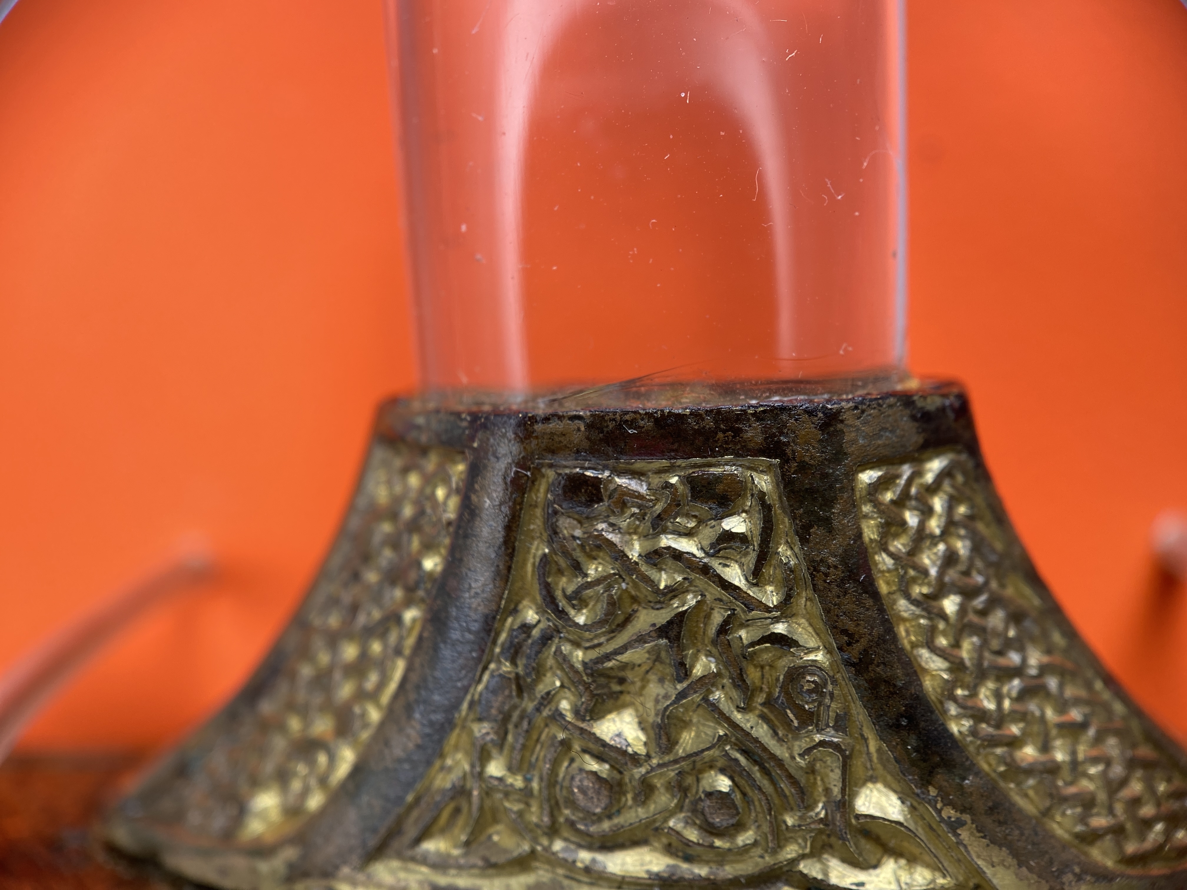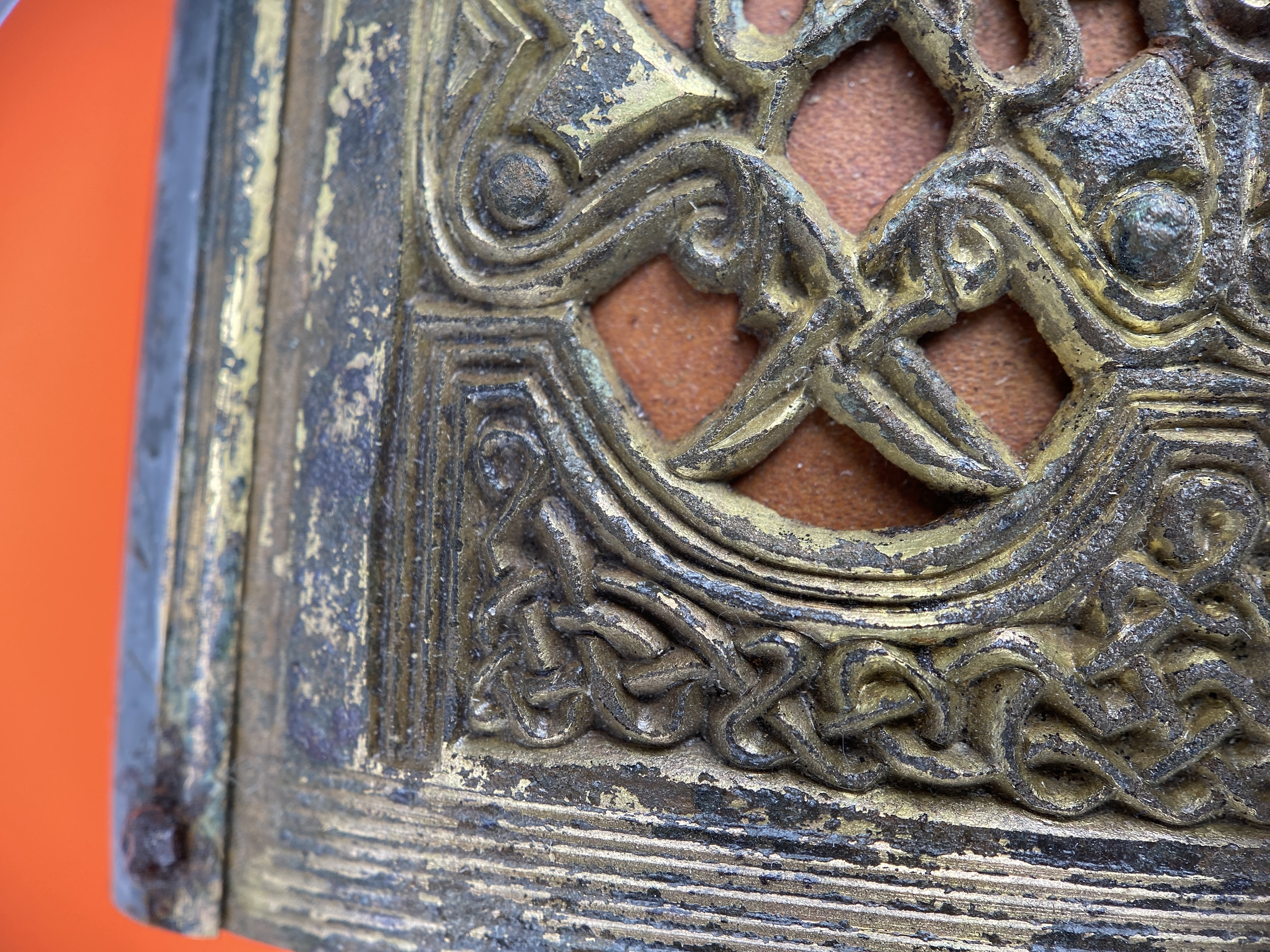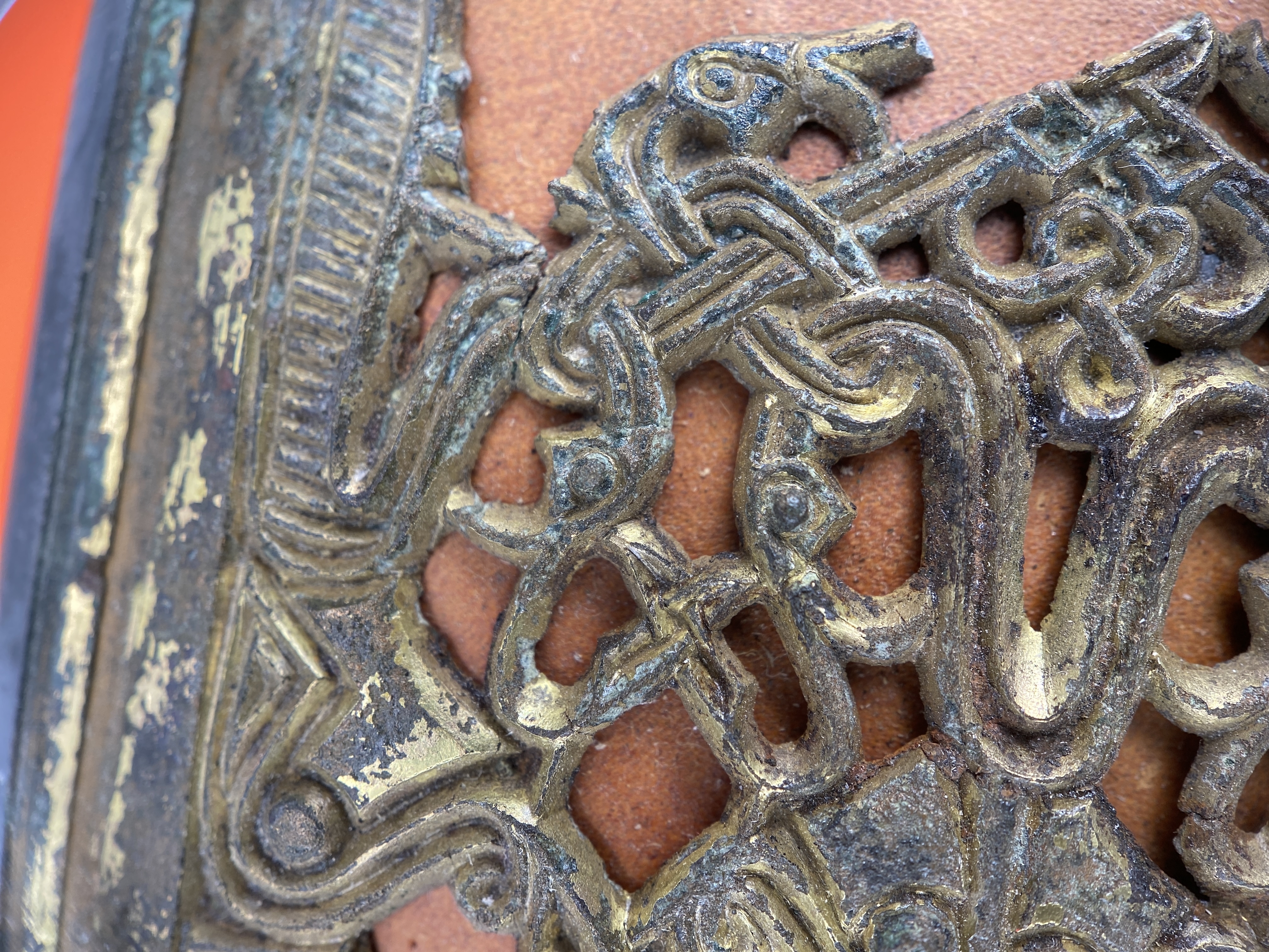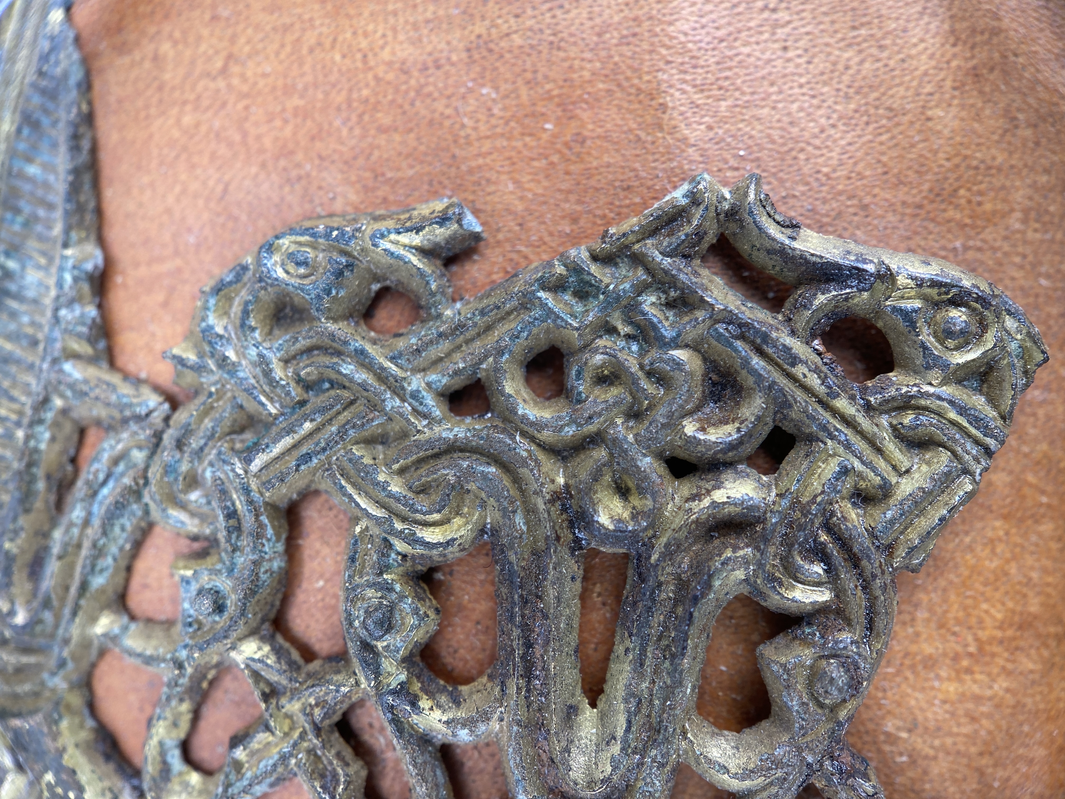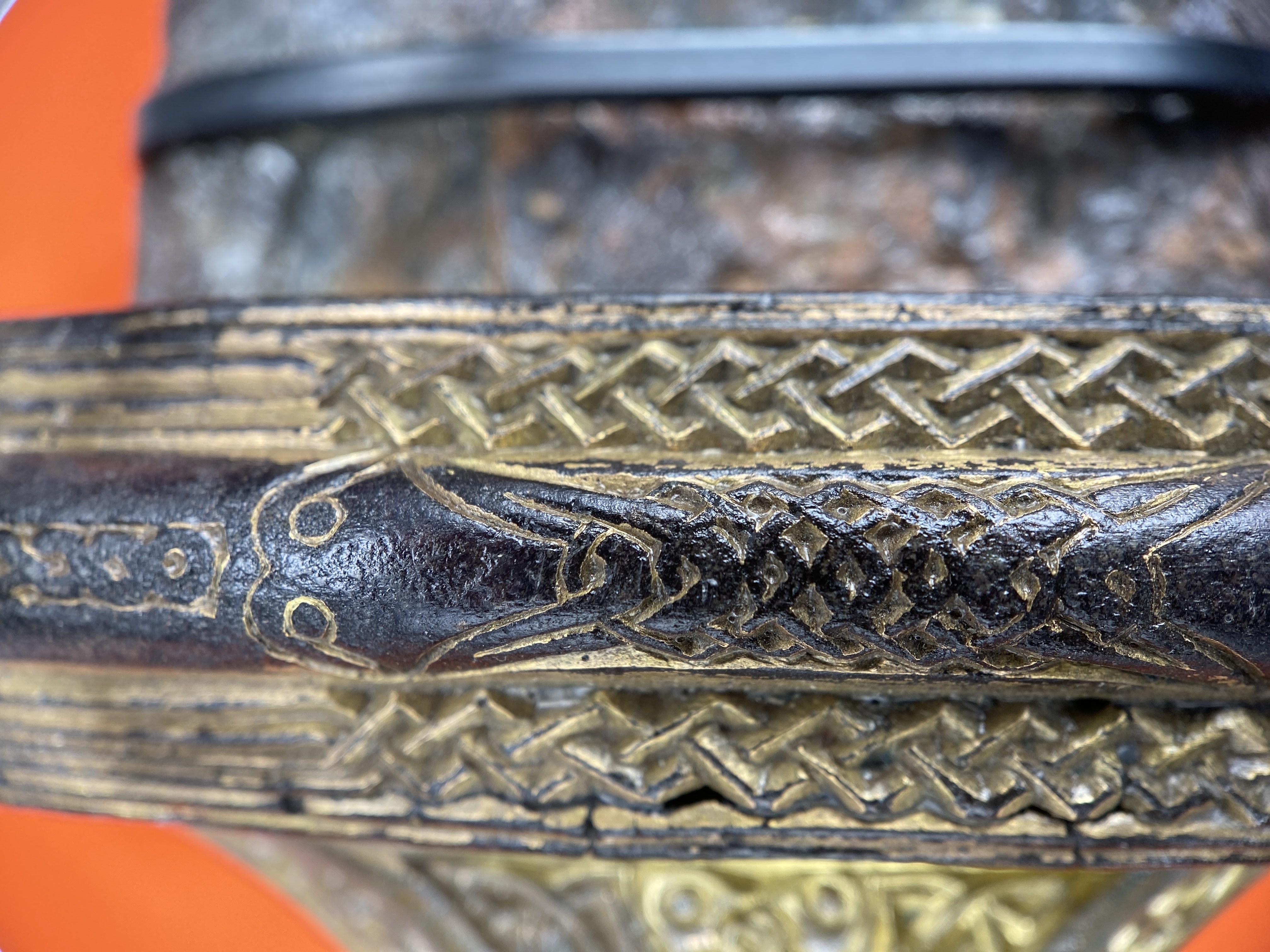 Tveeggat svärd i rekonstruerad skida som är avbruten. Har beslag längs sidorna och mot fästet. Parerstång och knapp är bevarade men inte tången. Fästet är av brons och praktfullt, en bit av slidan är även den av brons och är ornerade med drak- och slingsirater. Fästet är brutet i tre delar. Små långa kannelerade beslag har omfattat skidans kanter. Svärdsskidan är rekonstruerad.