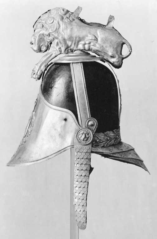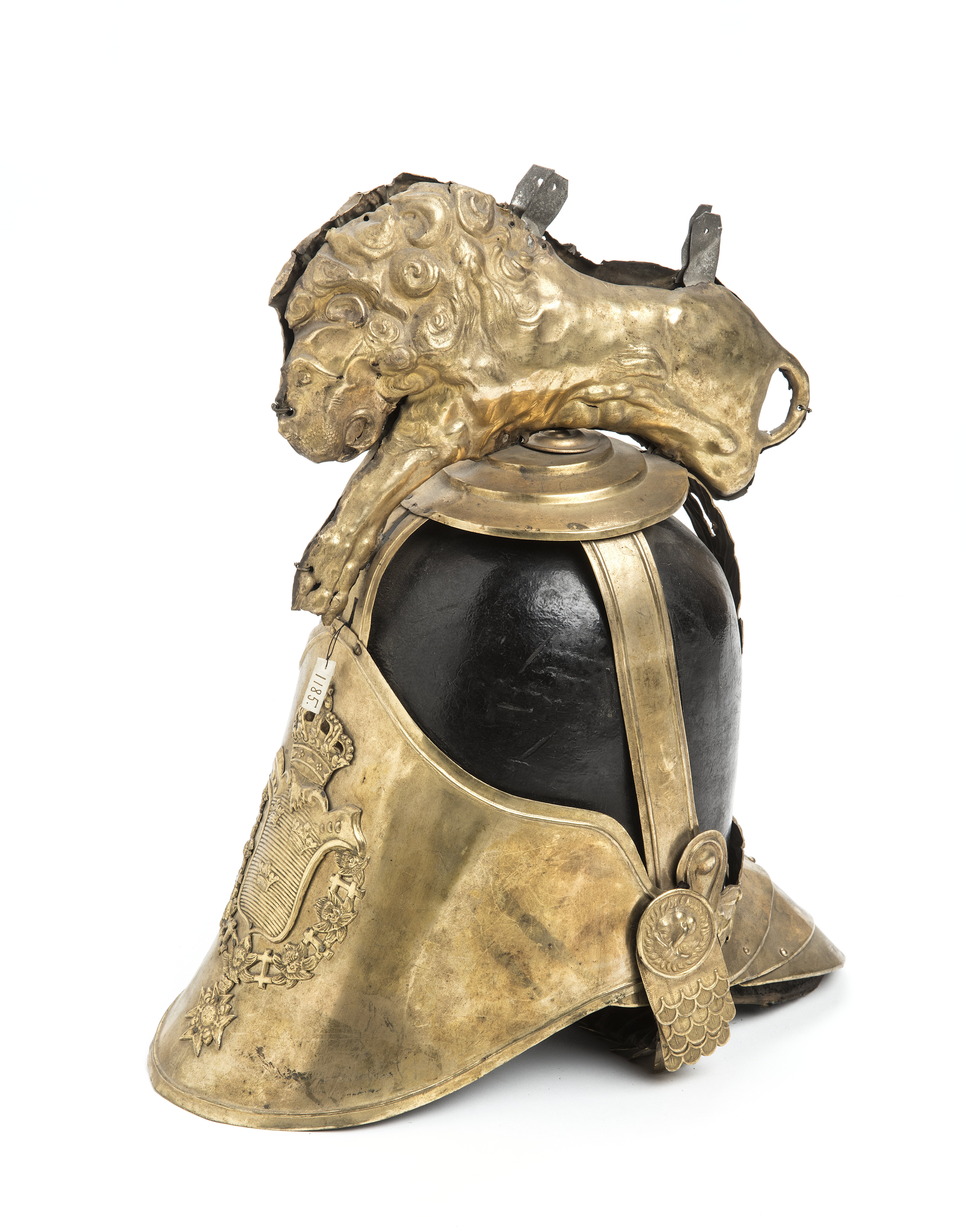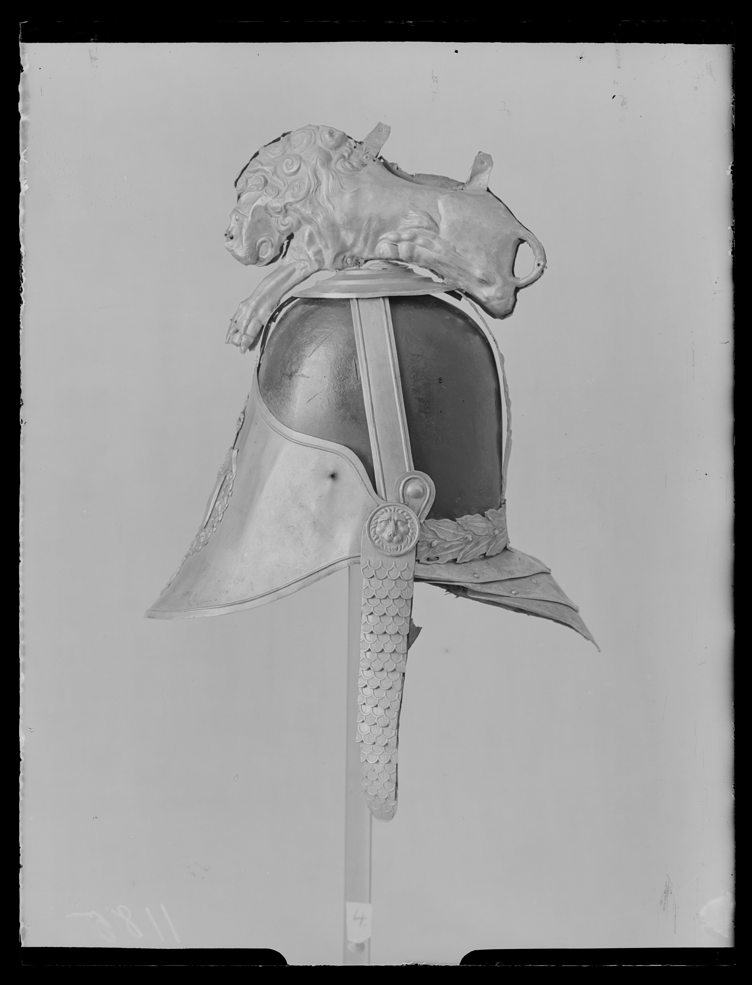 Kask för Livdrabantkåren. Kask av svartlackerat läder med beslag av förgylld mässing. På framplåten finns fäst Riksvapnet med en krönt sköld med tre kronor inom serafimerordens kedja med ordenskors. Mellan byglarna på kronan som kröner skölden syns textil, nu beige. Kasken har en kam i form av ett lejon med lockig man. Lejonet är sammansatt av två delar av plåt med mönstret pressat i relief. Lejonet ligger med framsträckta framben och bakbenen uppdragna mot kroppen. Baktill på kasken finns en tredelad nackplåt. Fyra byglar går från kaskens nederkant till dess topp där de hålls samman av en rundel i tre avdelningar (ca. 11,5 cm i diameter), varpå lejonet vilar. Bygeln baktill (ca. 3,4 cm bred), liksom ett band längs kaskens nederkant baktill, har inpressad dekor i form av parvis ställda lagerblad och bär. Övriga tre byglar är släta med en upphöjd rand i var sida. Hakrem med fjällformade beslag, bredast upptill (ca. 3,6 cm) och avsmalnande nedåt (ca. 2,7 cm). Remmen har foder av brun sammet och med ett brunt knytband påsytt i änden. Ett runt beslag dekorerat med ett lejonhuvud (ca. 3,2 cm i diameter), finns där hakremmen är fastsatt. På vänster sida saknas hakremmen liksom det runda beslaget. Foder/innerhuva av brunt tunt läder. Huvan är öppen på hjässan, avslutad med flikar, i var flik finns ett hål och ett band är genomdraget, med bandet regleras vidden/storleken. Skärm och bakstycke har foder av blått siden. Längs kaskens nederkant är sytt ett svart band. Jämför med Armemuseum inv.nr 13154 och 70521; beslag av förgylld mässing, likadana som Lrk inv.nr 22205-08, 22351-68 och 28493.