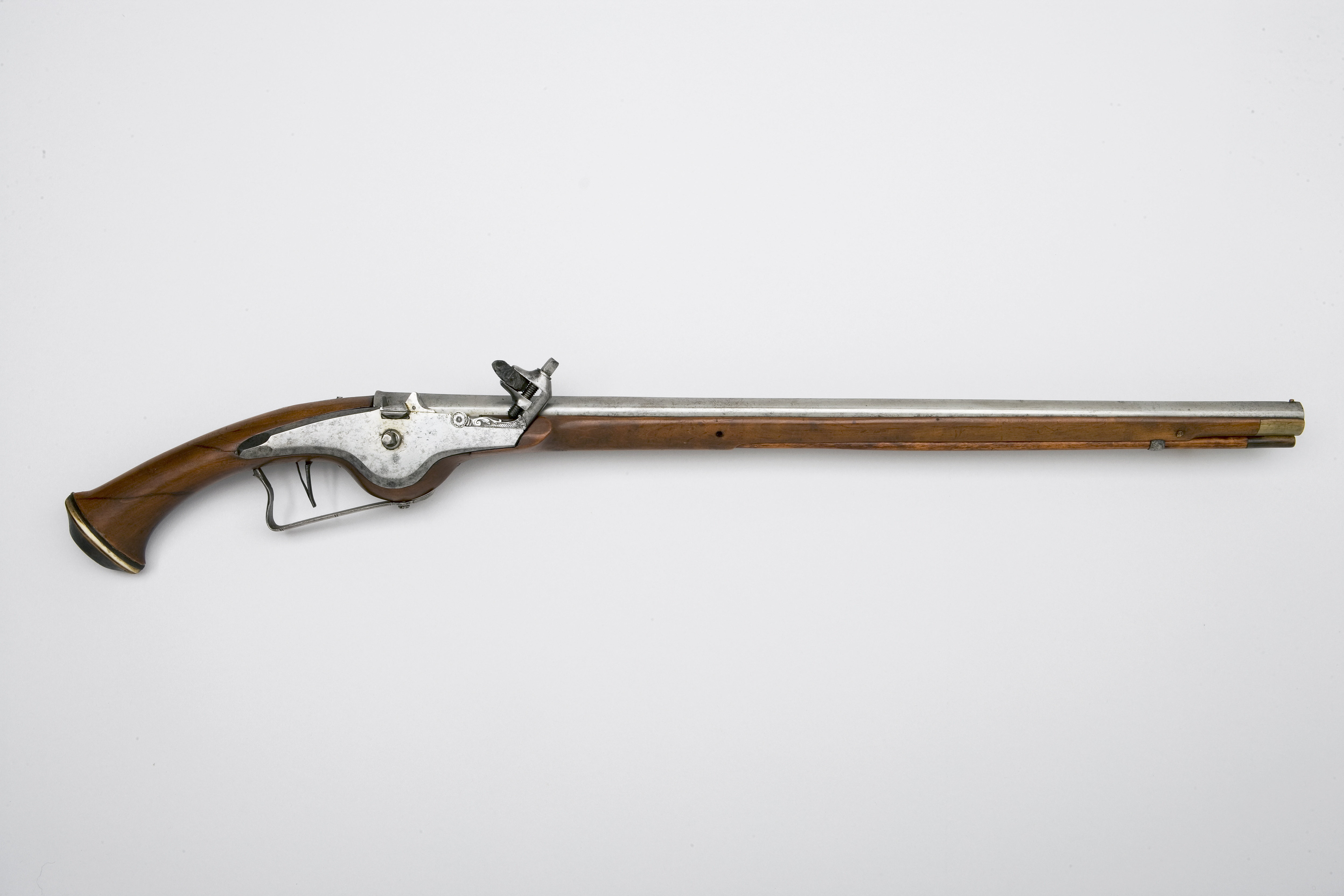 Rund pipa med svinrygg, lopp med 8 räfflor och plana blommar. Rektangulärt, svagt böjt svansskruvblad, bakre hälften avsmalnande till en smal spets. Fästning: Två häften, pipan ursprungligen fäst med krysskruv underifrån samt två pipstift av trä. Hjullås av västeuropeisk typ med plant låsbleck och fasade kanter, åsad bakspets. Invändigt hjul. Fängpanna med rundad undersida och rak krutskärm, fängpannelock med högt fingergrepp och rörlig arm. Hane i flykt med låsblecket, kroppen graverad med blad och nätmönster, på axeln en stiliserad blomma, hals med rundad ytterkant. Rektangulära käkar, underkäken lös, käkskruv med fyrsidigt huvud. Invändig hanfjäder, studel ned graverat fågelhuvud, hjulstudel med graverad bladdekor. Fästning: Två låsskruvar. Svagt böjd avtryckare med fjäder utgående från nederänden. Helstock av buxbom, nedsvängd i båge under låset. Rund, svagt böjd kolv med till en spetsoval kula vidgad kolvände. Inlagda tvärband av ben och mörkt horn, plan, svartmålad centrumplatta med skålade sidor. En rundad rörka av stål, näsband av horn. Bandformig varbygel med rundad utsida, dekor av dubbla tvärstreck. S-formigt svängd bakstolpe, inskruvad i kolven, framänden fäst med en skruv. Tillbehör: Laddstock av rödbrunt trä, l: 484 mm, framtill skodd med horn, l: 28 mm.