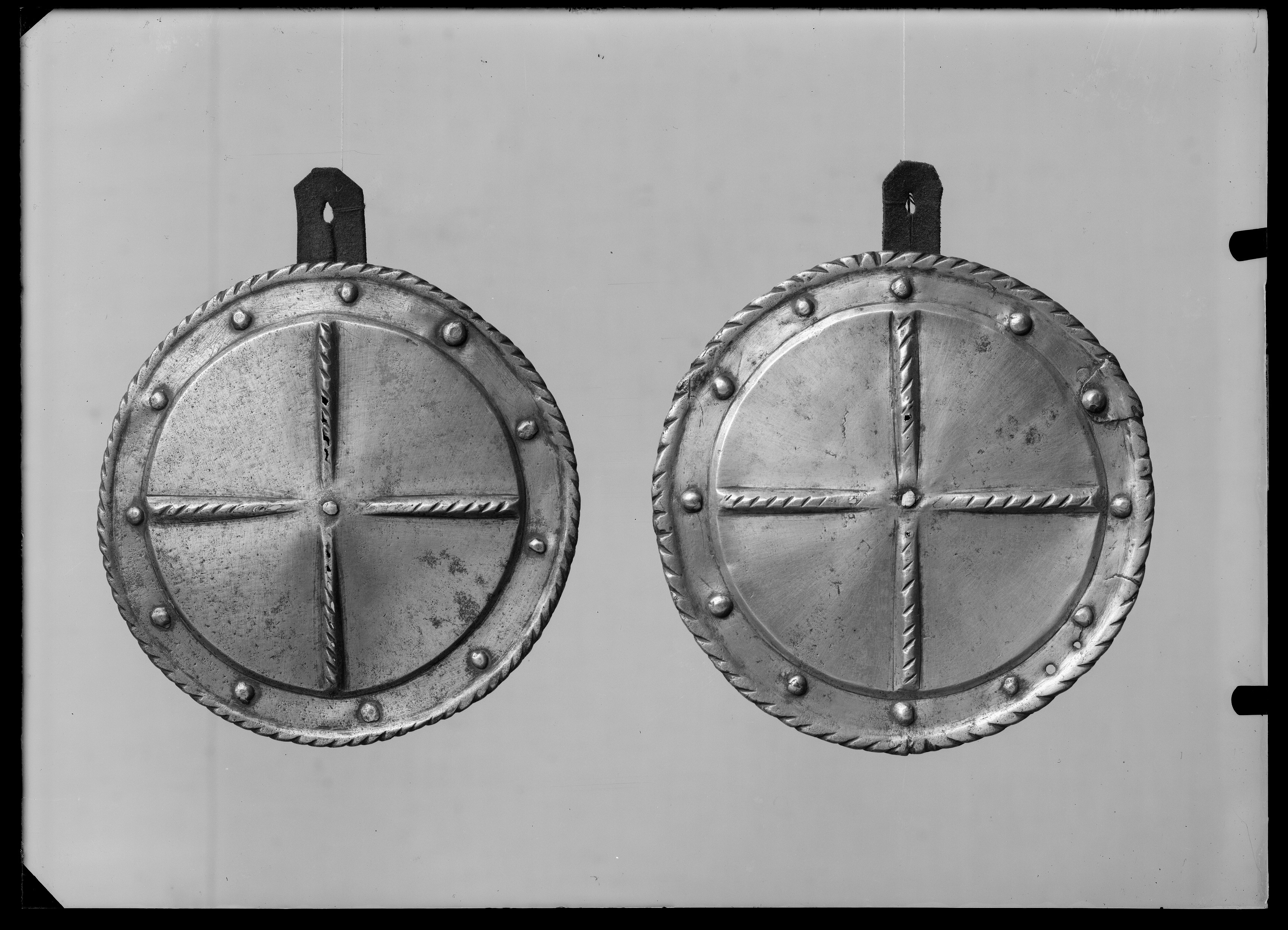 Rondell av stål med fästrem av läder, remmen troligen sentida; driven dekor med en centrerad punkt omgiven av fyra "ekrar" i repmönster, omgivet av elva nitar i en försänkning och ytterst en repdekor.