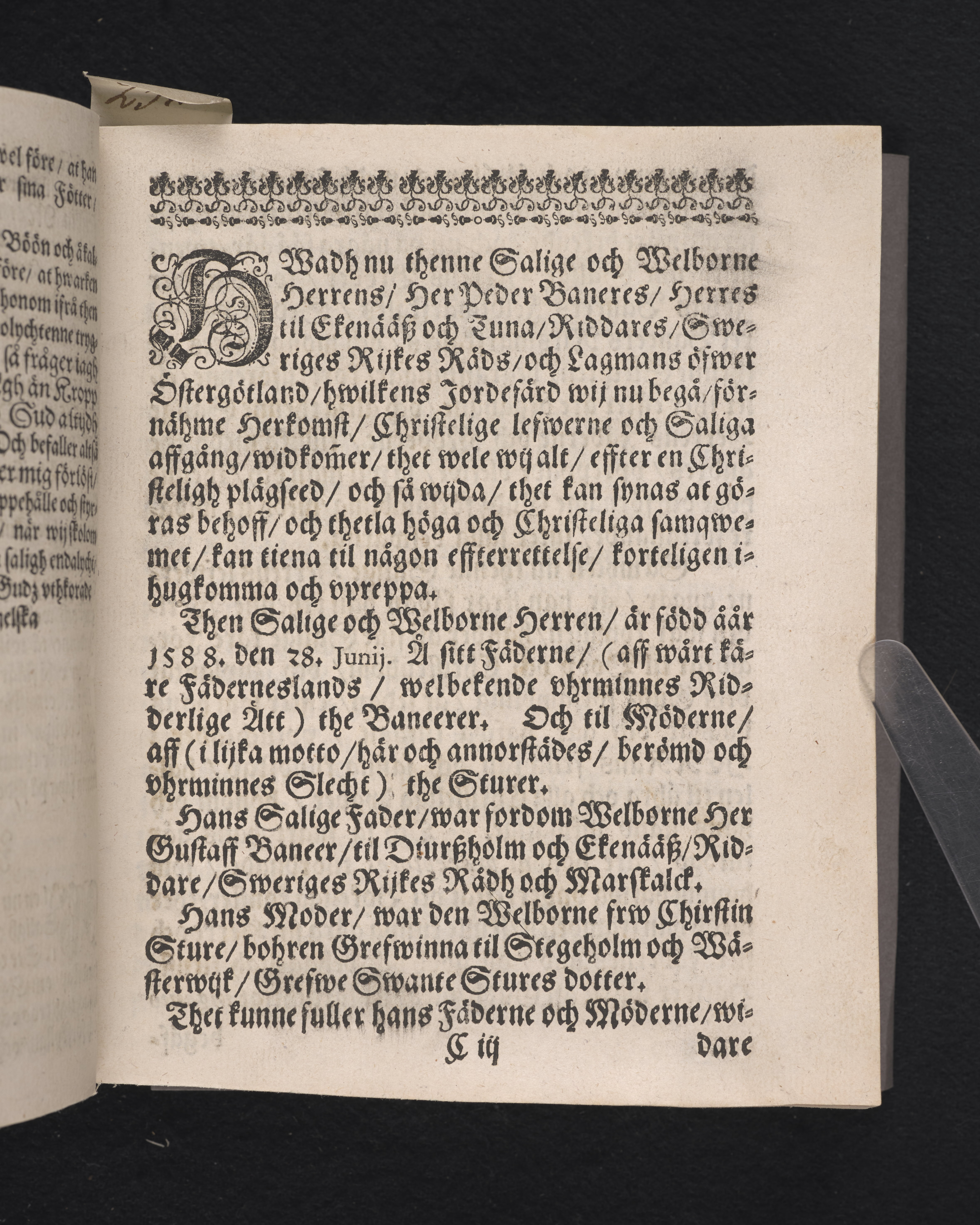 Lijkpredican, öfwer... herr Peder Baneer til Ekenääs och Thuna... Hwars salige lekamen... bleff... nederlagd i sin hwijlokammar, i Stockholms Klosterkyrckia, den 11. augusti 1644. Hållen... aff D. Olavo Laurelio... Stockholm tryckt aff Ignatio Meurer, 1645.