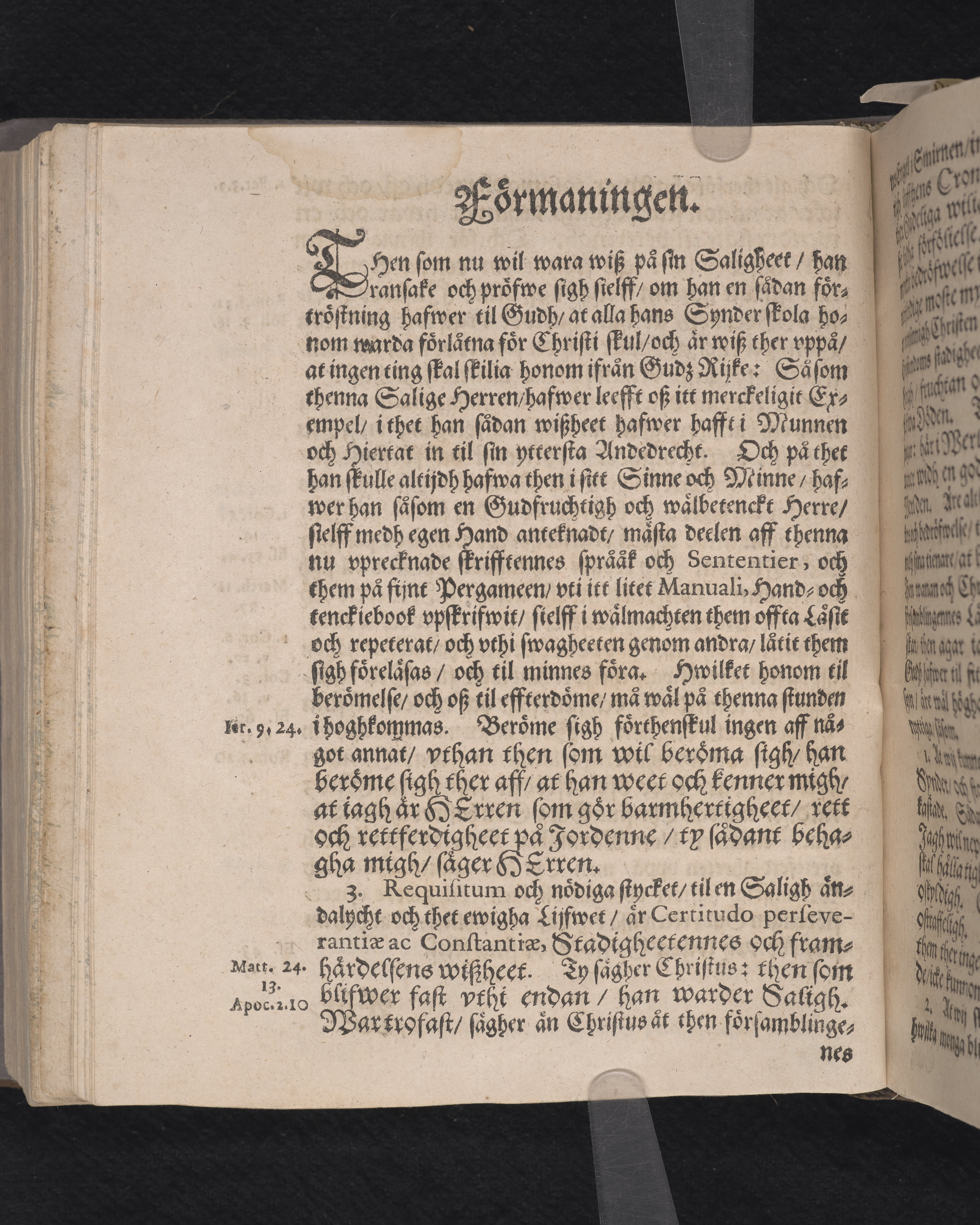 Helskinnsband av svart får, fast rygg. Stickade kapitäl. Snitten skurna, stänkfärgade i blått.