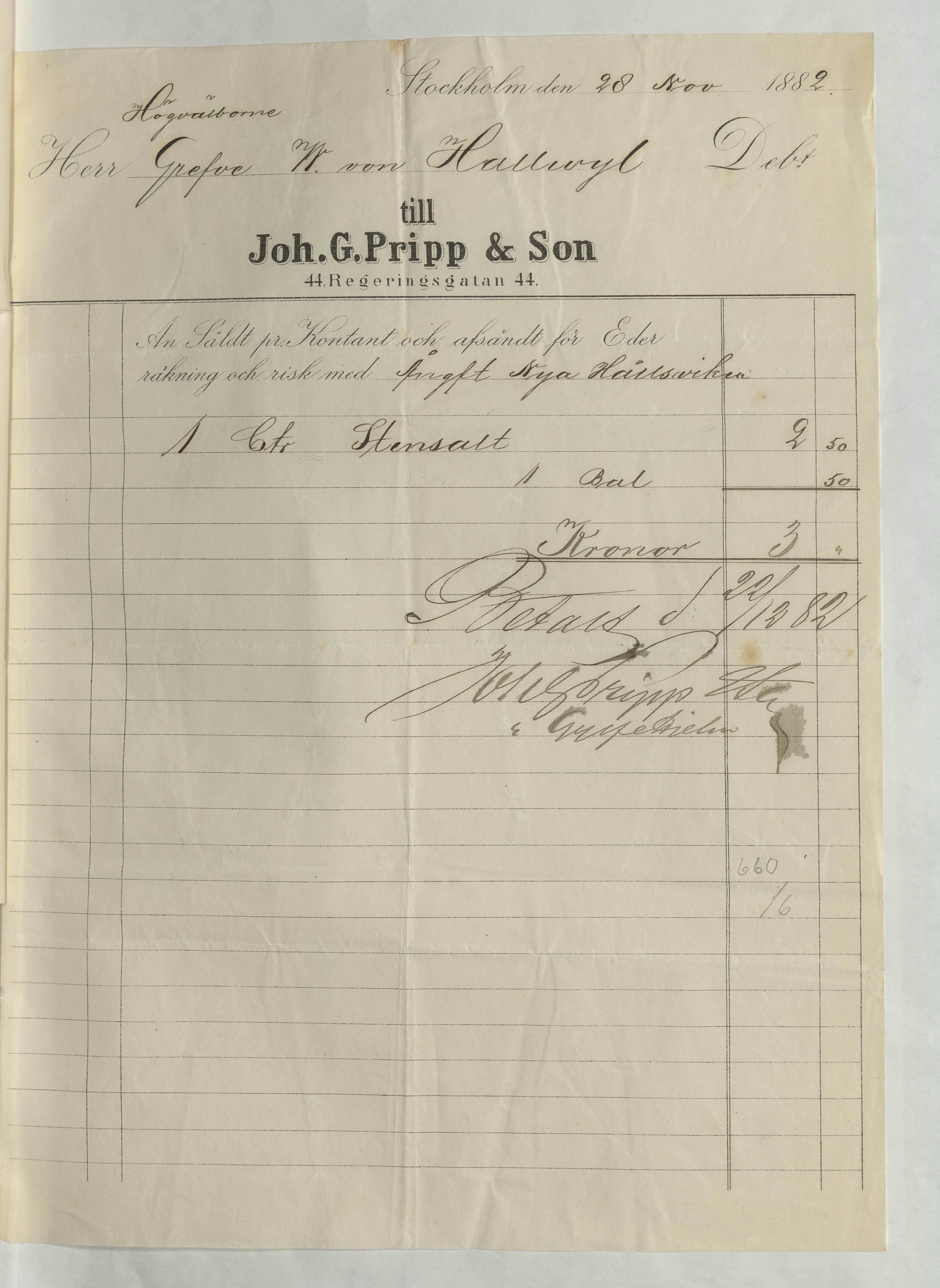 Kvitto från John. G. Pripp & Son till Greve W. von Hallwyl. 3Kr betalt, 28 november 1882.