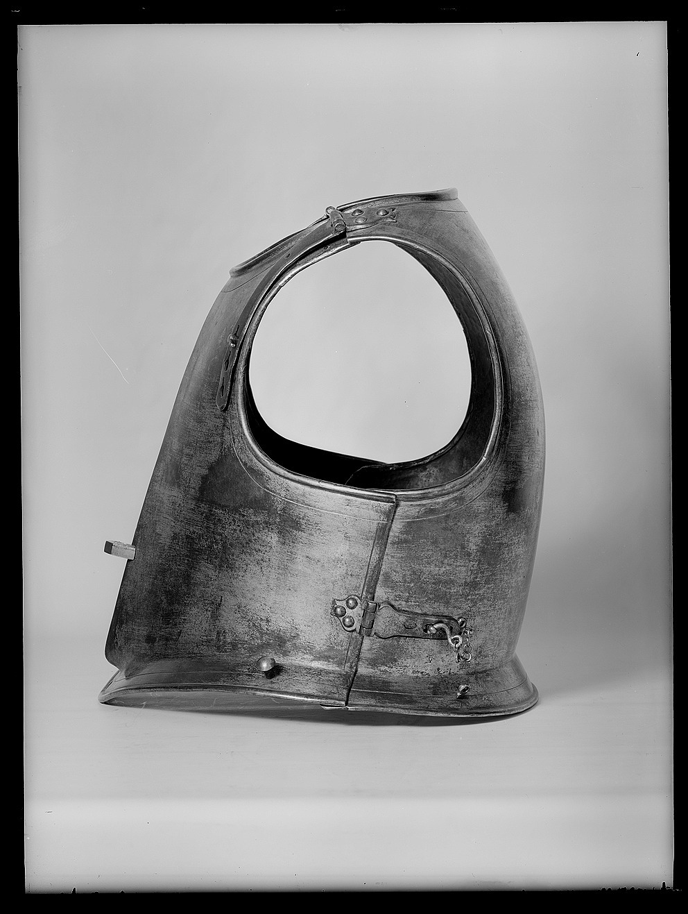 Bakåtdragna axlar, B 50 mm. Rundade djupa urtagningar för hals och armar. Kanterna omvikta inåt och rundsmidda. Tydlig mittås med början 20 mm under halskant och avslutad nertill i liten spets utskjutande ca 12 mm. Nertill snett utstående svagt välvt skört, B 35 mm i sidan. I var sida en utstående nit. I vänstersidans mitt och mitt på skörtet ett hål (?) Vid bägge axlarna ett öppet och ett igensatt hål. På var sidan bröstet en vridbar näbbförsedd tapp. På högersidan fäste för lanshake i form av fyra över varandra satta hålförsedda tappar. I mittåsens nedre del en genom harnesket utskjutande tapp (nygjord) för förstärkningsstycke.