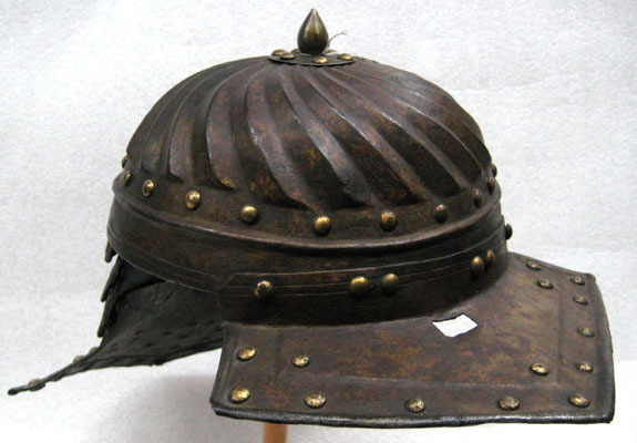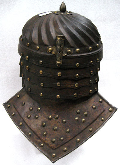 Av stålplåt. Hela utsidan ursprungligen förgylld/guldmålad, även nitarna. Insidan svart. Klocka i ett stycke. Halvklotformig med vridna spestiga åsar nertill tvärt avlutade 45 mm från nederkant. Därefter kullriga nitar i rad, rundad ås löpande runtom och nederst filad dubbellinje. I klockans topp cirkulär plåt diam 47 mm med lökfomig knopp H 25 mm. I nacken plymhållare av förgylld gulmetall, H 59 mm. Cylindrisk, nedåt avsmalnande med sju hål och invikt överkant. Pannskärm nitad i klockan. Närmast rak, sidorna spetsiga liksom den utdragna mitten. Hål för näsbärga, B 20 mm. Kanten omvikt inåt. Nackskärm av fyra skenor nitade i klockan. Ursprungligen fästade på insidan med läderband i mitten (saknas) och glidnitar i sidorna. Övre tre skenorna snarlika varandra; långsidan med fem spetsar och filad dubbellinje, kortsidan med försänkt bård och invikt kant. Sista skenan betydligt större, formad som pannskärmen med spestiga sidor och mitt. Försänkt bård och invikt rundsmidd kant. Förutom kantnitar 19 dekornitar i tre grupper. På insidan minimala rester av läderband. Olika nitbrickor; cirkulära, fyrsidiga och åttsidiga.