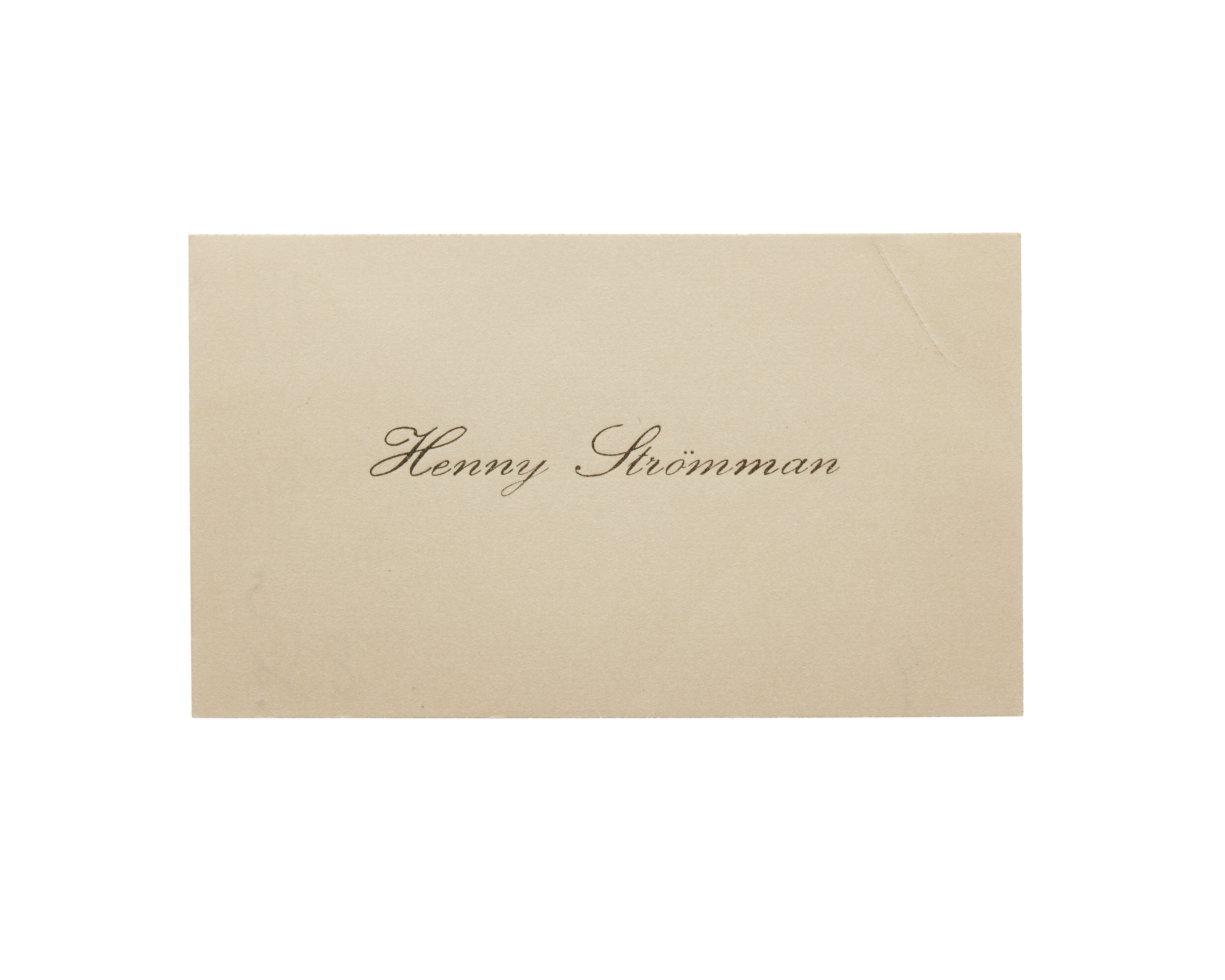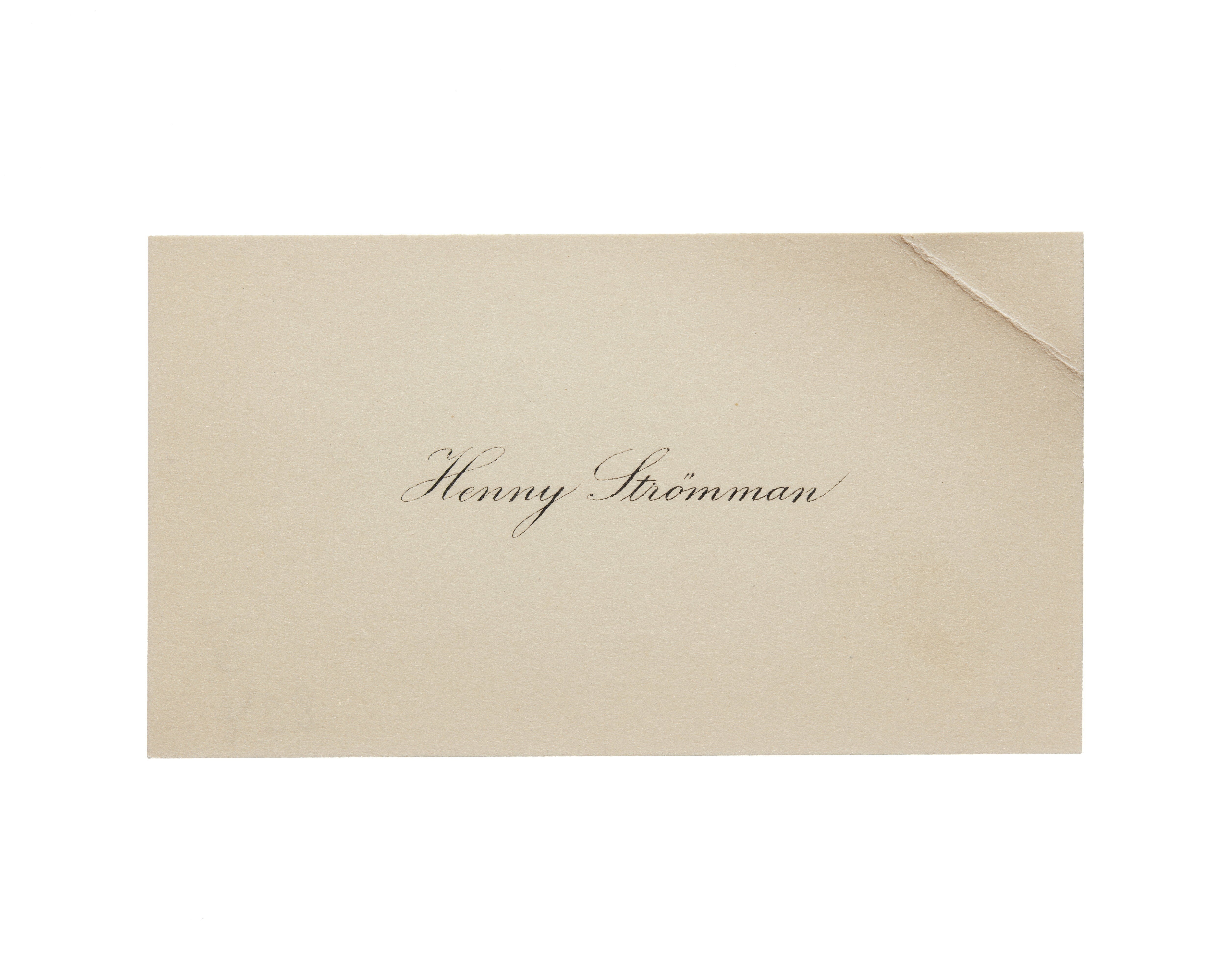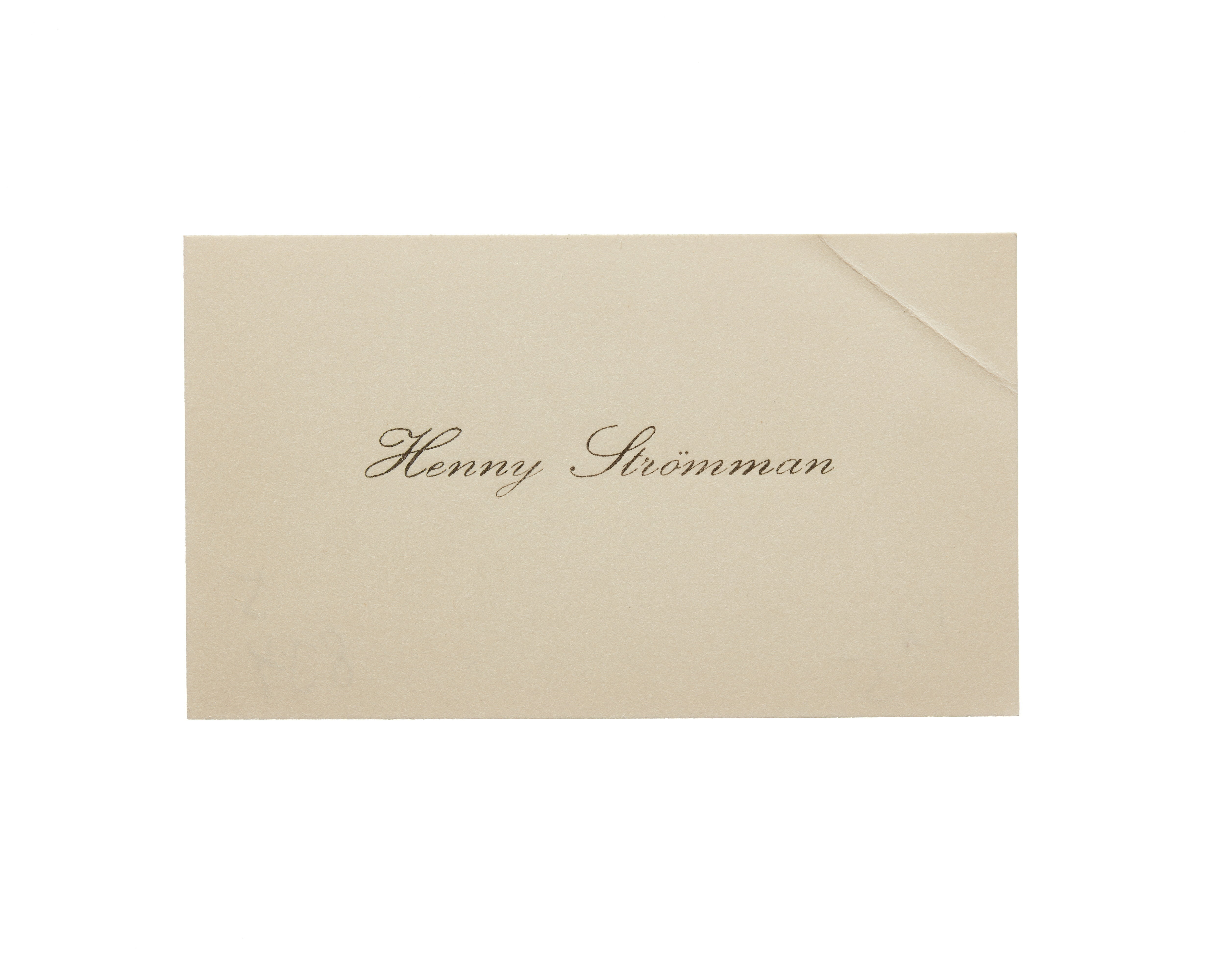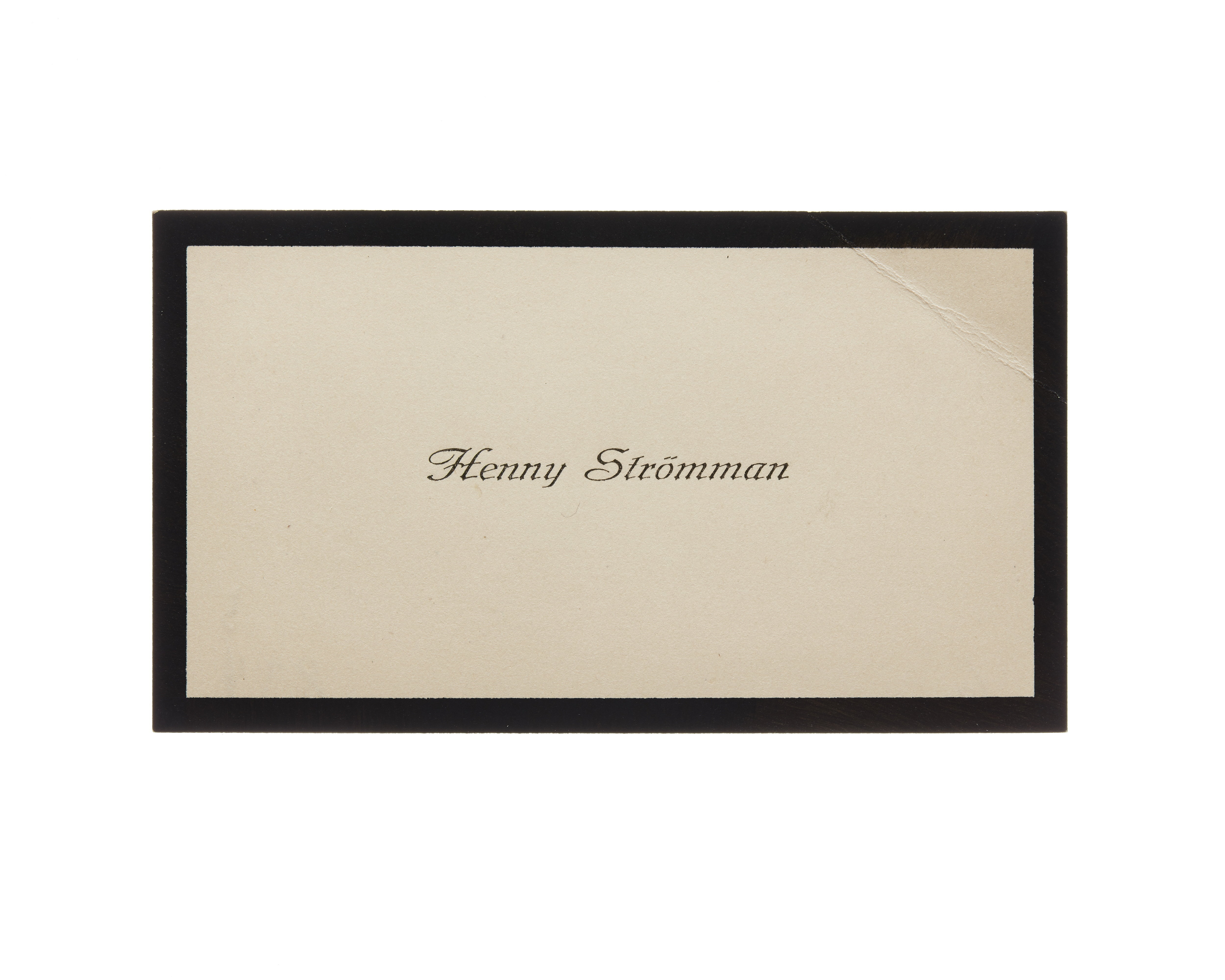 Sju visitkort från Henny Strömman. Första kortet är utan datum, vikt i övre högra hörnet. Andra kortet daterat 1917, vikt i övre högra hörnet. Tredje kortet daterat 1918, vikt i övre högra hörnet. Fjärde kortet daterat 1919, vikt i övre högra hörnet. Femte kortet daterat 1921, vikt i övre högra hörnet. Sjätte kortet daterat 1922 samt sorgkant, vikt i övre högra hörnet. Sjunde kortet daterat 1925, vikt i övre högra hörnet.