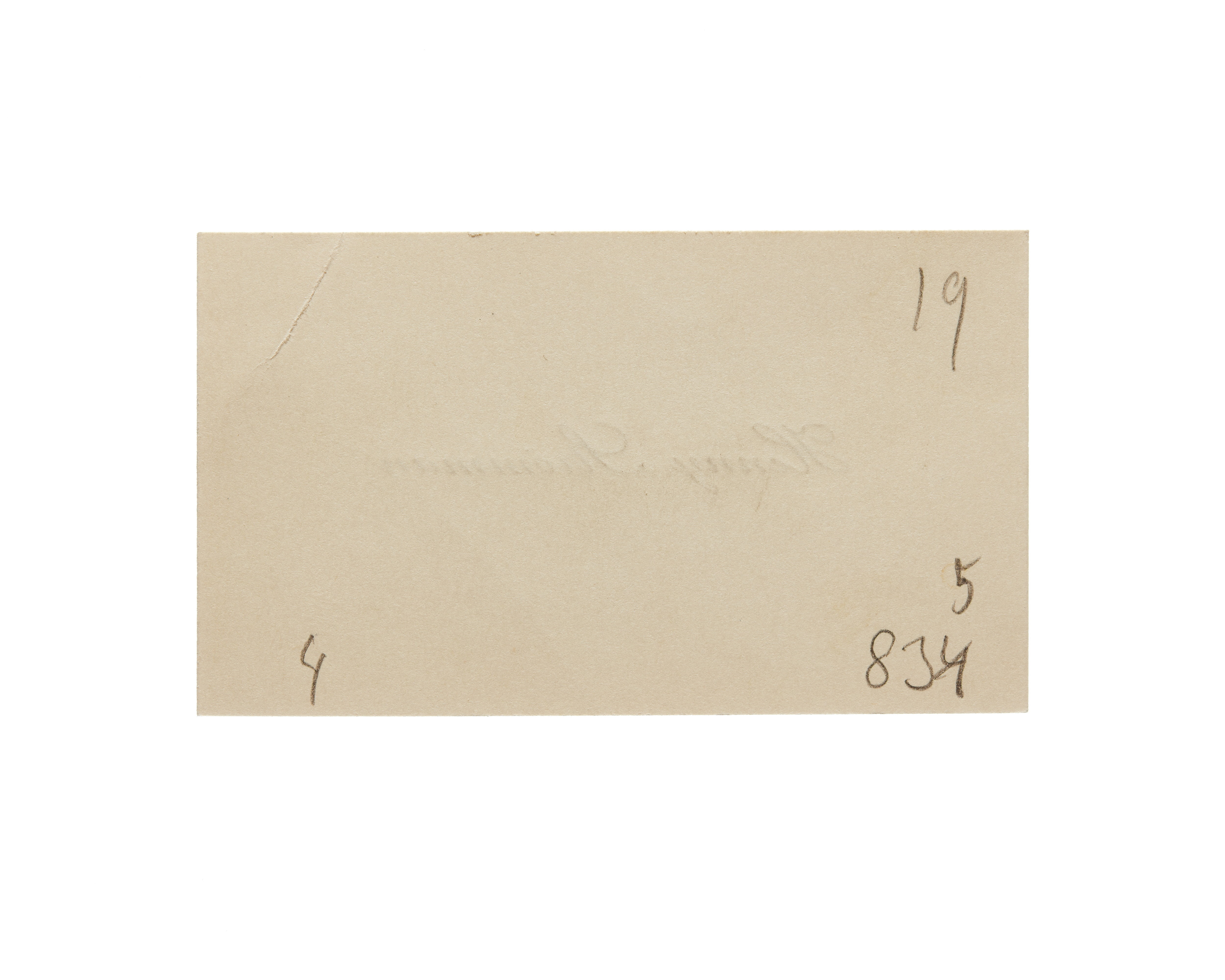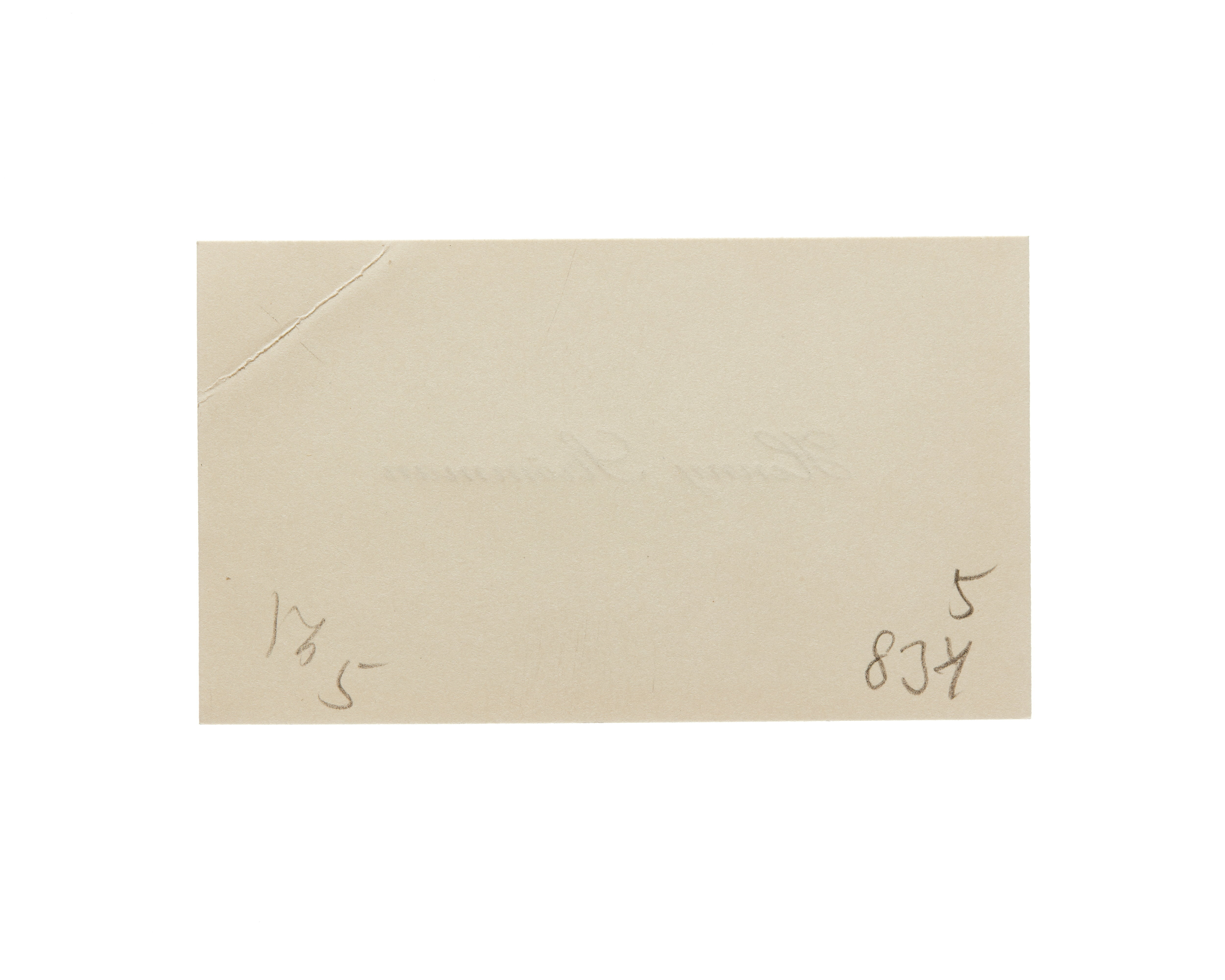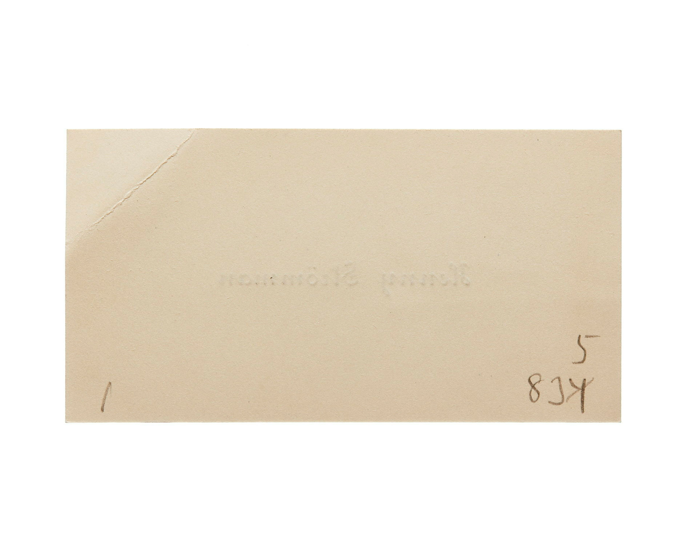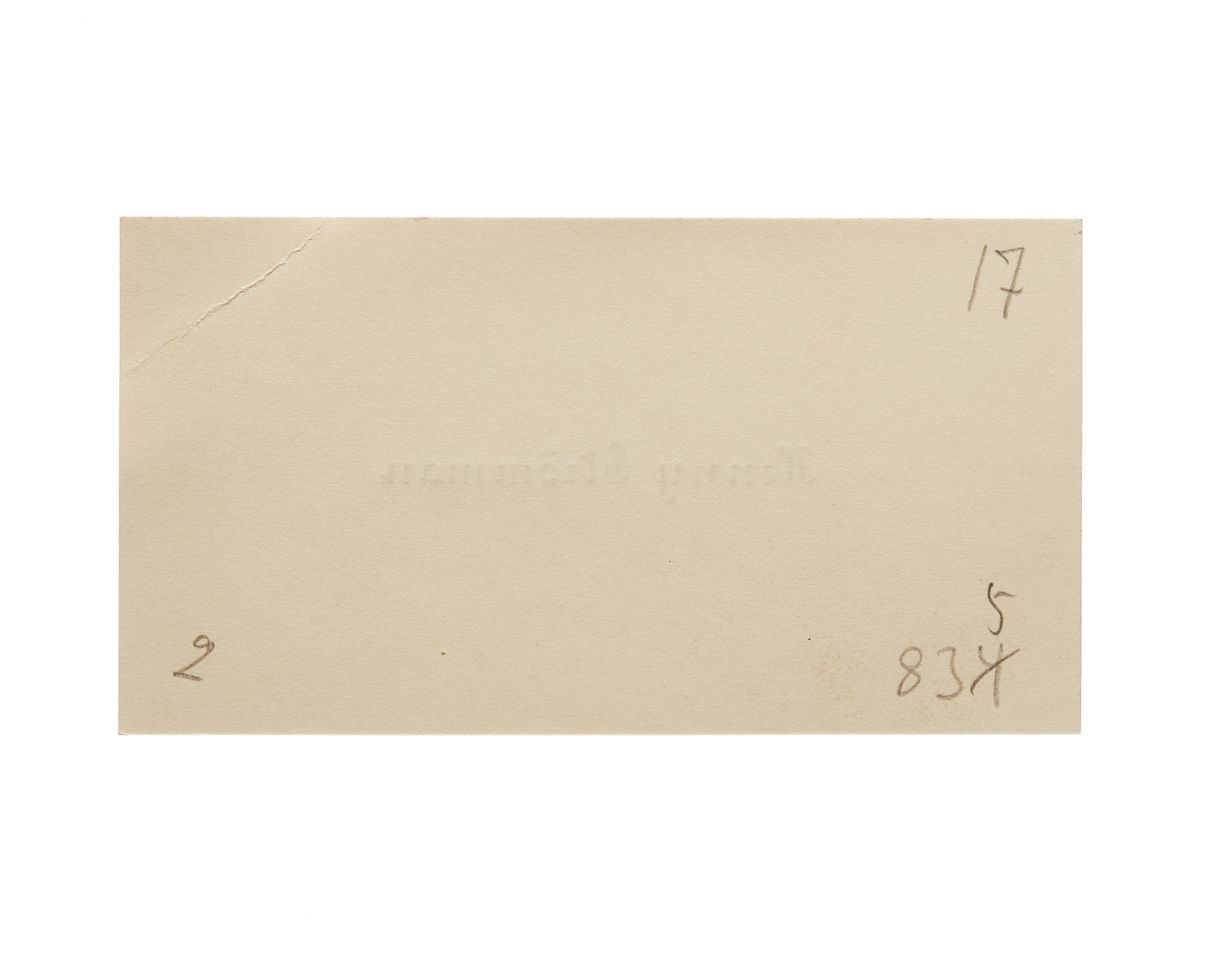 Sju visitkort från Henny Strömman. Första kortet är utan datum, vikt i övre högra hörnet. Andra kortet daterat 1917, vikt i övre högra hörnet. Tredje kortet daterat 1918, vikt i övre högra hörnet. Fjärde kortet daterat 1919, vikt i övre högra hörnet. Femte kortet daterat 1921, vikt i övre högra hörnet. Sjätte kortet daterat 1922 samt sorgkant, vikt i övre högra hörnet. Sjunde kortet daterat 1925, vikt i övre högra hörnet.
