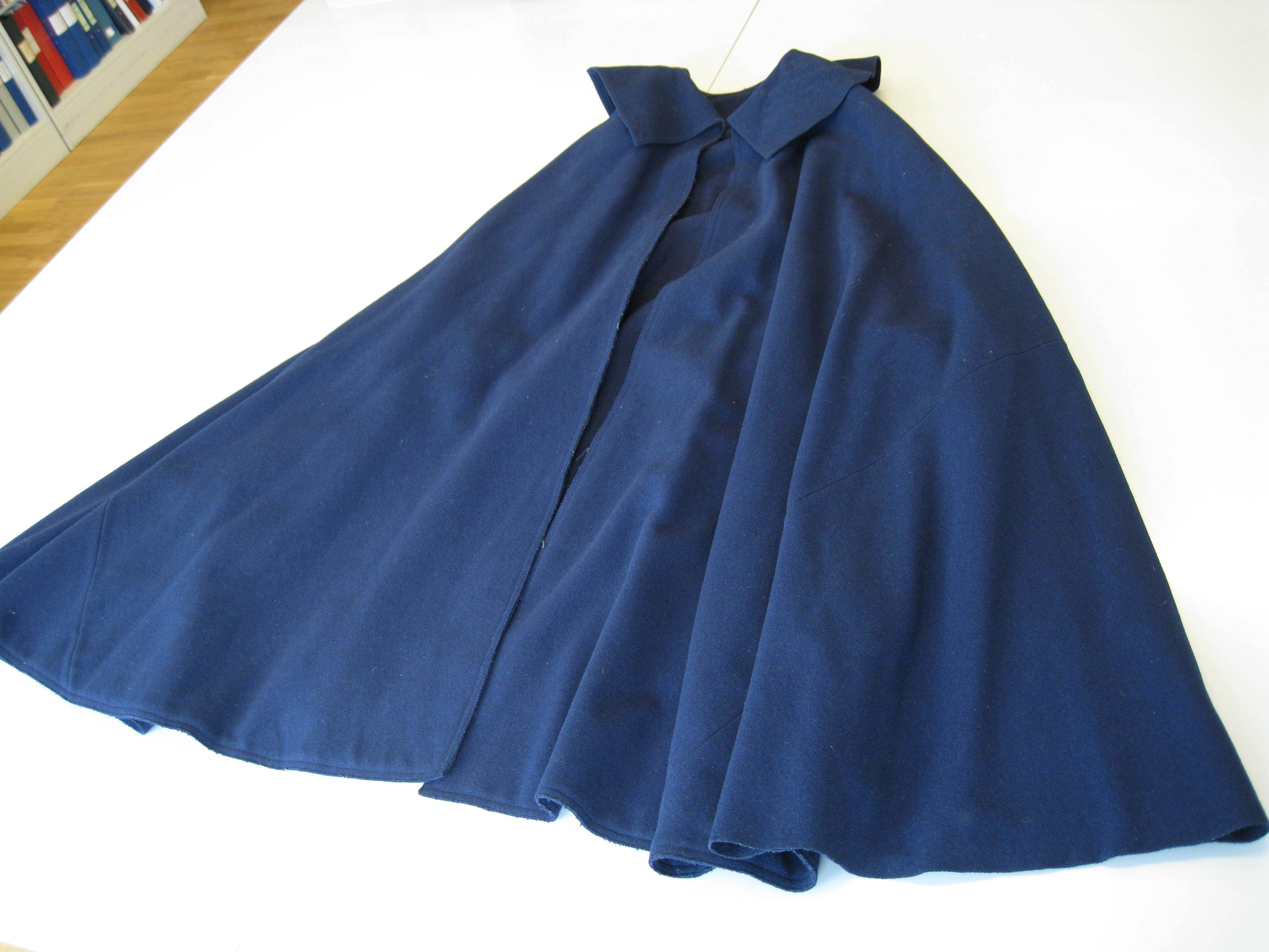 Cirkelrund kappa med krage. Material blått... Foder i samma material. Något fläckig krage. Svart plastknapp och metallkrok under krage vänster. Kedja saknas. Lätt skada i tyget under krage höger där kedja förmodas ha varit fäst.