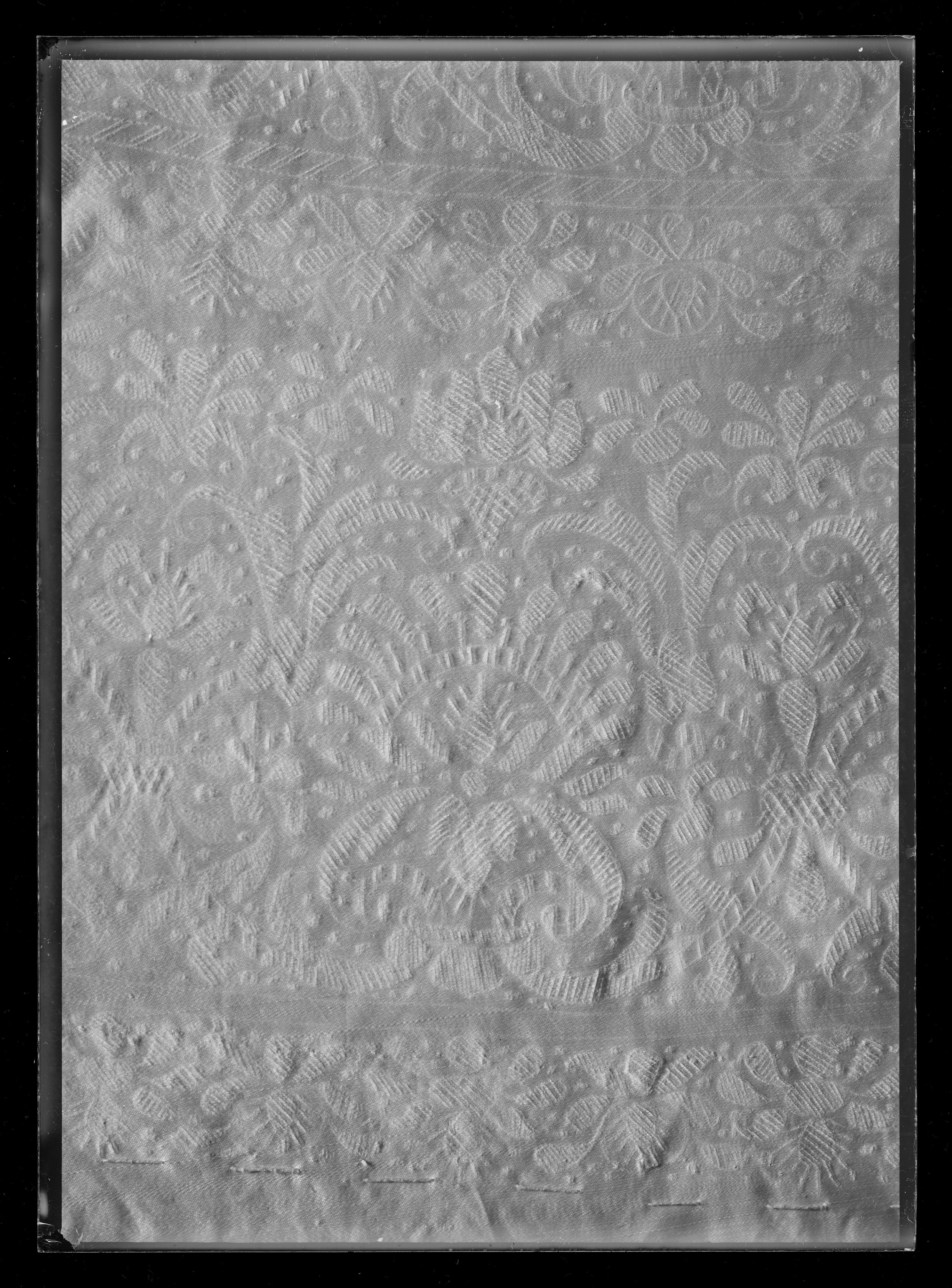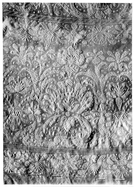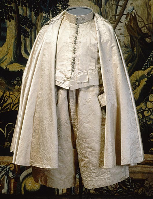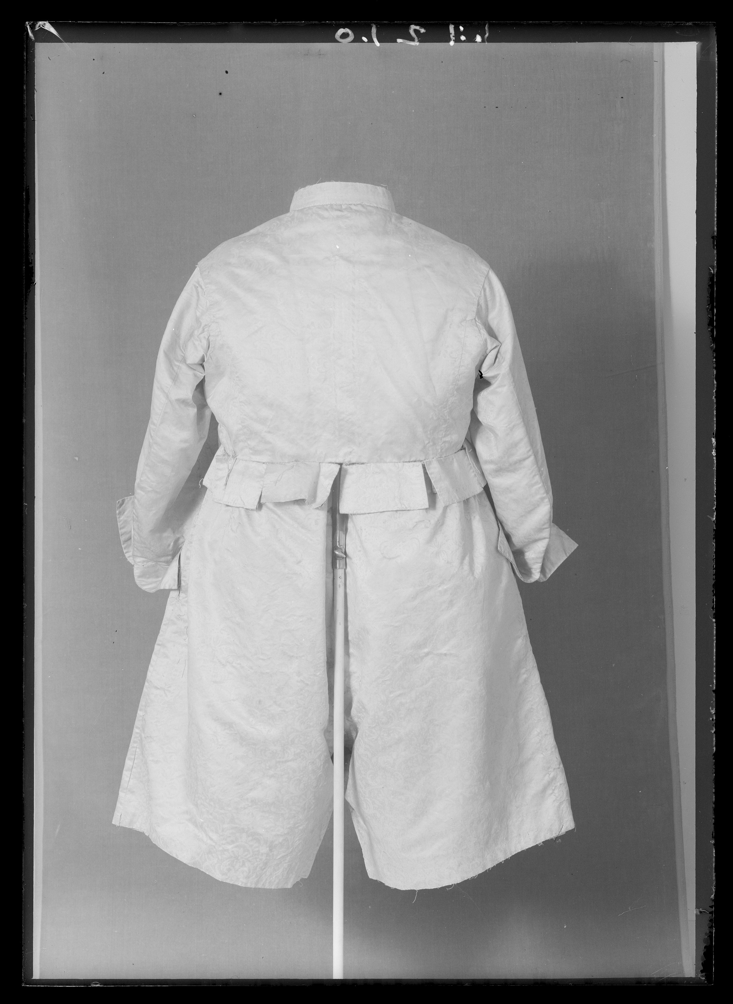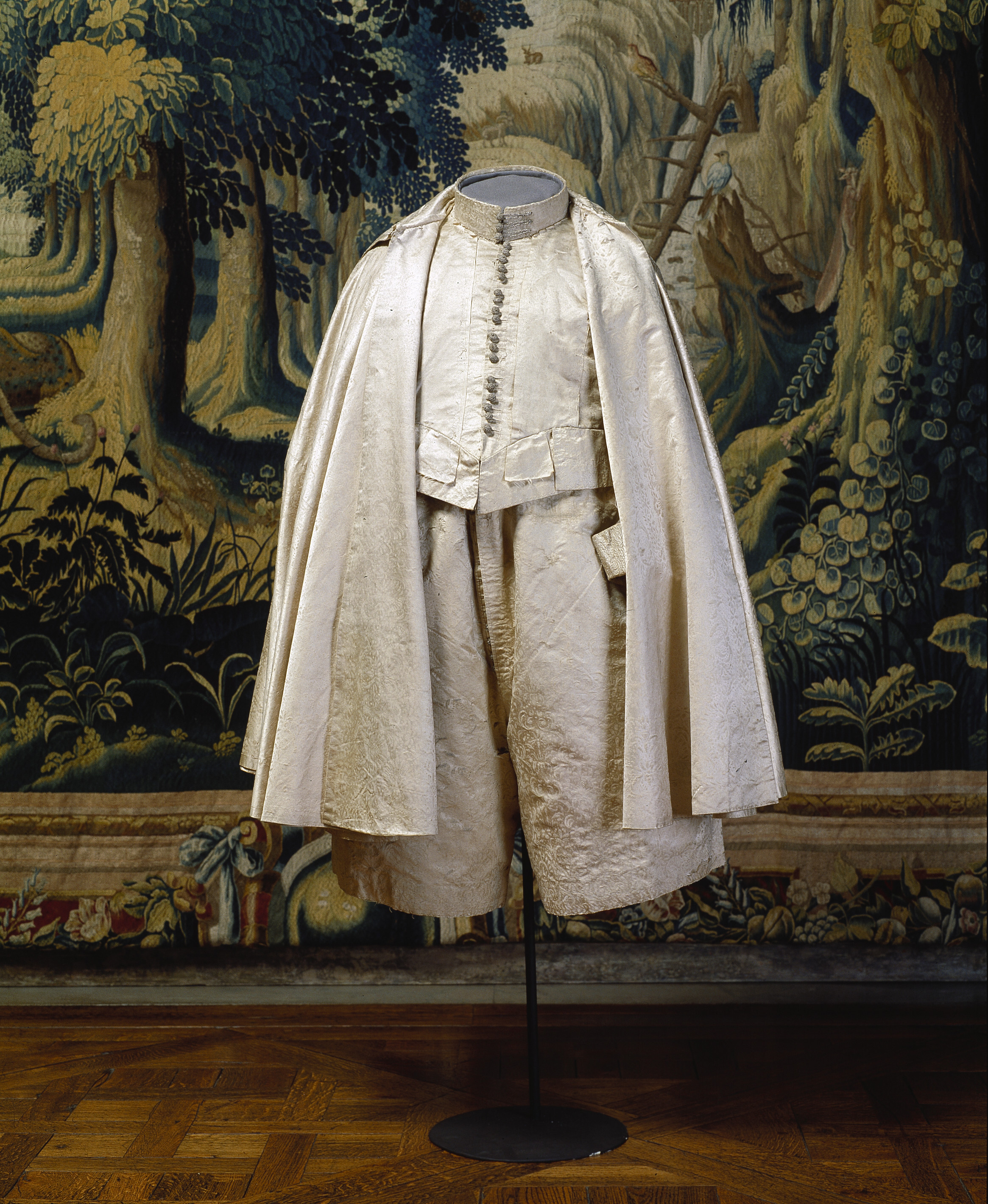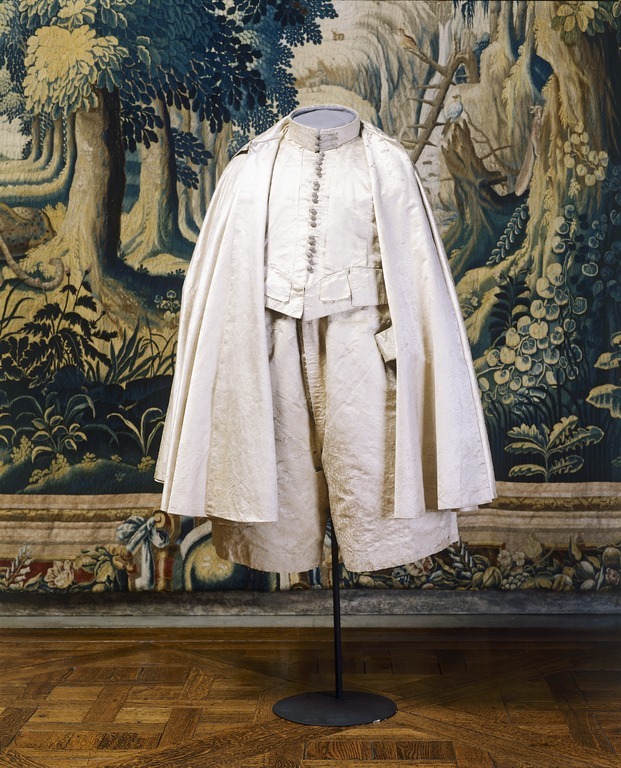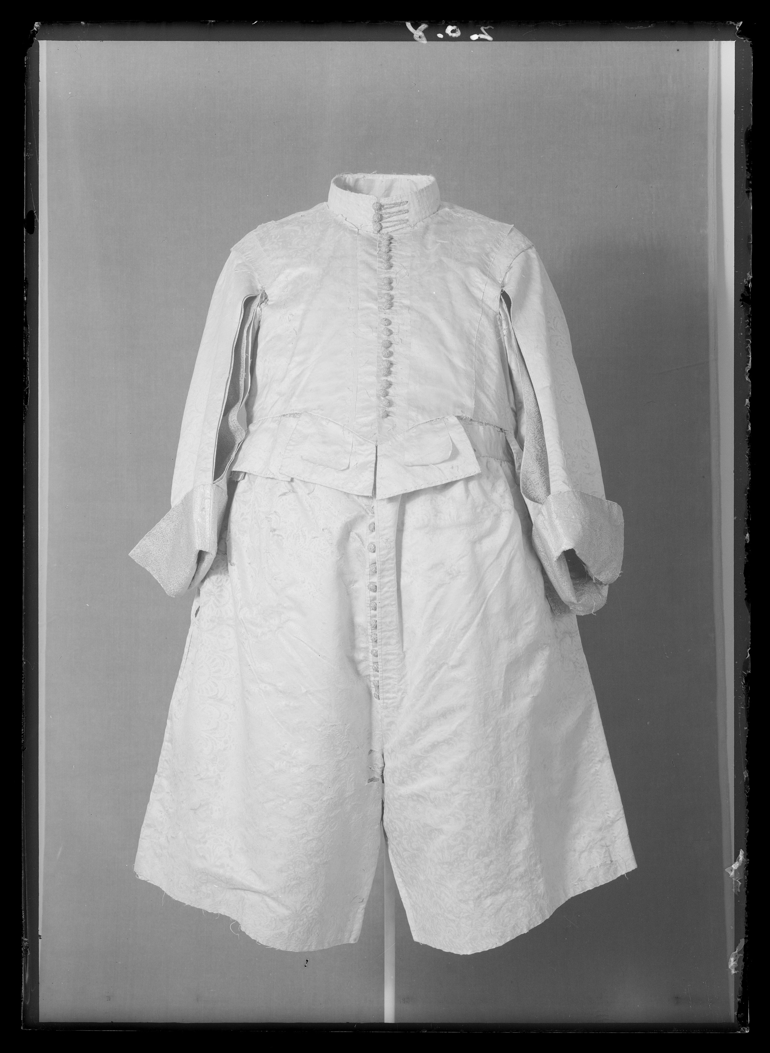 Anm. Först nämnd i Klädkammarens räkenskaper 1654. Buren av Karl X Gustav vid kröningsceremonien i Uppsala domkyrka den 6 juni 1654, troligen tillsammans med vita skor och handskar och en svart hatt med vita plymer. Dräktens ytdekor utförd 1654 av pärlstickaren Friderich Feuerbrun. Tröjan är av innocenttyp, skuren i 2 framstycken, utefter vilkas framkanter staden ligger, 1 bakstycke, 10 små skört, 2 svängda ärmstycken till varje ärm samt ståndkrage skuren i ett enda svängt stycke. Längs vänster framkant går en knapphålsrad med 21 knapphål (2 cm långa, sydda med vitt, högertvinnat silke c:a 9 stygn/cm över 1 tråd). Endast 19 av knapparna är kvar på motsatta sidan. De är klädda med silvertråd (d: 1,2 cm). Ståndkragens samtliga 3 knappar är i behåll. Kragen som framtill är 5 cm hög och 3,5 cm hög baktill har för knäppningen på vänster sida 3 st i flätteknik utförda silversnören. Kragen är fastkastad vid halsurringningen med vitt, högertvinnat silke. Den är styv med mellanfoder av grovlinnelärft (16x14 tr/cm2) med insydda fiskben. Dess foder utgörs på insidan av vit taft (54x52 tr/cm2). På de båda framstyckena har ytterligare ett stycke atlas, med samma mönstring, av 10-14 cm bredd fästs ovanpå det "ordinarie" tyget, liksom små flikar extratyg sytts på de 2 främsta skörten. Tröjan är f.ö. hopsydd av tygstycken, som inte alltid passats ihop med samma precision som den rundskurna kappan. Ärmarna är, som vanligt, öppna utefter den svängda inre sömmen sånär som på de 14 nedersta cm som bildar uppslaget. Nedtill i ärmarna finns också ett mellanfoder av grov, oblekt linnelärft (17x15 tr/cm2), det gällde att få styrsel i uppslagen. Tröjan är fodrad med silverbrokad, dess vådbredd är minst 51 cm. (66x17 á 18tr/cm2). Botteninslaget har på rätan silverlan. Mot detta avtecknar sig blommönstret i flotterande trådar utan metalltrådstillsats. Silket är vitt och otvinnat. Staden är 0,9 cmbred. (13 gröna, 4 orange, 11 gröna, 1 vit och orange tjockare tråd. Tuskaft). Mönsterrapport: h: 7,3 cm, b: 6,8 cm. Mönstret är detsamma som fodret i tröjan nr 3386.Tröjan är helt mellanfodrad med grov linnelärft (16x13 tr/cm2). Mitt fram i de till en spets utdragna framstyckena är planschetter inlagda, som når till en höjd av 21 cm. Av den ursprungliga dekoren av silverspetsar återstår nu blott ett fragment på den översta knappen. Antagligen har spetsen löpt som en 4 cm bred garnering runt plaggets sömmar och kanter. De har rönt samma öde som kappans spetsar. I midjan sitter på insidan i tröjan 8 st byxtampar av foderbrokaden vardera med 2 hål.