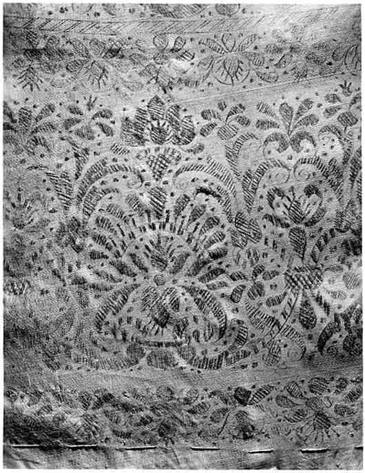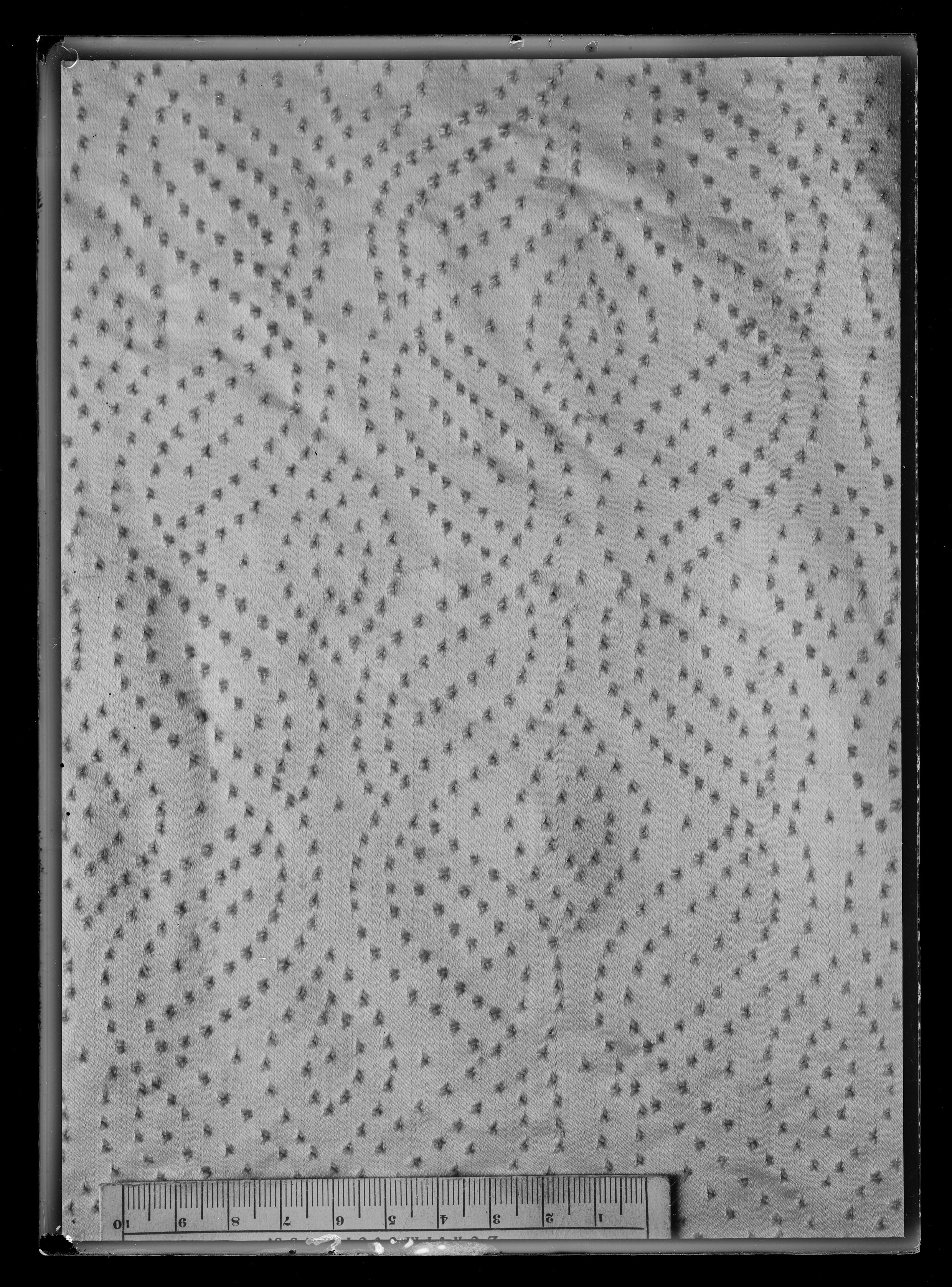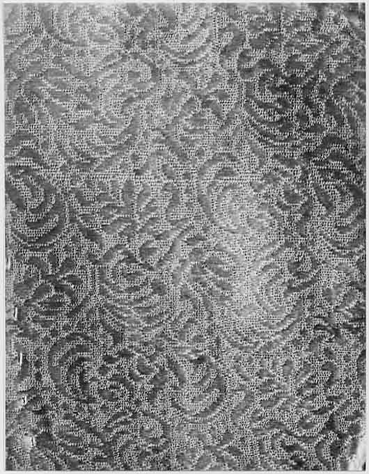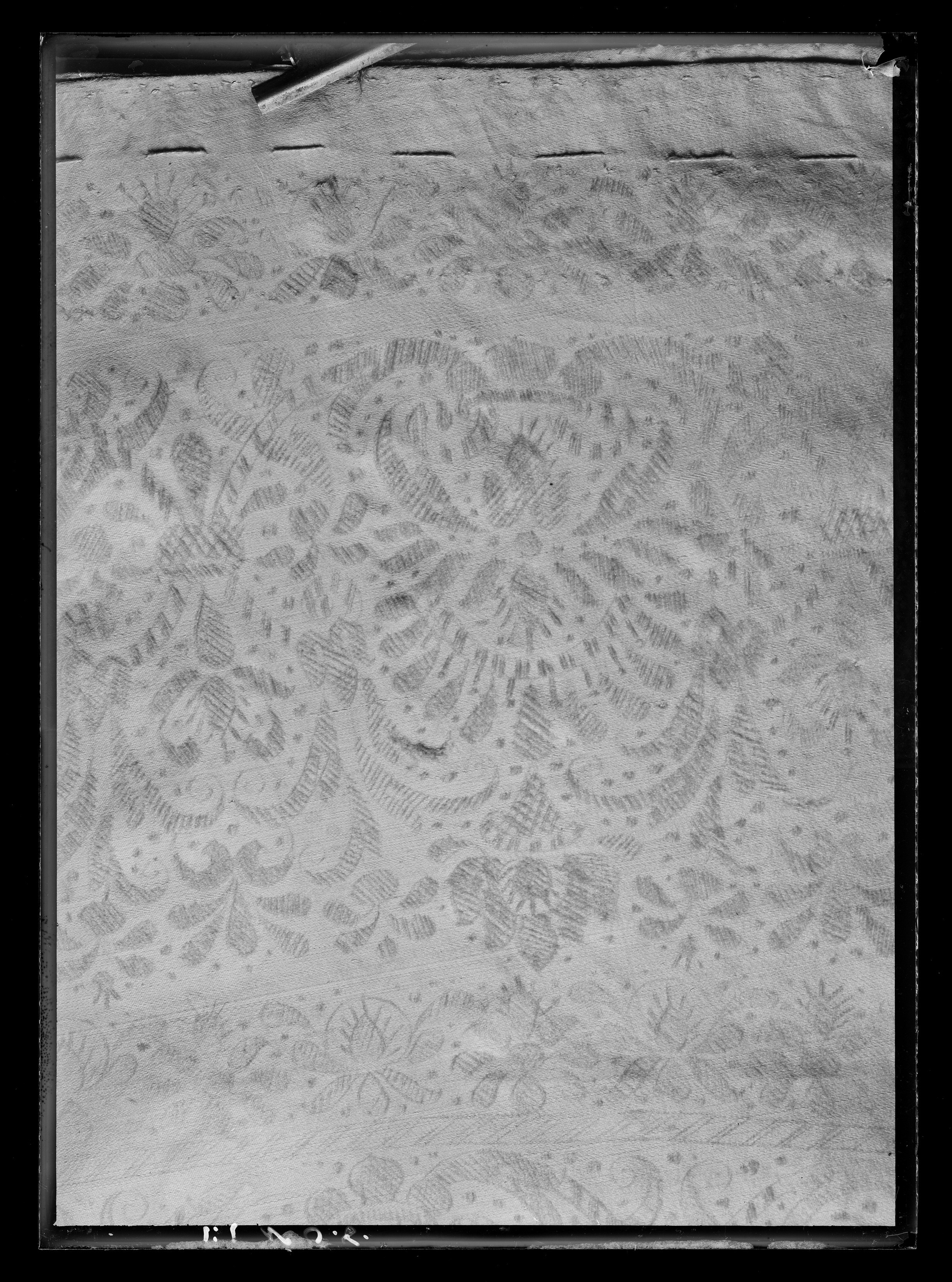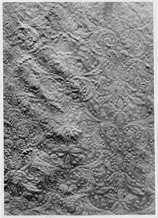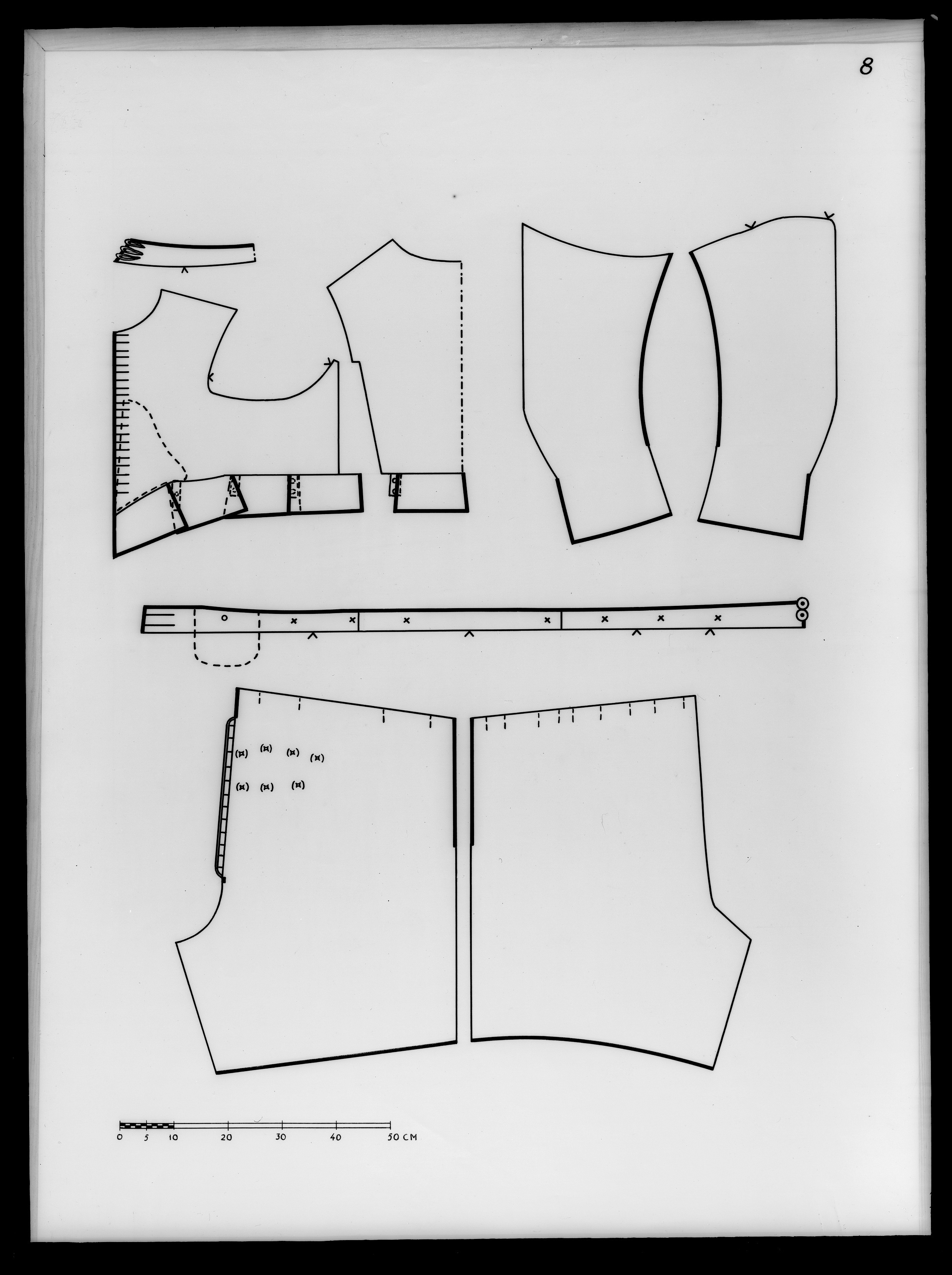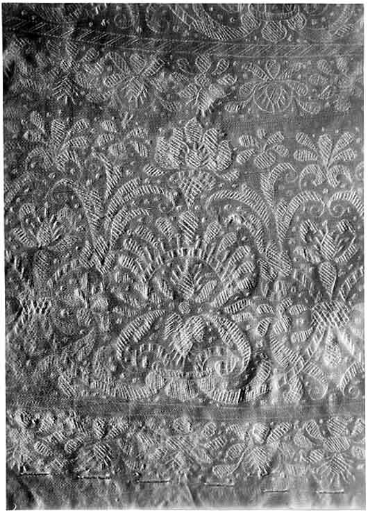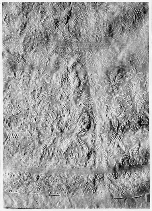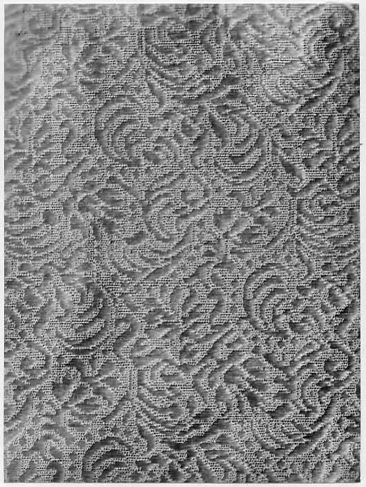 Anm. Först nämnd i Klädkammarens räkenskaper 1654. Buren av Karl X Gustav vid kröningsceremonien i Uppsala domkyrka den 6 juni 1654, troligen tillsammans med vita skor och handskar och en svart hatt med vita plymer. Dräktens ytdekor utförd 1654 av pärlstickaren Friderich Feuerbrun. Tröjan är av innocenttyp, skuren i 2 framstycken, utefter vilkas framkanter staden ligger, 1 bakstycke, 10 små skört, 2 svängda ärmstycken till varje ärm samt ståndkrage skuren i ett enda svängt stycke. Längs vänster framkant går en knapphålsrad med 21 knapphål (2 cm långa, sydda med vitt, högertvinnat silke c:a 9 stygn/cm över 1 tråd). Endast 19 av knapparna är kvar på motsatta sidan. De är klädda med silvertråd (d: 1,2 cm). Ståndkragens samtliga 3 knappar är i behåll. Kragen som framtill är 5 cm hög och 3,5 cm hög baktill har för knäppningen på vänster sida 3 st i flätteknik utförda silversnören. Kragen är fastkastad vid halsurringningen med vitt, högertvinnat silke. Den är styv med mellanfoder av grovlinnelärft (16x14 tr/cm2) med insydda fiskben. Dess foder utgörs på insidan av vit taft (54x52 tr/cm2). På de båda framstyckena har ytterligare ett stycke atlas, med samma mönstring, av 10-14 cm bredd fästs ovanpå det "ordinarie" tyget, liksom små flikar extratyg sytts på de 2 främsta skörten. Tröjan är f.ö. hopsydd av tygstycken, som inte alltid passats ihop med samma precision som den rundskurna kappan. Ärmarna är, som vanligt, öppna utefter den svängda inre sömmen sånär som på de 14 nedersta cm som bildar uppslaget. Nedtill i ärmarna finns också ett mellanfoder av grov, oblekt linnelärft (17x15 tr/cm2), det gällde att få styrsel i uppslagen. Tröjan är fodrad med silverbrokad, dess vådbredd är minst 51 cm. (66x17 á 18tr/cm2). Botteninslaget har på rätan silverlan. Mot detta avtecknar sig blommönstret i flotterande trådar utan metalltrådstillsats. Silket är vitt och otvinnat. Staden är 0,9 cmbred. (13 gröna, 4 orange, 11 gröna, 1 vit och orange tjockare tråd. Tuskaft). Mönsterrapport: h: 7,3 cm, b: 6,8 cm. Mönstret är detsamma som fodret i tröjan nr 3386.Tröjan är helt mellanfodrad med grov linnelärft (16x13 tr/cm2). Mitt fram i de till en spets utdragna framstyckena är planschetter inlagda, som når till en höjd av 21 cm. Av den ursprungliga dekoren av silverspetsar återstår nu blott ett fragment på den översta knappen. Antagligen har spetsen löpt som en 4 cm bred garnering runt plaggets sömmar och kanter. De har rönt samma öde som kappans spetsar. I midjan sitter på insidan i tröjan 8 st byxtampar av foderbrokaden vardera med 2 hål.