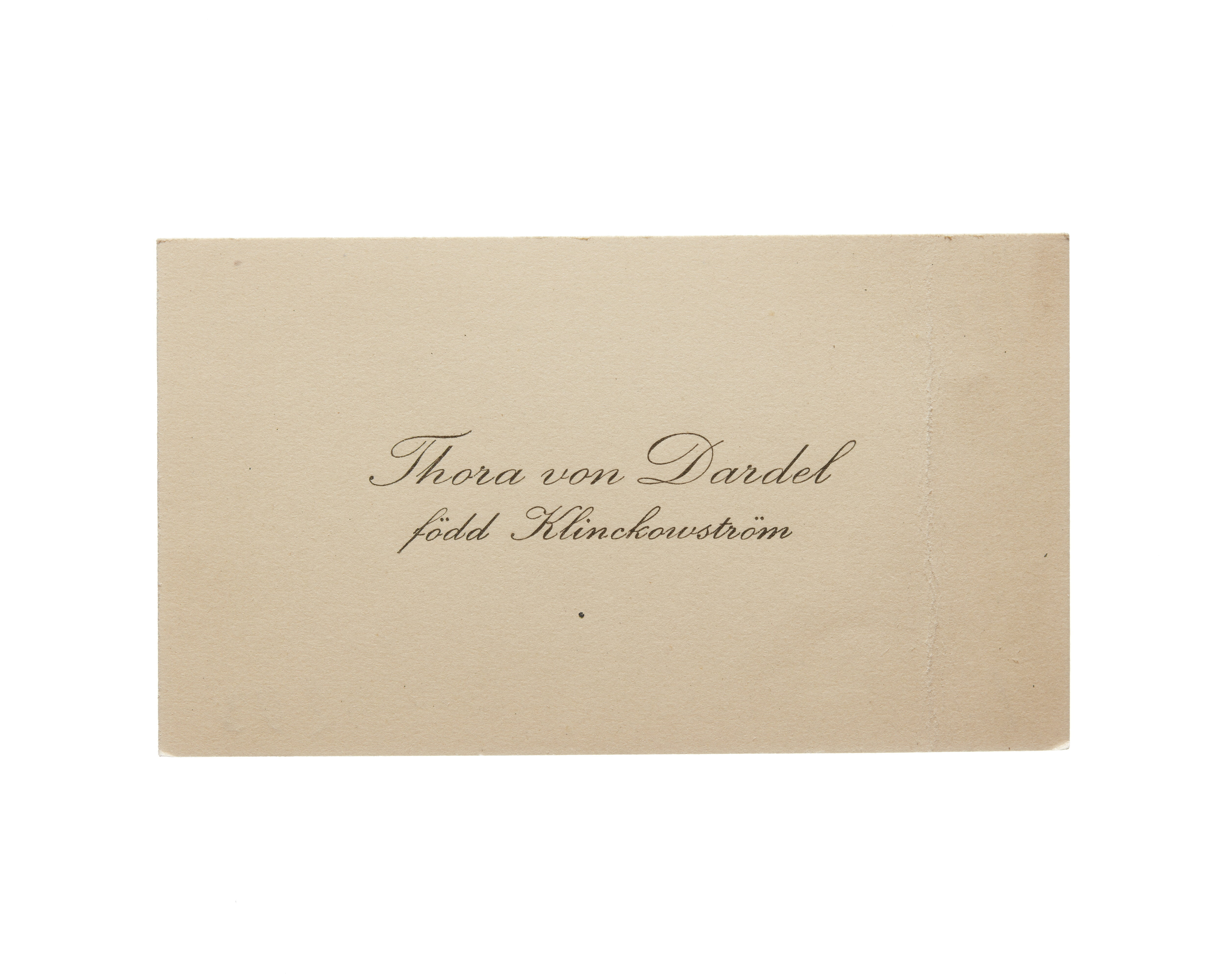 Tre visitkort från Thora von Dardel f. Klinckowström. Första kortet daterat 1922, vikt i högra sidan. Andra kortet är utan datum, står på kortet "Madame Nils de Dardel". Adress (nedre högra hörnet) 108, rue Lepic, Paris. Tredje kortet daterat 1926.