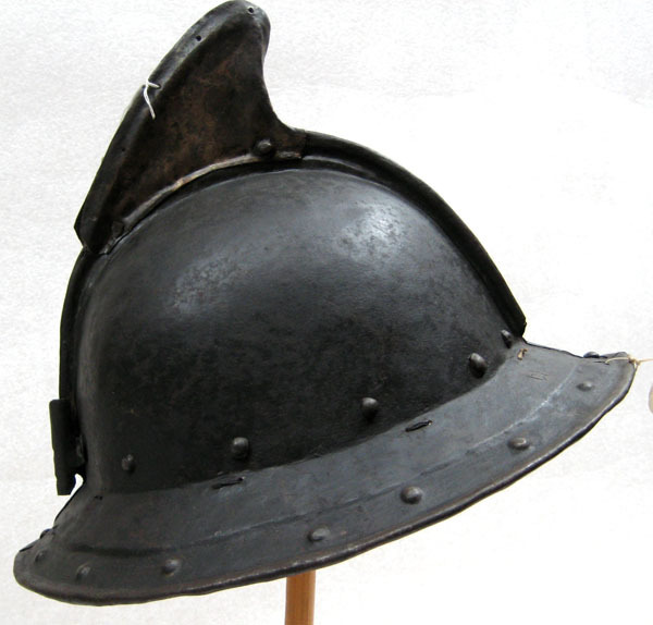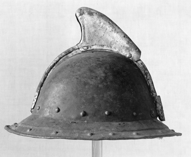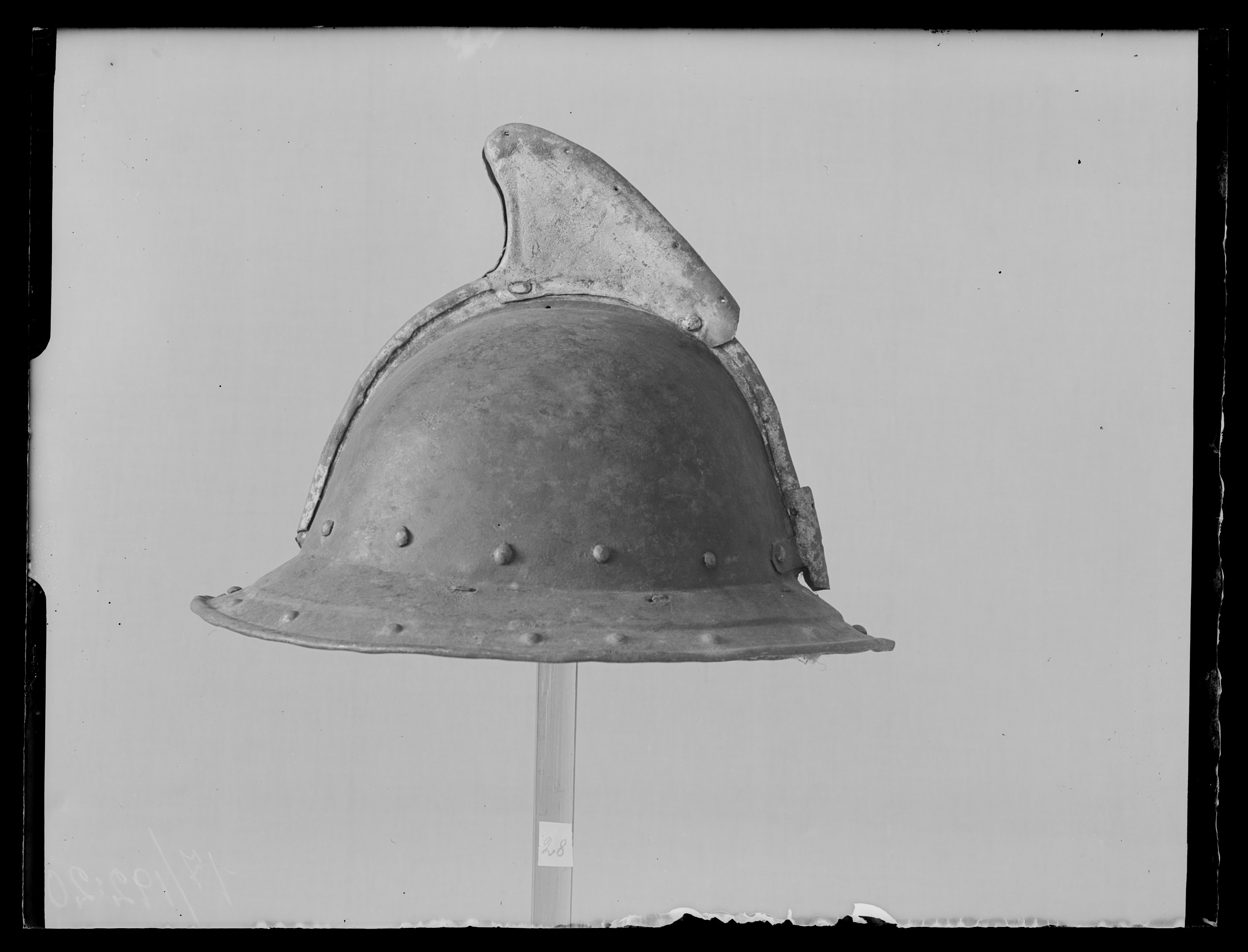 Av driven stålplåt. Utsidan målad svart med nederkant, kamkant och vinge ursprungligen guldgula, tydliga filspår. Insidan med slagmärken. Hjälm bestående av två halvor, sammanfogade i en längsmed klockan löpande kam, omvikt och förstärkt. Klockan rundad. Upptill på kammen är en senare (under 1700-talet) nitad dekoration i form av en trekantig något framåtsvängd vinge av bleckplåt, av två halvor fäst i kammen med två nitar. Nertill övergår klockan i ett brätte, något neddraget med invikt rundsmidd kant och försänkt bård med falska uppdrivna nitar. På klockan baktill en plymhållare, H 50 mm, nedåt avsmalnande med tre hål, fäst med två nitar. I klockan nertill på var sida nitar i rad. I kanten där brättet möter klockan är en rad av små slagna hålpar hela vägen runtom. I klockan mitt på är ett liknande hålpar, ett på var sida kammen. I brättet framtill ett från insidan slaget hål, samt punsat M över H. Hjälmfoder av grov lärft, hopsytt av två halvor. Under detta en stoppning av linblånor. Fodret är fastsnört i brättetts hålpar med linnetråd.