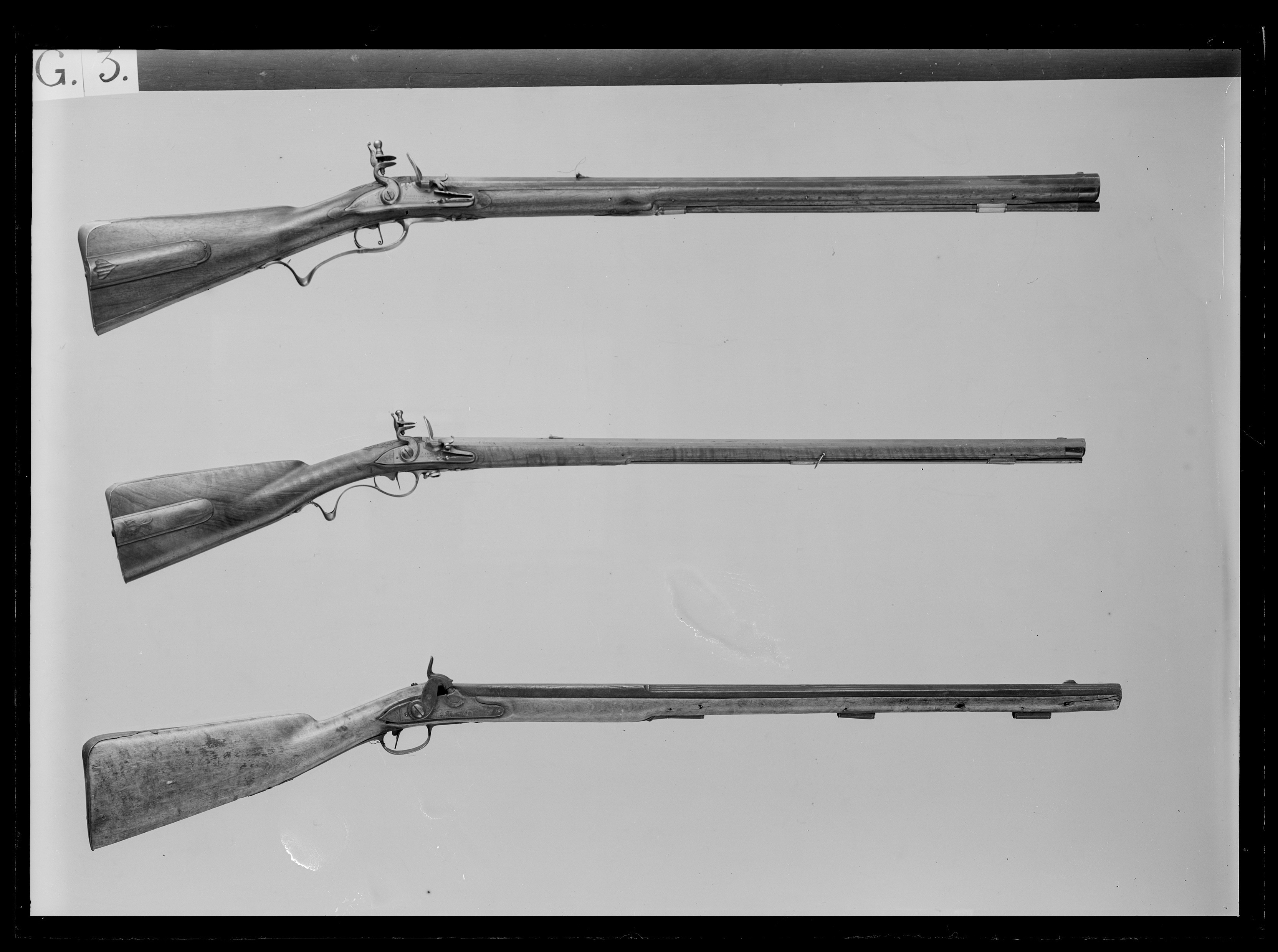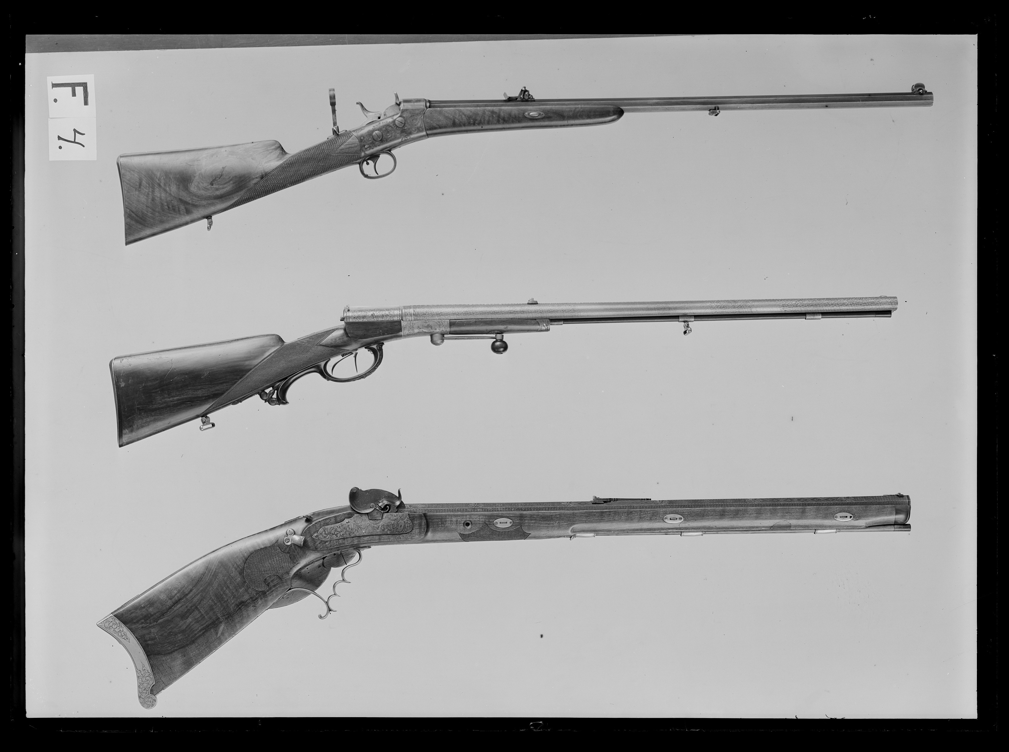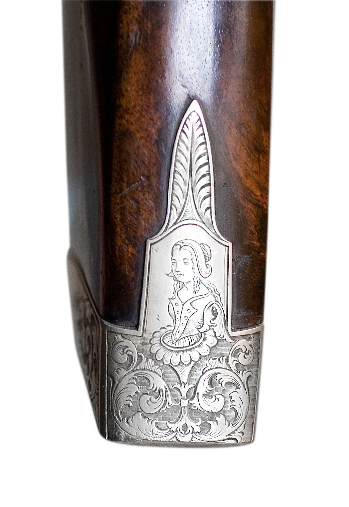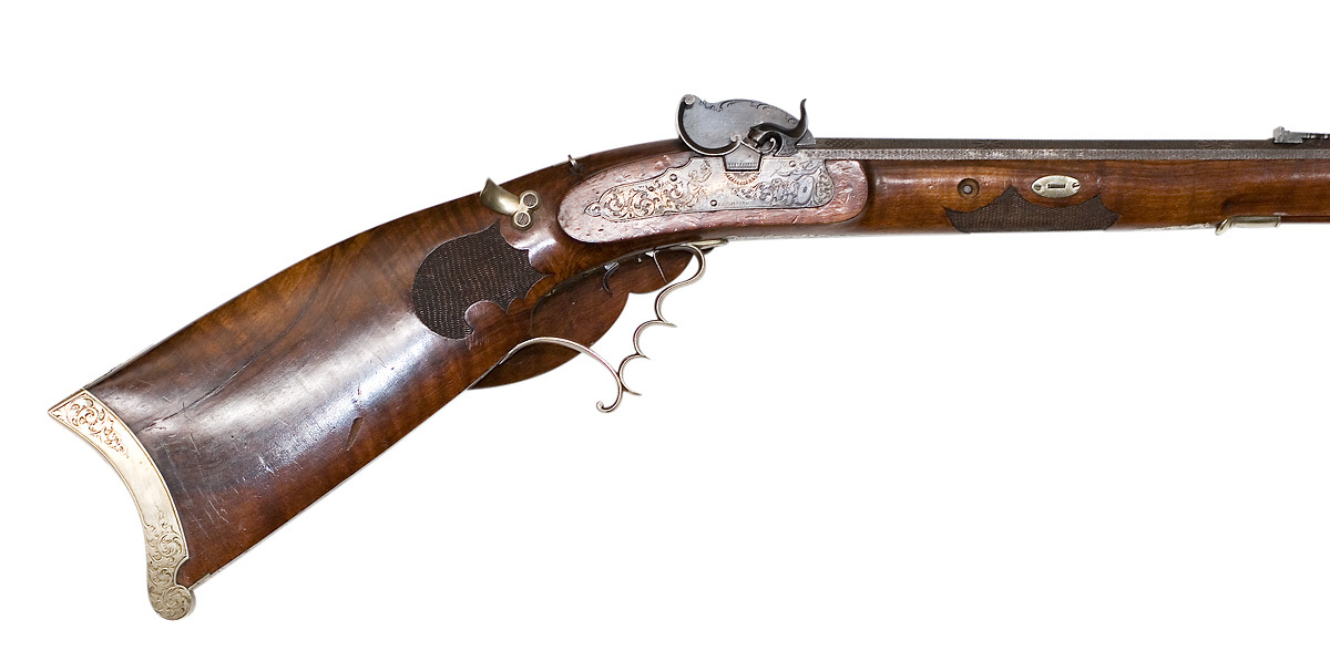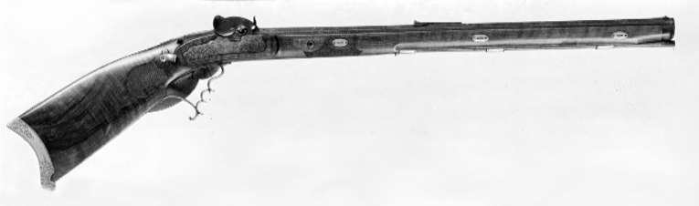 Åttsidig, räfflad pipa av stål, 7 räfflor, skålade bommar. På pipans ovansida falsk damaskering i form av inpunsade sicksacklinjer och tvärgående band med åttabladiga blommor, fem band med en blomma på varje fas, mellan blombanden insprängt annan dekor, varannan med sex romber med fyrbladiga blommor, skrafferad bakgrund, varannan med tre åttabladiga blommor. Vid pipbas och mynning tvärgående silverband. På kammaren inlagd dekor av silver, kartuscher och bandflätning, på ovansidan signatur inlagd i silver: "HORRMANN IN MÜNCHEN", silverdekoren och signaturen mot prickpunsad bakgrund. Långt svansskruvblad med rankdekor mot slät bakgrund. På h. sidan en kantig snäcka med blånerad tändhattsnippel, inskruvad i snäckan genom en platta med uppsvängd arm med vulstformig avslutning. På snäckans bakre del en hög, c-formig skärm med vulstformiga ändar, mellan snäcka och pipa likaså en hög skärm med konturerad överkant, bakkanten svängd efter den andra skärmen, graverad bladdekor längs överkanten. Riktmedel: Inlaxade riktmedel, blånerat ståndsikte med lång, framåtriktad, genombruten arm, siktet ställbart i höjdled med ställskruv framför siktskärmen. Litet stolpkorn av silver på rektangulär, välvd, blånerad platta med bakåtriktad, konturerad och genombruten arm. På svansskruvbladet ett kvadratiskt hål för diopter. Fästning: Pipan fäst med krysskruv samt träskruv baktill på svansskruvbladet, bakre låsskruven genom svansskruvplattan samt tre blånerade, engelska pipstift av stål. Slaglås av gråanlöpt stål, plant låsbleck med graverad rankdekor i båda ändar, övergående dels i en mansfigur med bössa och lyft hatt, dels i clown med måltavla och markerstav. Invändig, blånerad hane placerad på låsbleckets framände, riktad bakåt, harmynt slaghuvud med nätskuret tumgrepp, Hankroppen c-formig, i nederdelen hel- och halvspännshak, i överdelen är slagfjädern fäst med länk. Avtryckarstång längs hela låsblecket. Fästning: En låsskruv. Avtryckare med snälltryck, avtryckarbleck av mässing. Säkring med tryckknapp på framstockens v. sida vid handläget, tryckknappen påverkar en hävstång som i piprännans botten går till avtryckaren. För att ett skott skall kunna avlossas måste knappen hållas intryckt, varvid en platta i hävstångens bakände förs in mellan avtryckare och avtryckarstång, varvid avtryckarns slag kan överföras till stångtanden (avtryckaren når annars inte upp till stångtanden). Helstock av valnöt med böjd kolv med plan över- och undersida, kraftig vinge till v om avtryckaren. Nätskurna fält på kolvhalsens h. sida samt på framstockens bakre del. Näsband av horn, övriga beslag av vitmetall. Kraftig bakplåt med volutformig tå, svängd baksida och spetsig häl, kort, konturerad flik på kolvryggen, graverad rankdekor som på fliken övergår i flicka i dräkt med stora slag och hätta med spetsig flik i pannan. På kolvens undersida ett genombrutet rankverk i vitmetall, två skruvar. Sidbleck och beslag framför varbygeln i form av ett genombrutet rankverk. En + två runda rörkor, spets i form av genombrutet rankverk. Sex ovala pipstiftbrickor, var och en fäst med två skruvar. Varbygel med två och ett halvt fingerläge, främre armen i form av en oval platta, lång, omvänt c-formig bakre stolpe med flikigt ändblad. Tillbehör: Laddstock av trä, l: 473 mm, framtill skodd med horn, l: 24 mm.