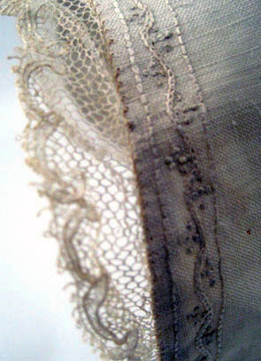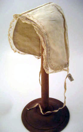 Vit barnmössa av lärft (linne?) med spetskant, 12 mm bred, samt en 6 mm bred broderad dekoration i form av en stiliserad blomsterslinga längs de främre kanterna. Mössan är sydd i två delar med ett bakstycke och ett framstycke som förenas av en söm som löper över bakre delen av hjässan, från öra till öra. Förstärkning fram i form av dubbelt tyg, 60 mm bred i mitten upptill. Mössan är något spetsig fram. 3 mm breda knytband är fästa bak i nederkanten i ett flätliknande mönster, för att knytas under hakan. Knytbanden går på grund av flätningen att spänna. Långa knytband.
