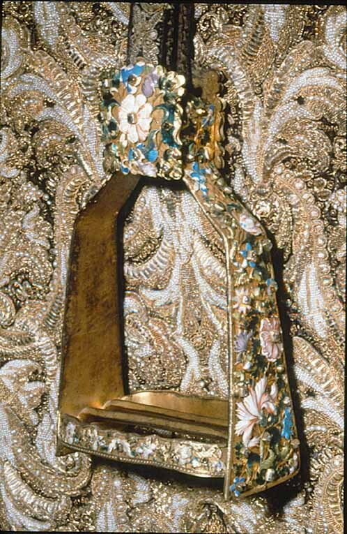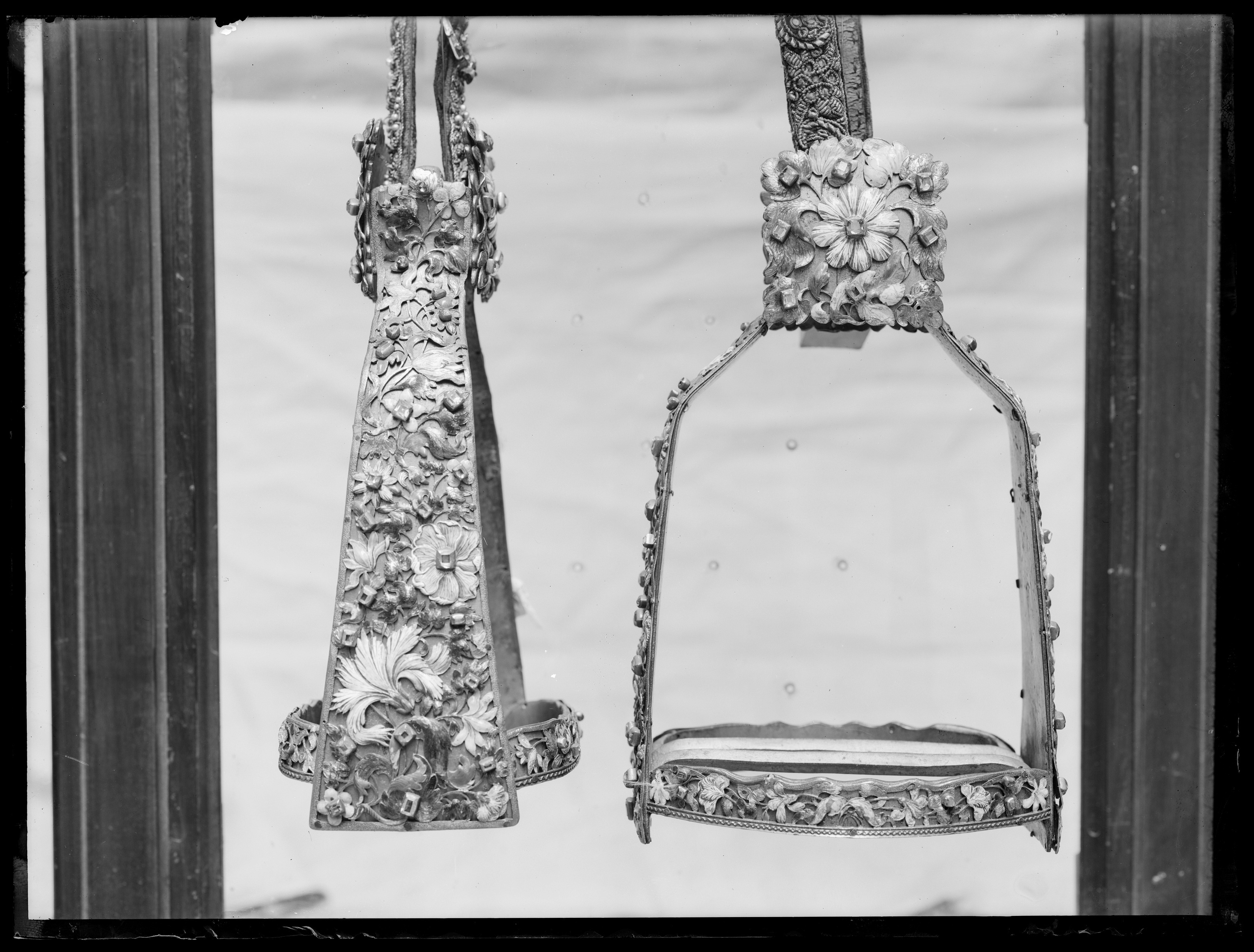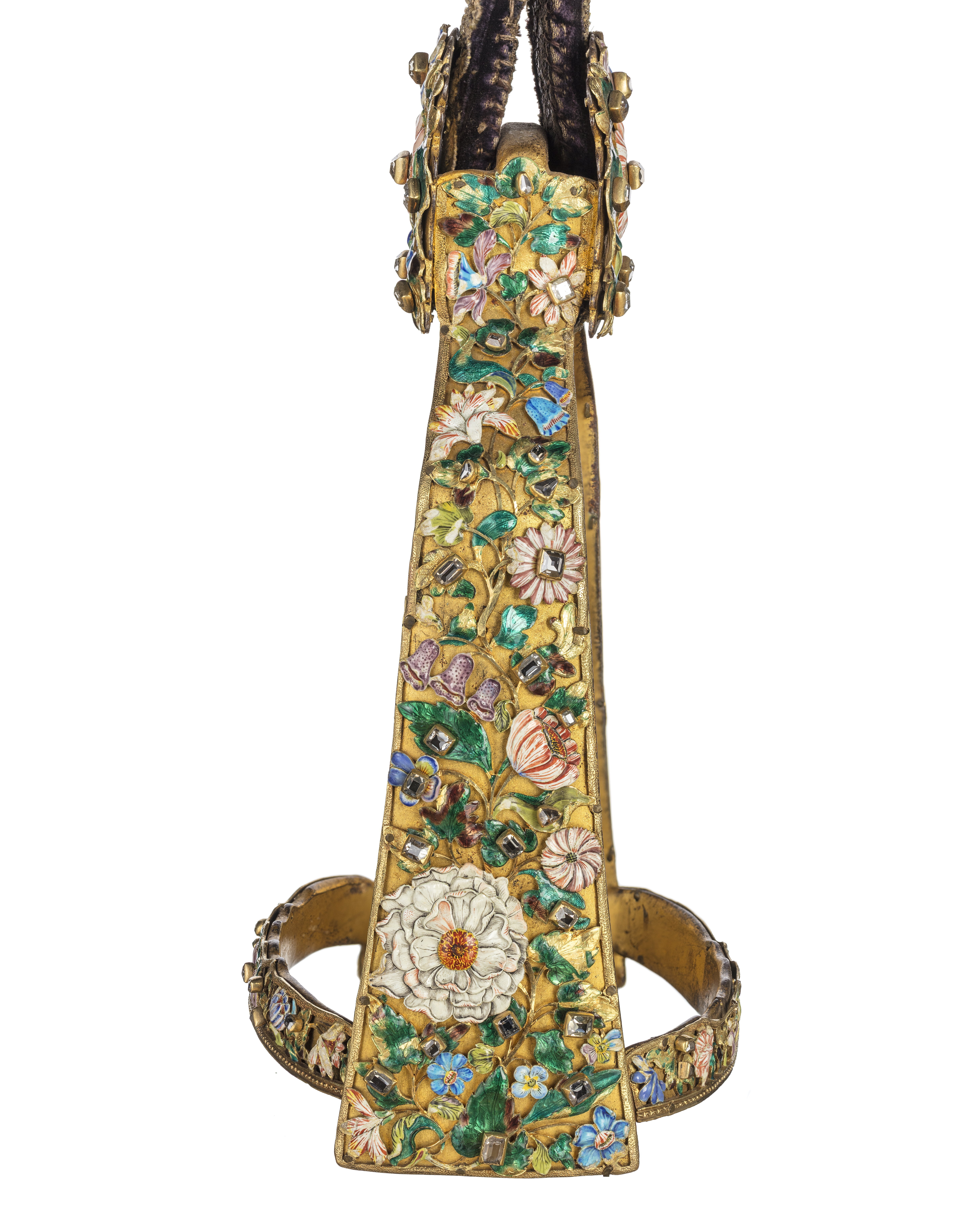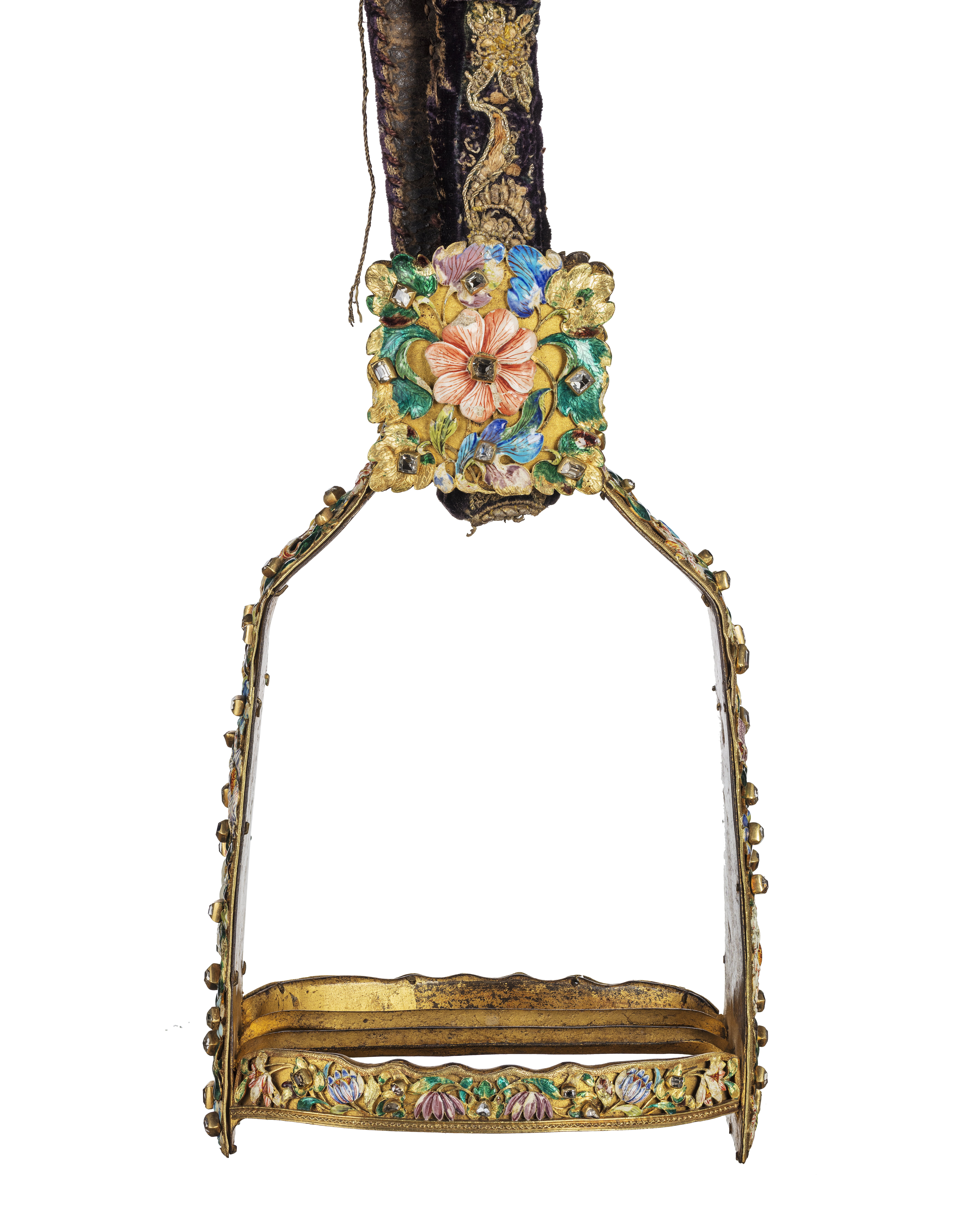 Stigbygel av förgyllt stål, upptill med vinkelformigt böjda skänklar. Skänklarna bredare nertill. Hela stigbygeln belagd med rankor av guldbleck med dekor av målad emalj, transparant och opak i form av blommor och blad samt däremellan infattade translucida stenar. Ovalt trampstöd med två längsgående tenar med fyrsidigt tvärsnitt. Framför och bakom remläget två kvadratiska, konturerade skärmar.