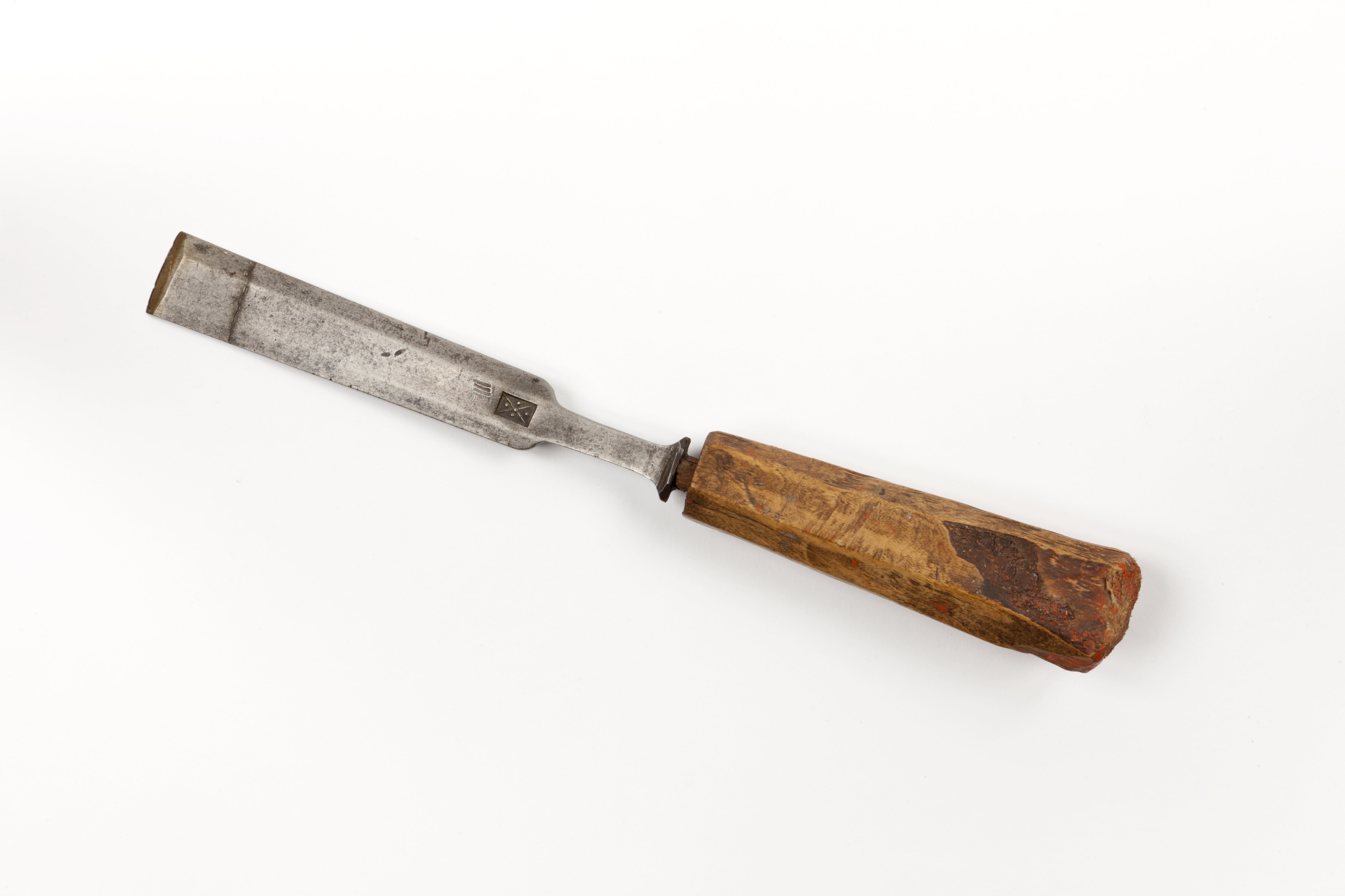 Platt stål med tresidig ovansida, fyrsidig klinga. Stämplat på stålet: rektangel korsad av två diagonaler, en punkt i varje sålunda uppkommen triangel. Rak egg, slipad från ovansidan. Vidgad bas. Skuret, åttsidigt skaft av björk..