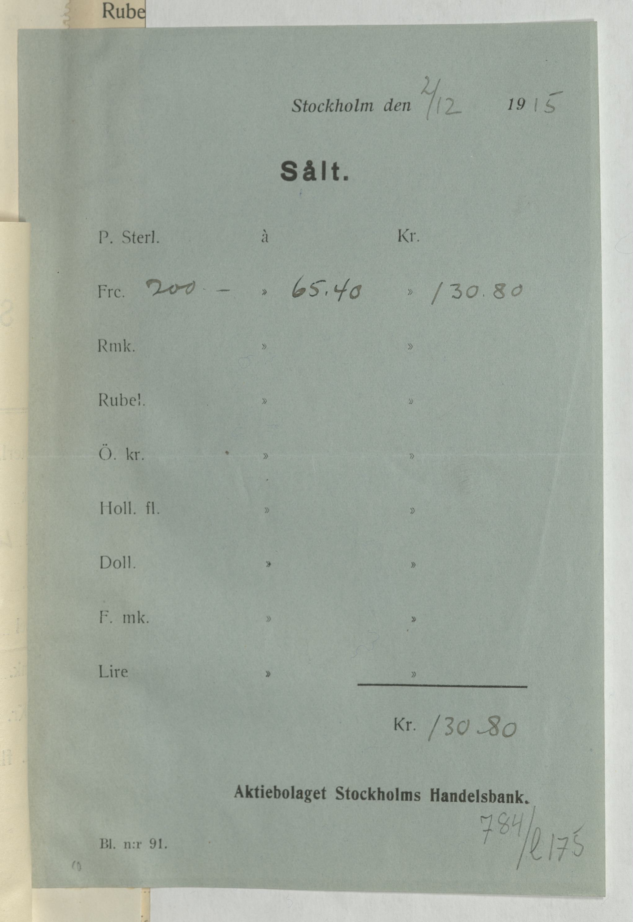 Verifikation från Aktiebolaget Stockholms Handelsbank