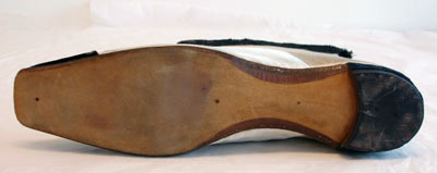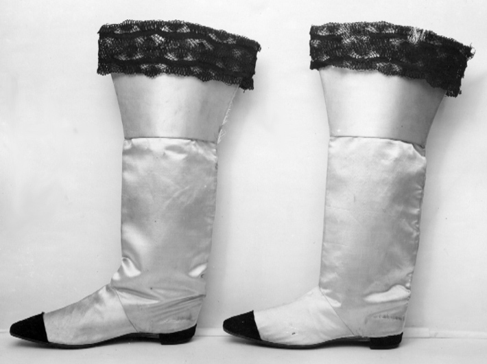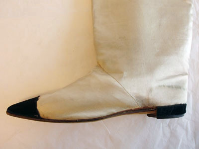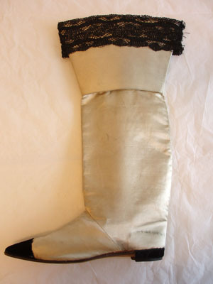 Stöveln har långt skaft sydd i vit sidenatlas med söm bak samt en krage som är 190 mm bred. Kragen är stärkt med papp och fodrat med silke samt utvändigt garnerad med en svart spets med en bredd på 90 mm och en omkrets på 580 mm. Stöveln har rak tå och tåhättan är dekorerad med svart sammet. Bakkappan har förstärkts med läder och fodret är i mjukt getskinn. Invändigt vid kragen är två stroppar av vävt bomull med två blåa ränder. Sulan är formskuren i ljusbrunt sämskläder och klacken är beklädd med svart sammet. Klacken är 22 mm hög, 55 mm bred och 47 mm djup. Sulan har två pinnhål och klacken har två styck.