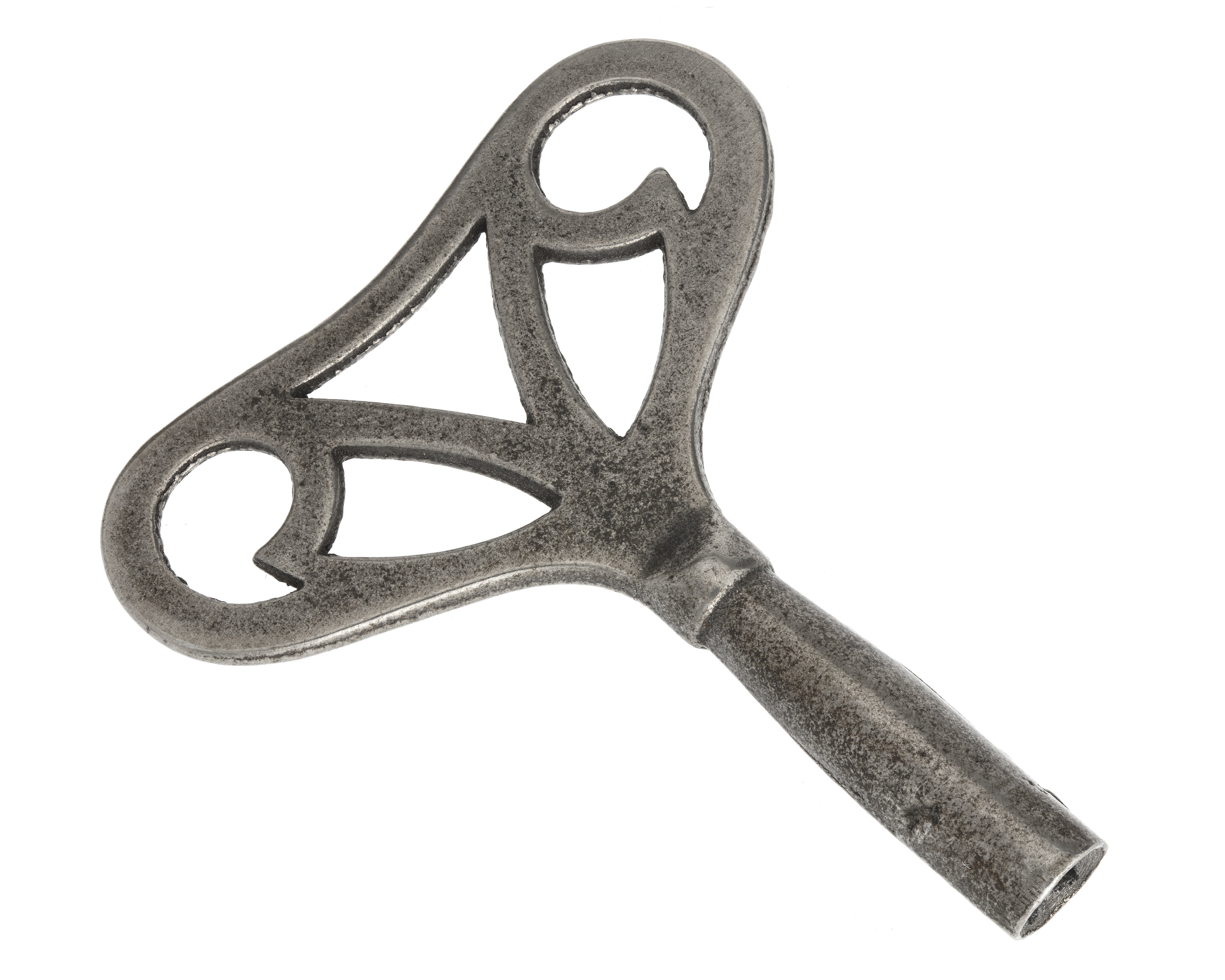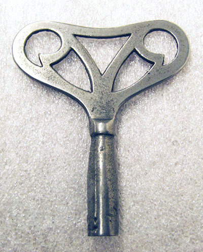 Nyckel helt i blankt stål. Upptill oregelbundet platt grepp med rundade sidor och insvängt mittparti, genombrutet i fem konturerade hål. Nedre delen cylindrisk, ihålig och med cirkulärt tvärsnitt.