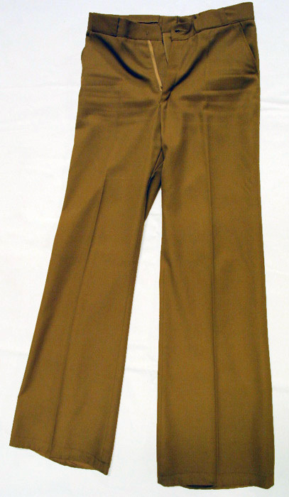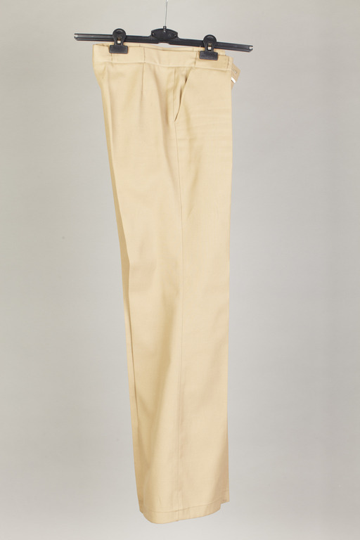 Ljusbruna eller beiga gabardinbyxor med utställda ben. Linning i tyget med 4 st ca 7 cm breda hällor, söm mittbak. Plastblixtlås i gylfen. Pressveck. Två inprovningar bak. Fickpåsar i nylon.