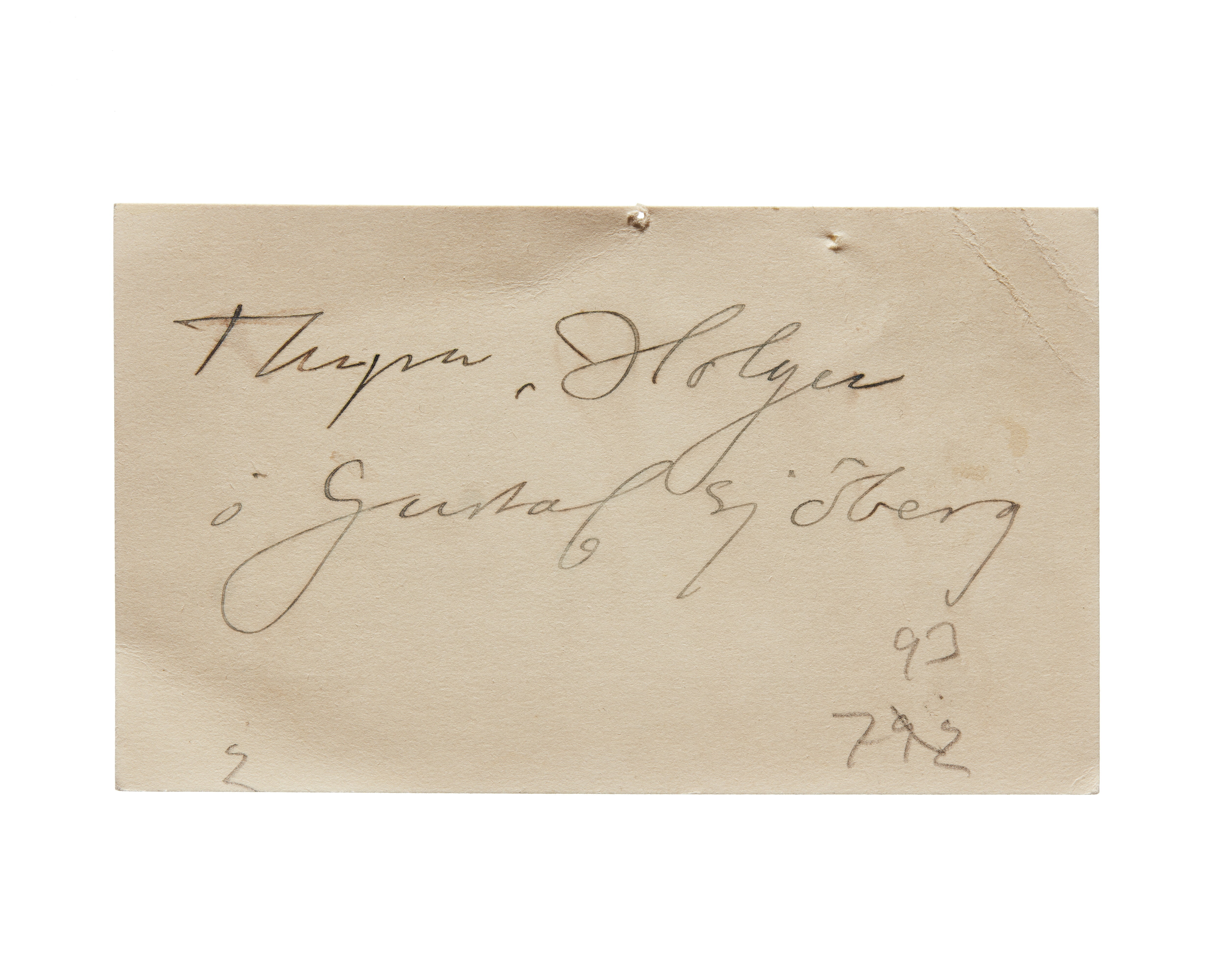 Två visitkort från Thyra, Holger och Gustaf Sjöberg. Första kortet daterat 1 oktober 1924. Handskrift "Med de varmaste välönskningar från Familjen Sjöberg". Hål i övre vänstra hörnet med vitt band. Andra kortet daterat 1 oktober 1919. Handskrivet.