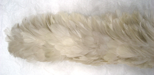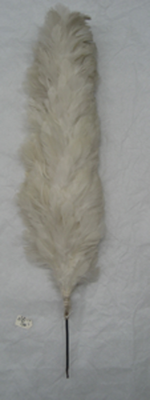 Rak ståndarplym av vita, klippta tuppfjädrar. Fjädrarna är sammanfästade på ett rakt skaft av stål. Vid skarven mellan fjädrar och skaft är virat med gråvit tråd.