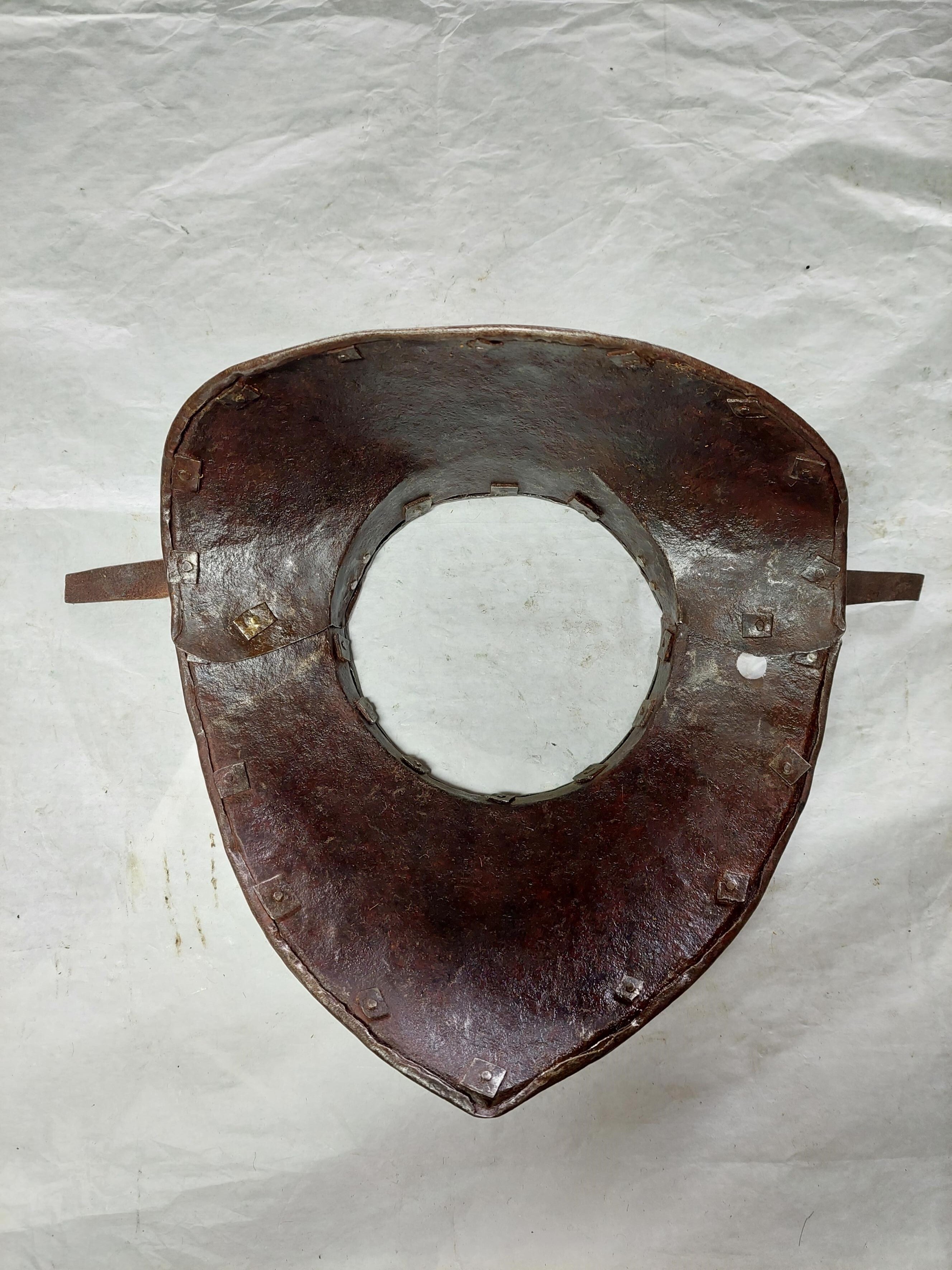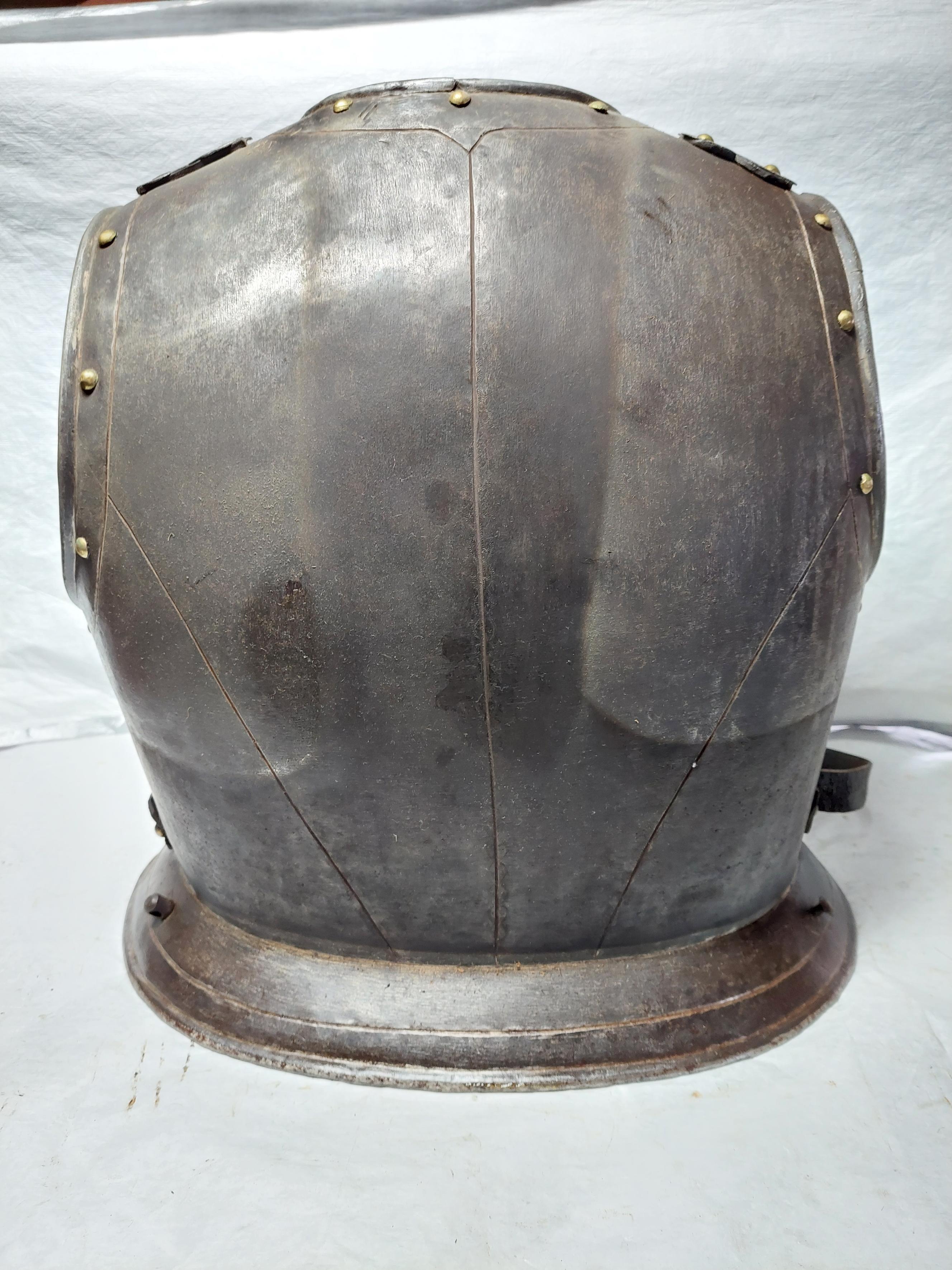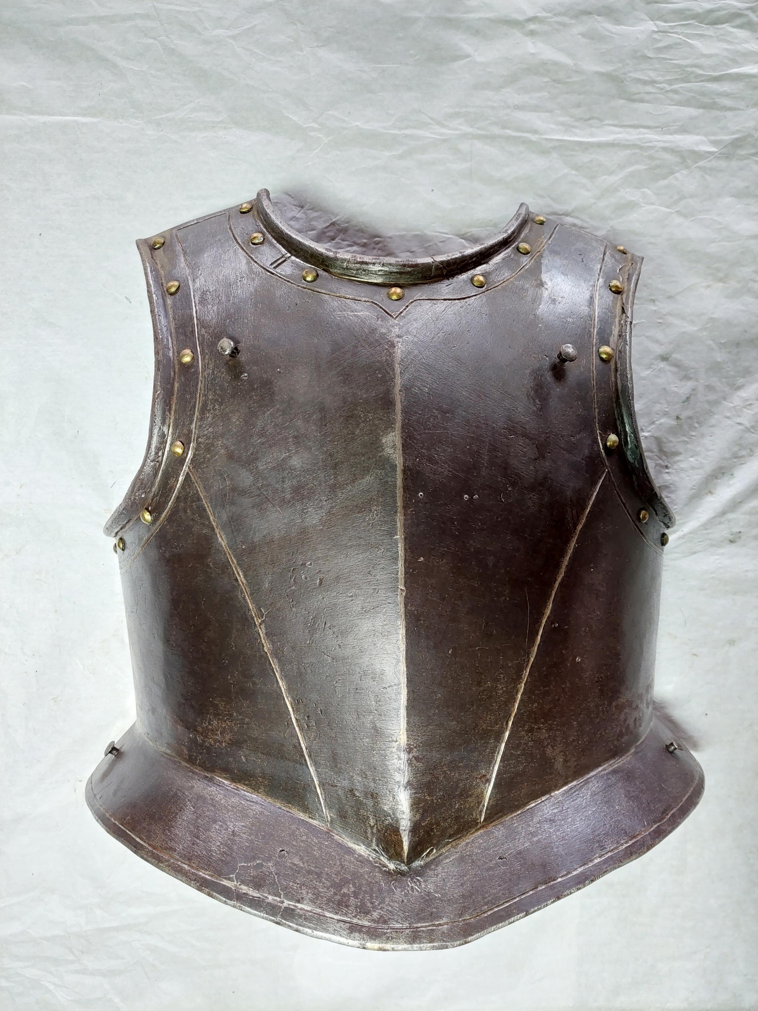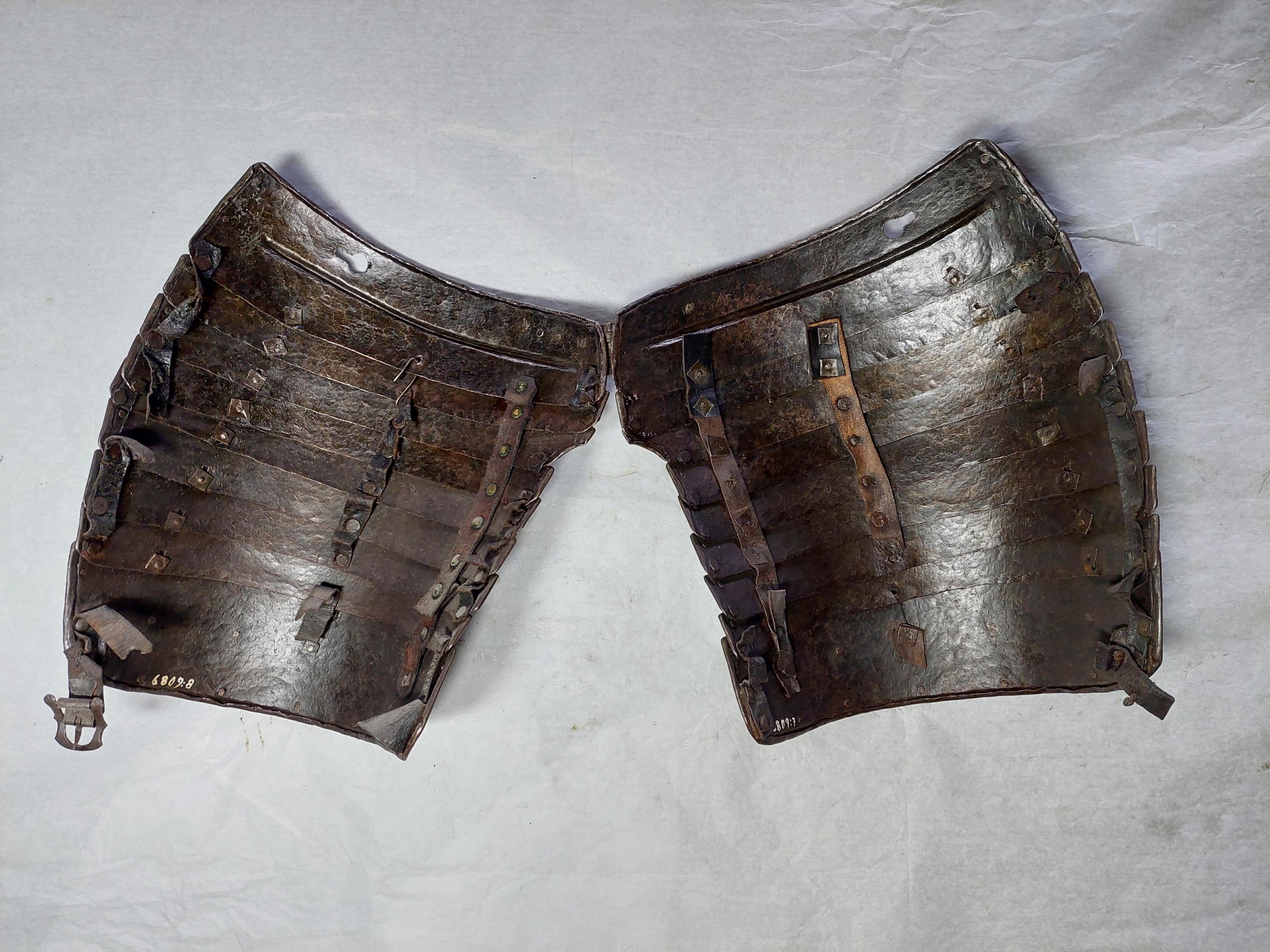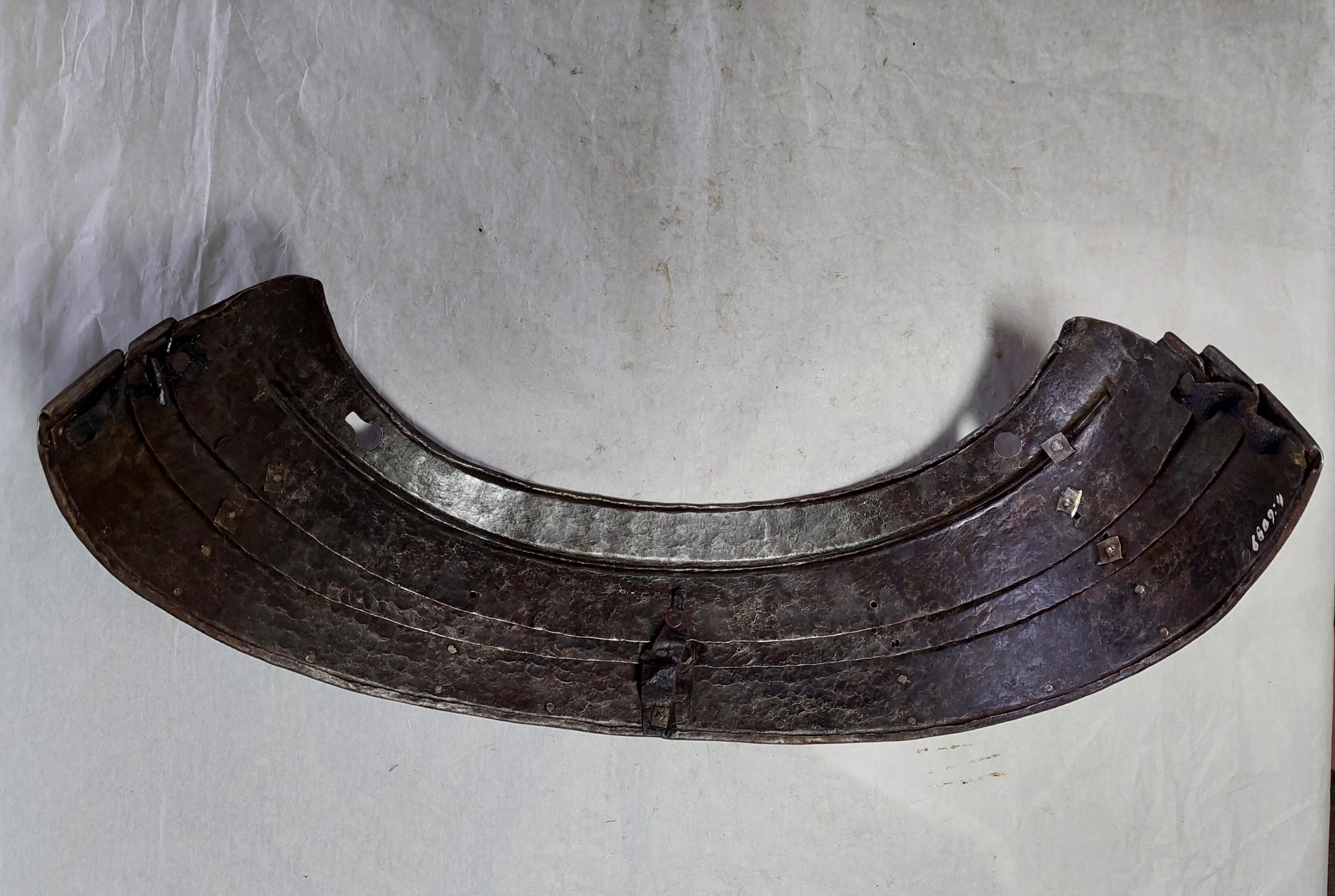 KOMPLETTERANDE BESKRIVNING Fältrustning för kavalleri av bättre kvalité. 68109:1 Bröstharnesk med i hals- och armringning utåt omvikta, rundsmidda kanter. Innanför dessa stålnitar med pålödda mässingsskållor. Dessa har sannolikt hållit läderfodret. Foder saknas. Igensatta hål på utviket mitt fram. Bröstplåten torde vara skottfri (tjocklek: 5.5.-7,5 mm). Den sticklade dekor framstår som mycket svag i jämförelse med tassetterna och axelstyckena. Harnesket har svärtats senare, när sticklingen redan var utförd. De mejslade linjer över bröstet är sannolikt uppmejslad samtidigt som den svärtades om. 6809:2 Ryggharnesk med i hals- och armringning, samt nederkant som är inåt omvikta och rundsmidda . Innanför dessa (ej vid nederkanten) stålnitar med pålödda mässingsskållor. . Axellädret är utbytt (möjligen ör höger ursprunglig med sina plåtar intakta). Den sticklade dekor framstår som mycket svag i jämförelse med tassetterna och axelstyckena. Harnesket har svärtats senare, när sticklingen redan var utförd. De mejslade linjer över bröstet är sannolikt uppmejslad samtidigt som den svärtades om. Midjeremmen saknar spänne. 6809:3 Halskrage med inåt omvikta, rundsmidda ytterkanter. Längs dessa stålnitar med pålödda mässingsskållor. Remmarna vid axlarna är bytta. 6809:4 Ländskört med inåt omvikta, rundsmidda ytterkanter och stålnitar med pålödda mässingsskållor. De två nedersta lamellerna är skarvade mitt på. Spår av läder. Märkt med "II". Samma hammare har använts som på tassetterna. 6809:5-6 Axelstycken med inåt omvikta, rundsmidda ytterkanter samt stålnitar med pålödda mässingsskållor. Utbytt läder. Insidan utan svartmålning, som på två av de andra i gruppen. 6809:7-8 Tassetter med inåt omvikta, rundsmidda ytterkanter. Stålnitar med pålödda mässingsskållor. Lamellerna nitade i varnade i avlånga hål i ytterkant men på remmar i mitten och i innerkant. Delar av lädret bytt. Vänster tassett med vinklat gångjärn och krok. Delarana har lika märken efter en hammare med skadad slagyta. Vänster tassett har ett spänne i rem. avståndet mellan lamellernas spetsar är inte lika på höger och vänster.