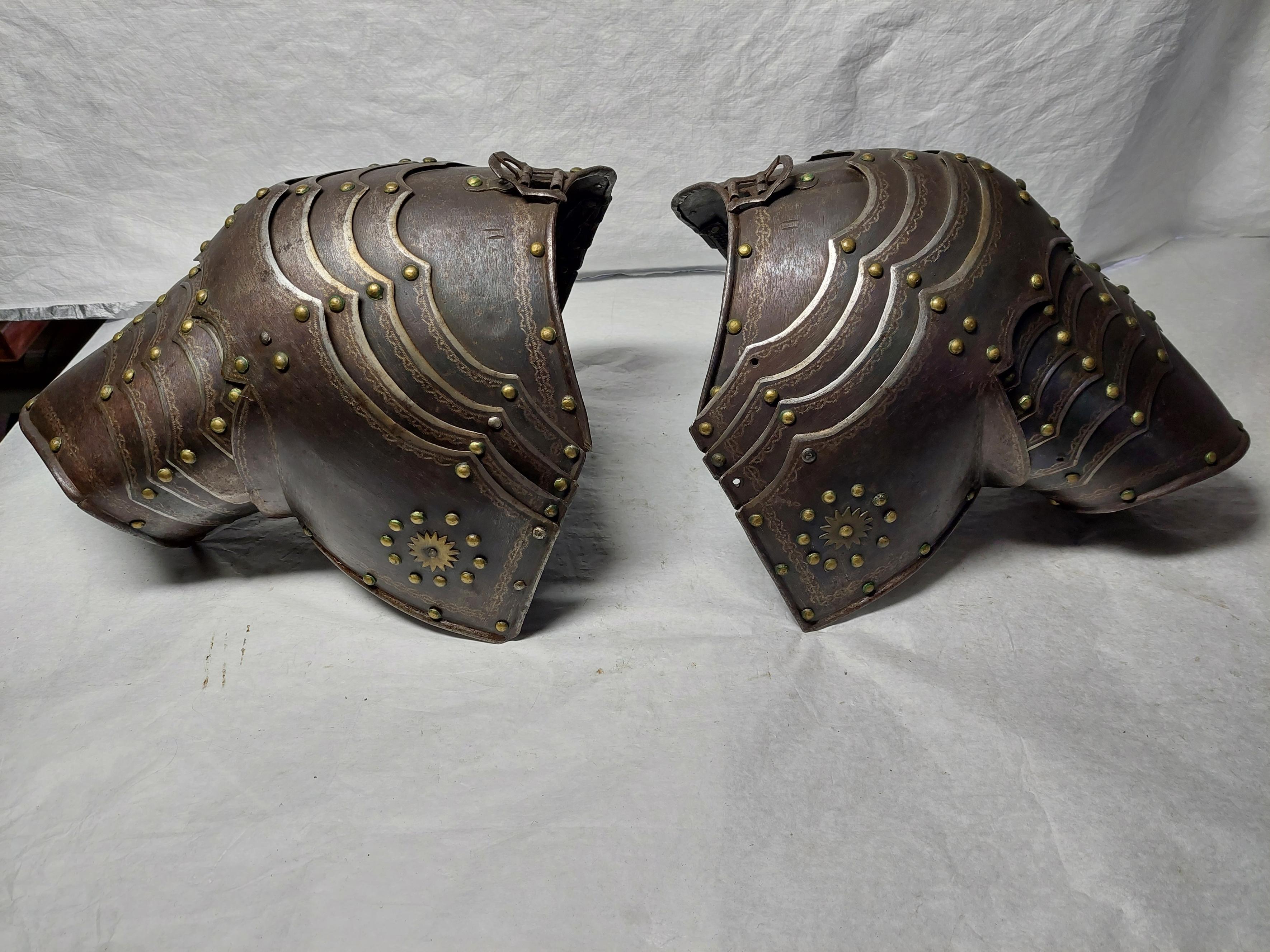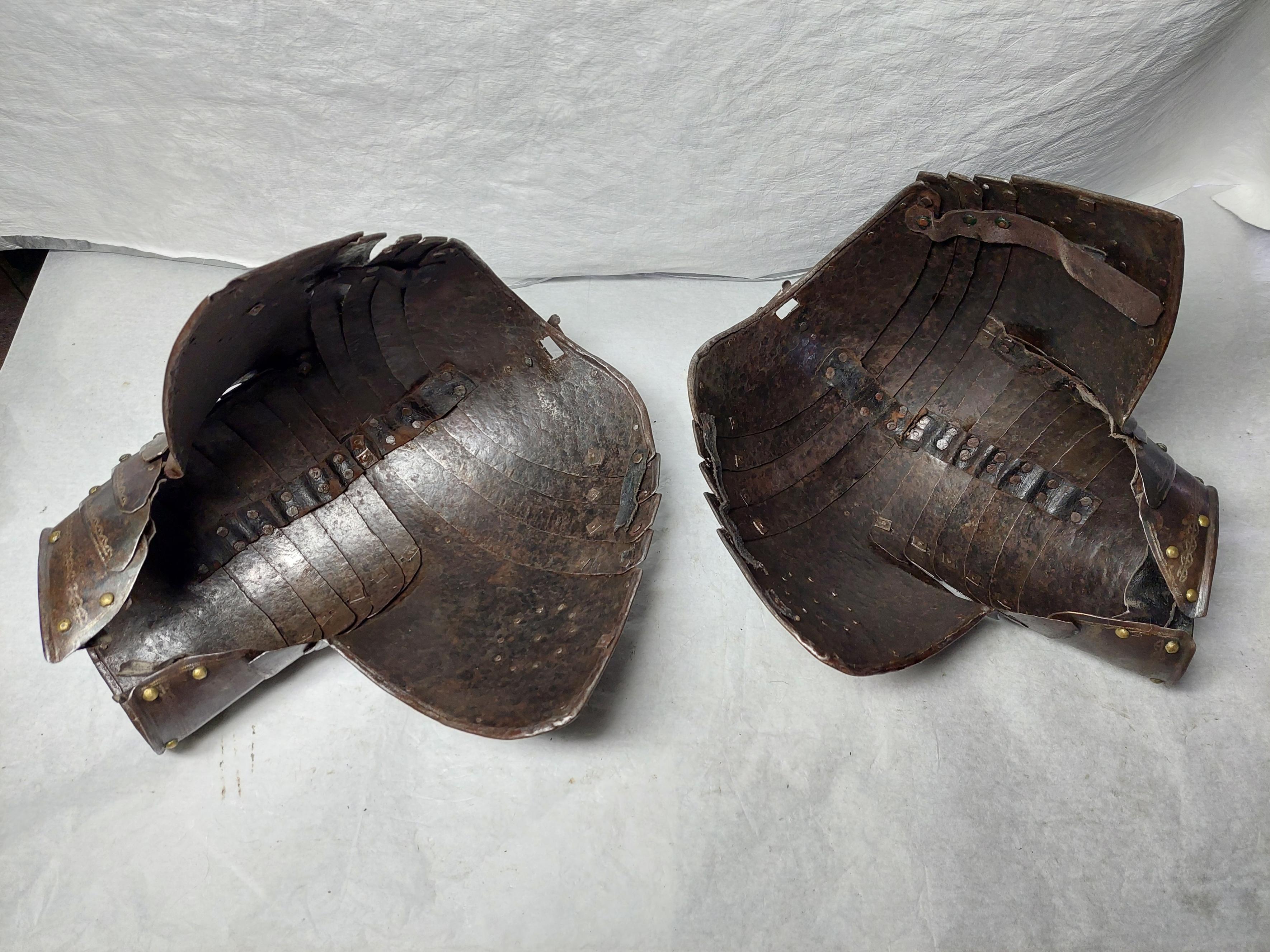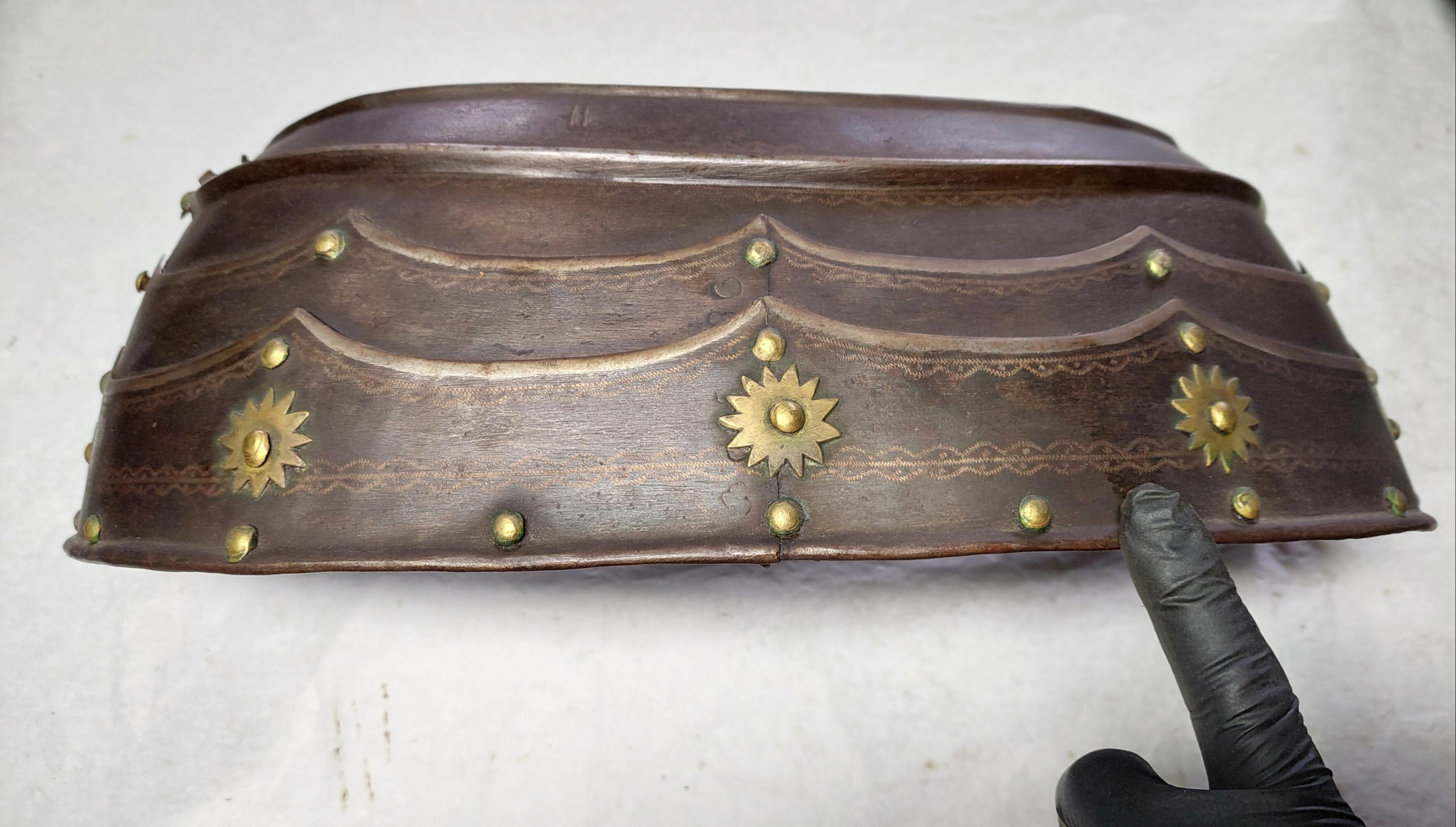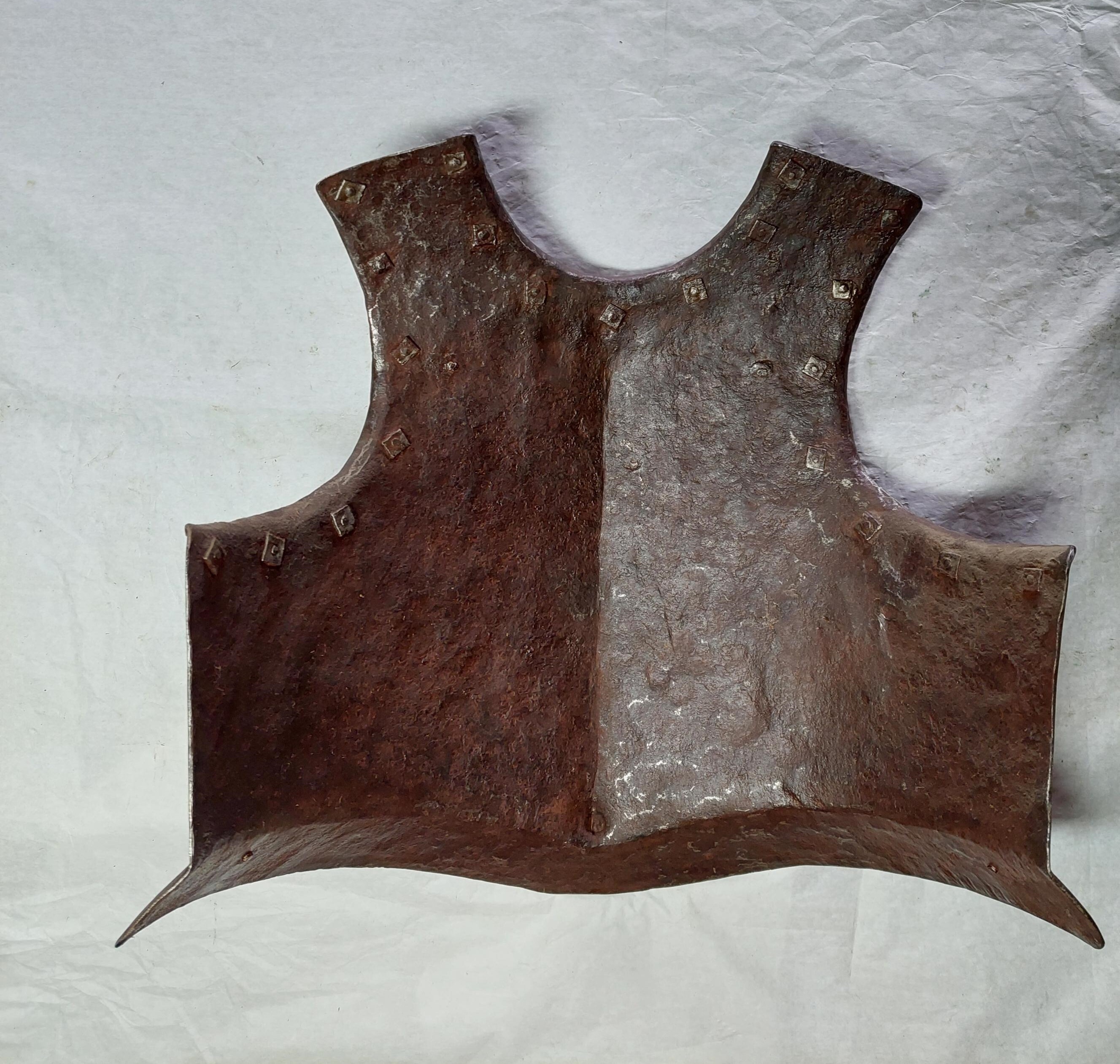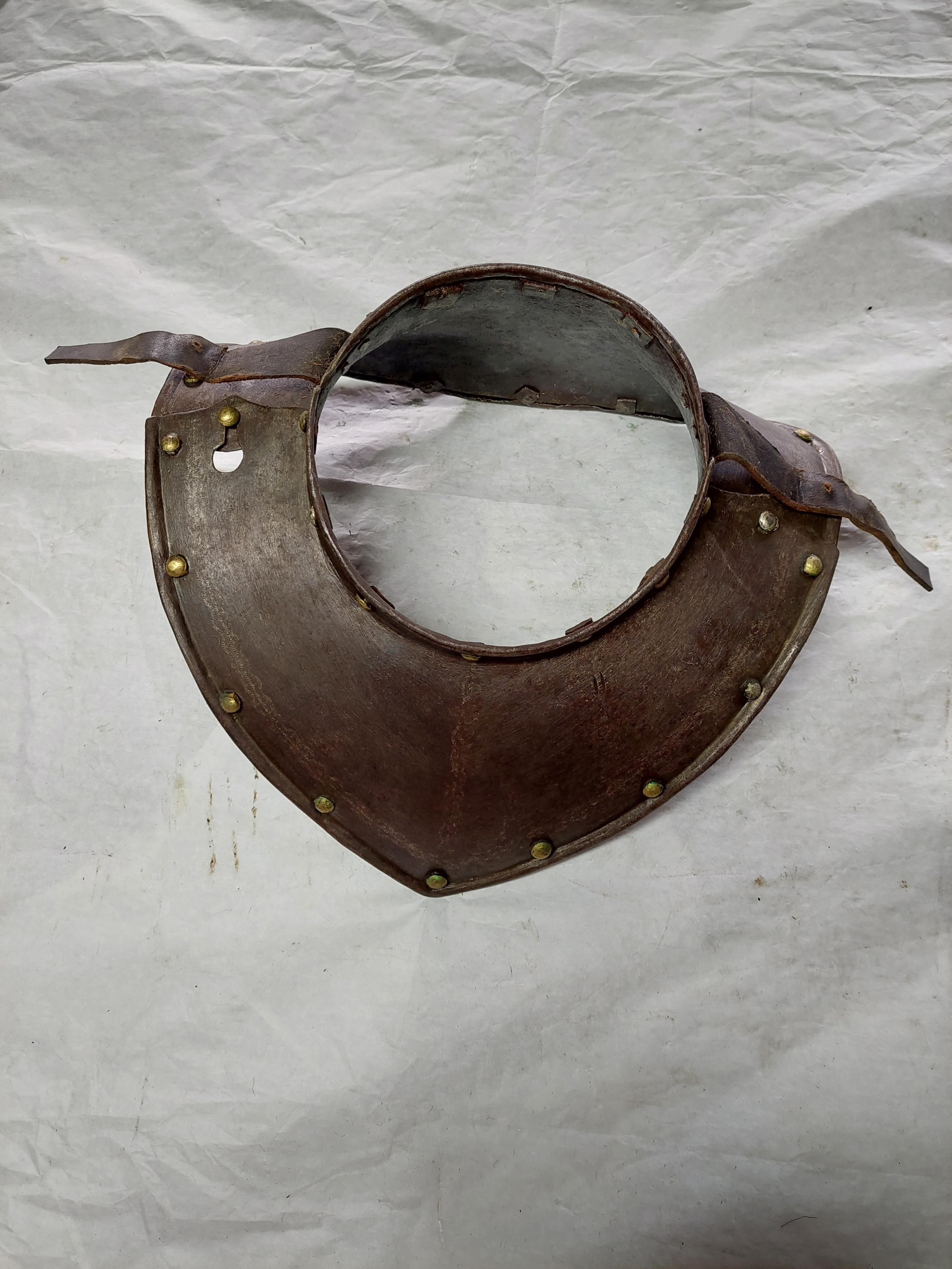 KOMPLETTERANDE BESKRIVNING Fältrustning för kavalleri av bättre kvalité. 68109:1 Bröstharnesk med i hals- och armringning utåt omvikta, rundsmidda kanter. Innanför dessa stålnitar med pålödda mässingsskållor. Dessa har sannolikt hållit läderfodret. Foder saknas. Igensatta hål på utviket mitt fram. Bröstplåten torde vara skottfri (tjocklek: 5.5.-7,5 mm). Den sticklade dekor framstår som mycket svag i jämförelse med tassetterna och axelstyckena. Harnesket har svärtats senare, när sticklingen redan var utförd. De mejslade linjer över bröstet är sannolikt uppmejslad samtidigt som den svärtades om. 6809:2 Ryggharnesk med i hals- och armringning, samt nederkant som är inåt omvikta och rundsmidda . Innanför dessa (ej vid nederkanten) stålnitar med pålödda mässingsskållor. . Axellädret är utbytt (möjligen ör höger ursprunglig med sina plåtar intakta). Den sticklade dekor framstår som mycket svag i jämförelse med tassetterna och axelstyckena. Harnesket har svärtats senare, när sticklingen redan var utförd. De mejslade linjer över bröstet är sannolikt uppmejslad samtidigt som den svärtades om. Midjeremmen saknar spänne. 6809:3 Halskrage med inåt omvikta, rundsmidda ytterkanter. Längs dessa stålnitar med pålödda mässingsskållor. Remmarna vid axlarna är bytta. 6809:4 Ländskört med inåt omvikta, rundsmidda ytterkanter och stålnitar med pålödda mässingsskållor. De två nedersta lamellerna är skarvade mitt på. Spår av läder. Märkt med "II". Samma hammare har använts som på tassetterna. 6809:5-6 Axelstycken med inåt omvikta, rundsmidda ytterkanter samt stålnitar med pålödda mässingsskållor. Utbytt läder. Insidan utan svartmålning, som på två av de andra i gruppen. 6809:7-8 Tassetter med inåt omvikta, rundsmidda ytterkanter. Stålnitar med pålödda mässingsskållor. Lamellerna nitade i varnade i avlånga hål i ytterkant men på remmar i mitten och i innerkant. Delar av lädret bytt. Vänster tassett med vinklat gångjärn och krok. Delarana har lika märken efter en hammare med skadad slagyta. Vänster tassett har ett spänne i rem. avståndet mellan lamellernas spetsar är inte lika på höger och vänster.