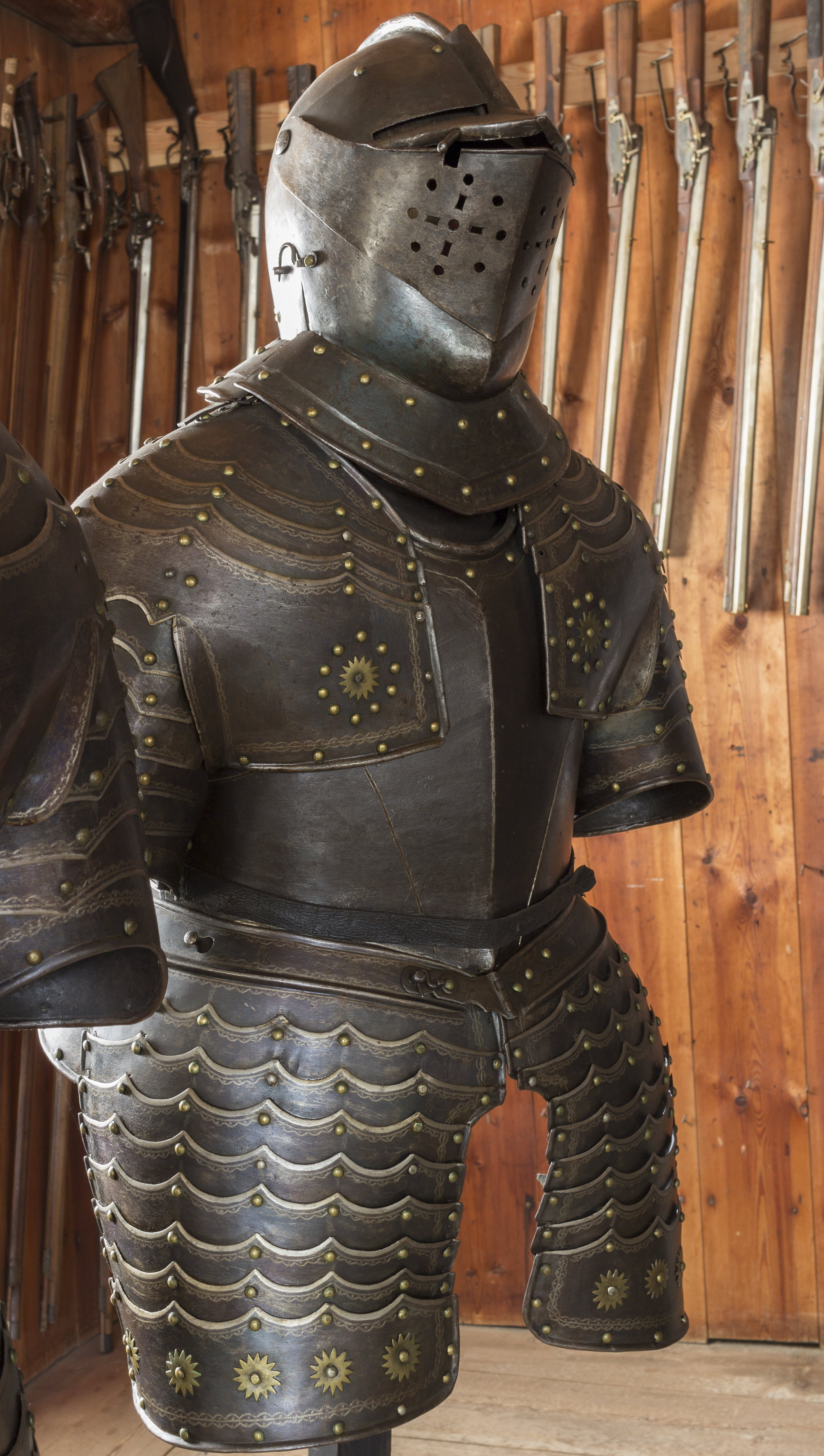 Samtliga delar märkta med inslaget:11. Av blånerat stål med nitar av mässing. Lamellernas överkanter vågprofilerade och blankpolerade, samt med bårder av graverade uddar och flätband - framträder blanka. Bestående av: Bröstharnesk 6809:1 Ryggharnesk 6809:2 Ringkrage 6809:3 Ländskört 6809:4 H. axelstycke 6809:5 V. axelstycke 6809:6 H. tassett 6809:7 V. tassett 6809:8 Hjälm 6810 6809:1 Bröstharnesk. Rundad halskant, lika kring armhålen. Bården kring armhål, hals och utmed den markerade mittåsen, vilken senare mot harneskets nederdel avslutas i liten utbuktning. Bårder även på vardera sidan om mittåsen - snett över sidorna. Mittlinjens överdel avslutas med hjärta. På bröstets vardera sida knopp av stål för fästande av ryggharneskets axelremmar. I nederkanten två knappar för påhakande av tassetterna. Höjd: 340 mm, bröstvidd: 530 mm. 6809:2 Ryggharnesk. Låg, rundad halskant, lika kring armhål. Graverad flätbandsdekor kring hals, vid mittlinje samt snett över sidorna. I vardera axeln fastnitad läderrem med stålbeslagen framände med två knapphål. I vardera sidan fastnitad läderrem - den vänstra med spänne - att spänna kring bröstharneskets midja. Höjd: 410 mm, ryggvidd: 540 mm. 6809:3 Ringkrage. Graverade flätband vid mittlinjen fram och bak. I vardera sidan läderrem att spänna fast i axelstyckenas spännen. Rött läderfoder. Höjd: 140 mm. 6809:4 Ländskört. Bestående av tre lameller. Den undre med fem mässingsstjärnor. Höjd: 150 mm, bredd: 730 mm. 6809:5 Höger axelstycke med överarmsskydd. Axelstycket består av fem lameller. Bröst- och skulderdel med mässingstjärna. Längd: 460 mm, diameter: 520 mm. 6809:6 Vänster axelstycke med överarmsskydd. Axelstycket består av fem lameller. Bröst- och skulderdel med mässingstjärna. Längd: 450 mm, diameter: 460 mm. 6809:7 Höger tassett. Bestående av 9 lameller. Den övre med stålögla för vänster tassetts spänne. Den undre lamellen med fem mässingstjärnor. På insidan av undre lamellen rem och spänne. Höjd: 360 mm, bredd: 360 mm. 6809:8 Vänster tassett. 9 lameller. Den övre med gångjärnsförsett spänne. Den undre med fem mässingstjärnor. På insidan av den undre lamellen finns det ett spänne. Höjd: 360 mm, bredd: 360 mm.