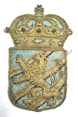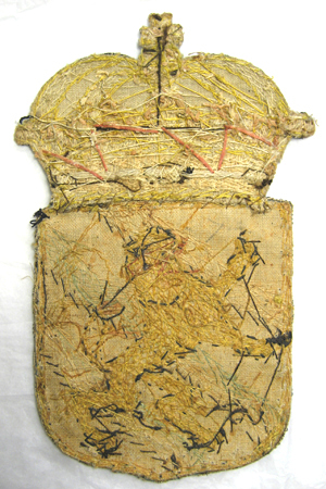 Vapensköld av ljusblå sidenatlas med ett stående dubbelsvansat lejon broderat med läggsöm i relief med förgylld silvertråd. Man, benskägg och svanstippar är broderade med krusad tråd. Klorna är av kantilj av silvertråd, gapet kantas av en snodd av förgylld silvertråd och gul silkestråd och tungan är av blekt röd silkestråd. Ögat utgörs av en svart pärla runtom kantat av kantilj av förgylld tråd. Örat markeras av kantilj av förgylld tråd och är ifyllt med svart silkestråd. Bakom lejonet är broderat tre vågskuror bildande ginbalkar av silvertråd och vit silkestråd samt med strengar av svart och brun silkestråd. Skölden kantas runtom av en tjockare och en smalare snodd av förgylld silvertråd, samt ytterst av vit silkestråd omvirad av silvertråd utdragen i små öglor. Vapnet kröns av en kunglig krona broderad med förgylld silvertråd och förgyllda silverlan på en botten av ljusblå sidenatlas. Kronring och kronspetsar kantas av samma slags snoddar som skölden. På kronringen är broderat tre stenimitationer av silverlan runtom kantade av svart silkestråd omvirad med förgylld silvertråd. Mellan stenimitationerna är broderat små blommor av kantilj av silvertråd. Nedanför kronspetsarna är broderat små stenimitationer av svart silkestråd omvirad av förgylld silvertråd. Kronan kröns av en liten korsglob av förgylld silvertråd och med silverlan med spår av förgyllning. Vapnet är på baksidan klätt med naturfärgad linnelärft.