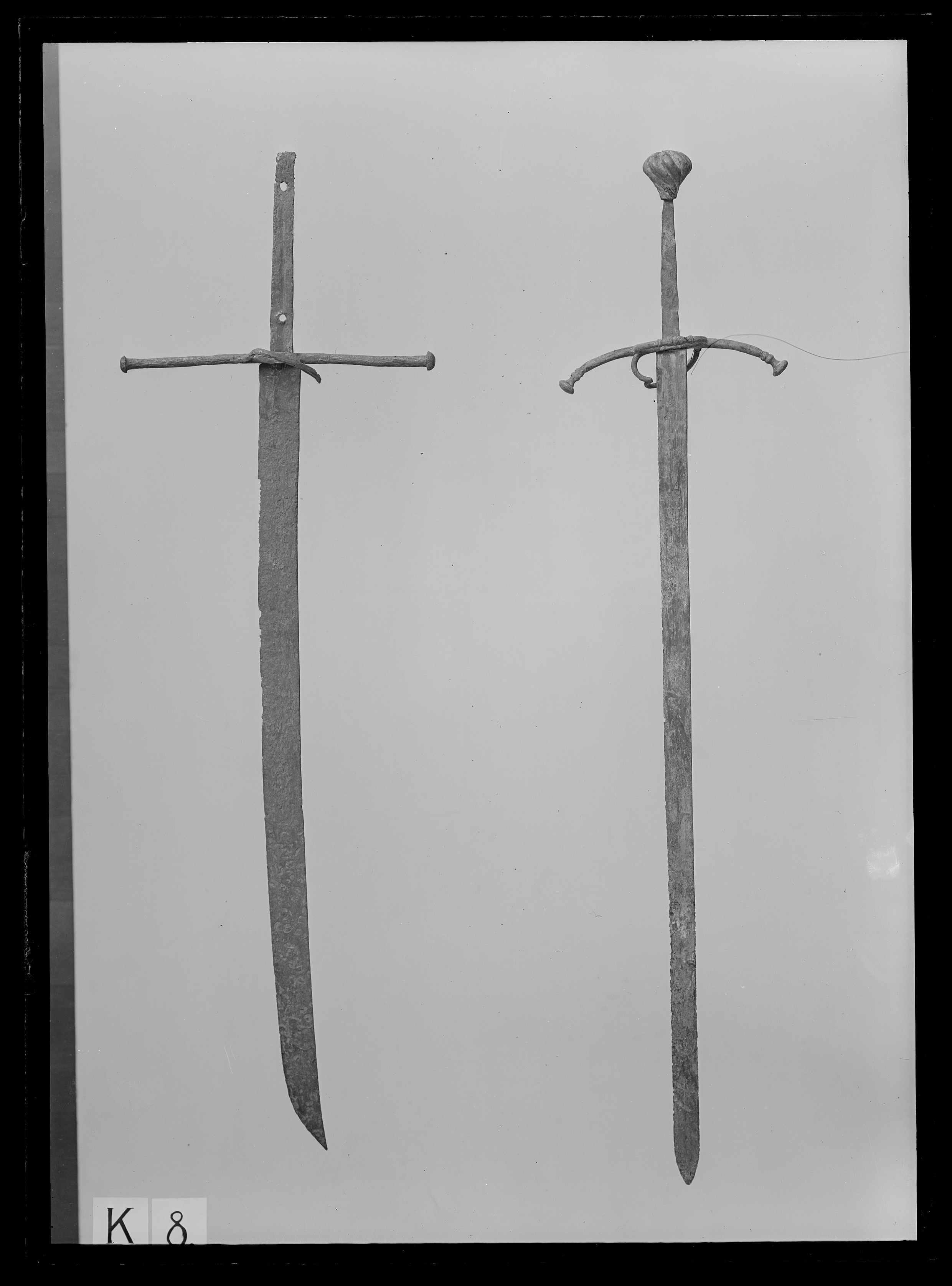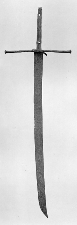 Vapnet i sin helhet med mörkbrun ytbeläggning (över rostskadorna). Av fästet återstår endast de raka parerstängerna, vilkas längd tillsammans med det mellanliggande krysspartiet är 345 mm ytterändar, på yttre sidan en bågformig kryssbygel, vars ena fäste är söndrigt, bygeln där nedåtböjd. Tången platt med en längsgående mittkäl på utsidan, upptill och nedtill ett runt hål (för nitning av den förkomna kaveln). Klinga eneggad, något böjd vid spetspartiet, spetsen bildad genom eggsidans dragning bakåt mot ryggsidan. Utmed mitten en bred grund hålkäl. På baspartiets insida en inslagen mästarstämpel i form av ett A, som är av samma typ som användes av Juanes de Toledo (även känd som Juanes el Viejo).