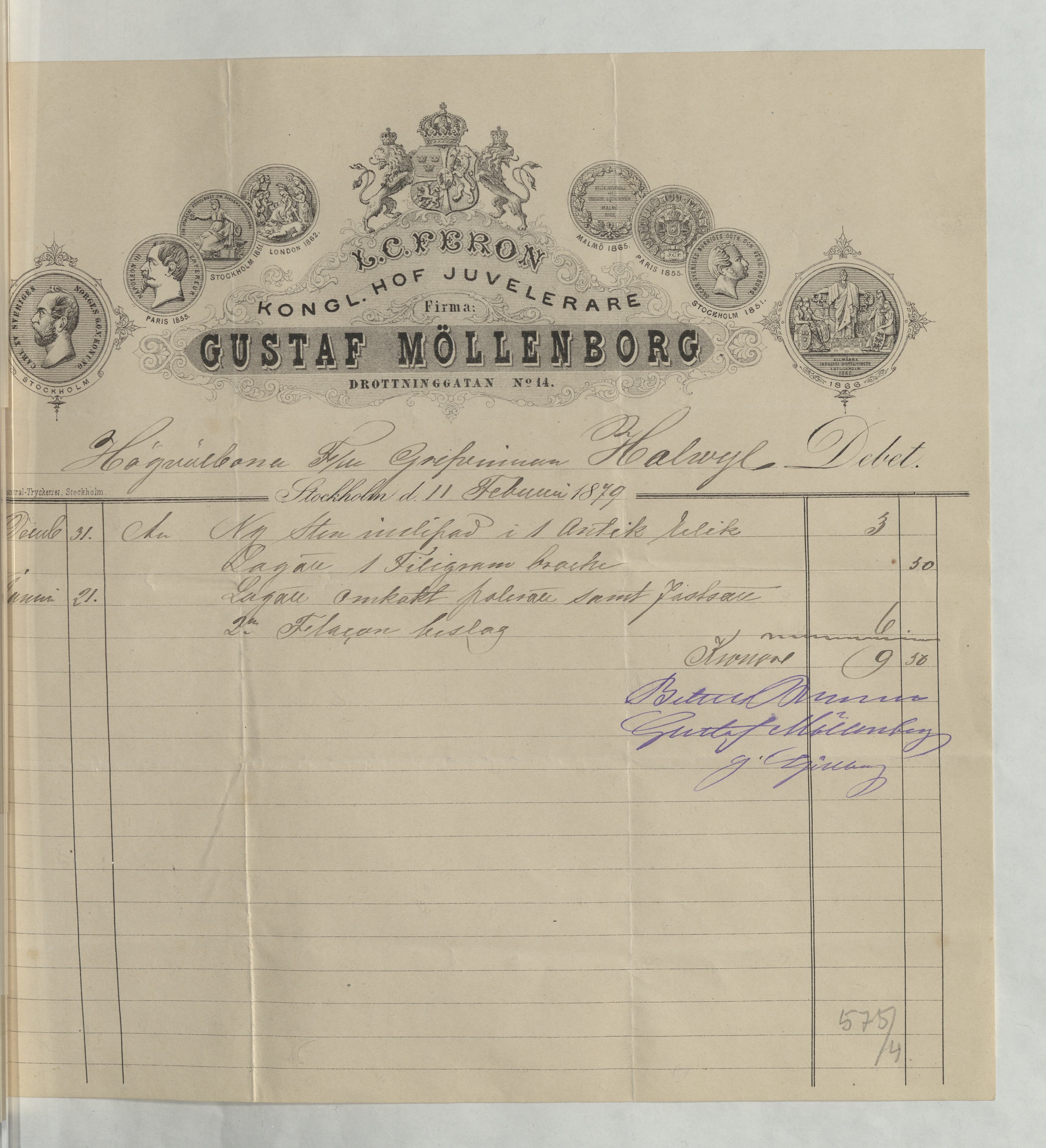 Kvitto från Gustaf Möllenborg, Juvelerare, 1879.