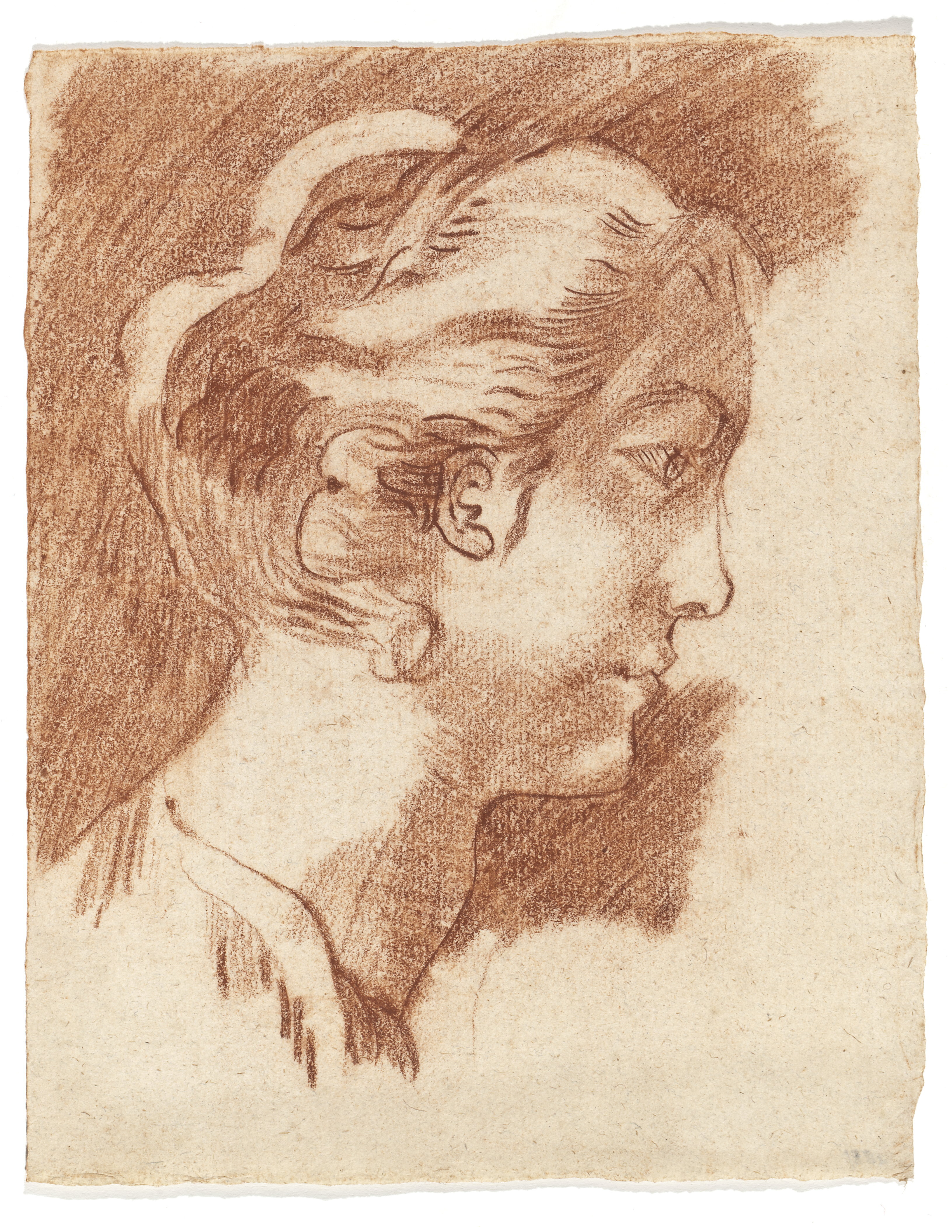 Ritstudie föreställande kvinnohuvud, profil höger. Rödkrita på papper.