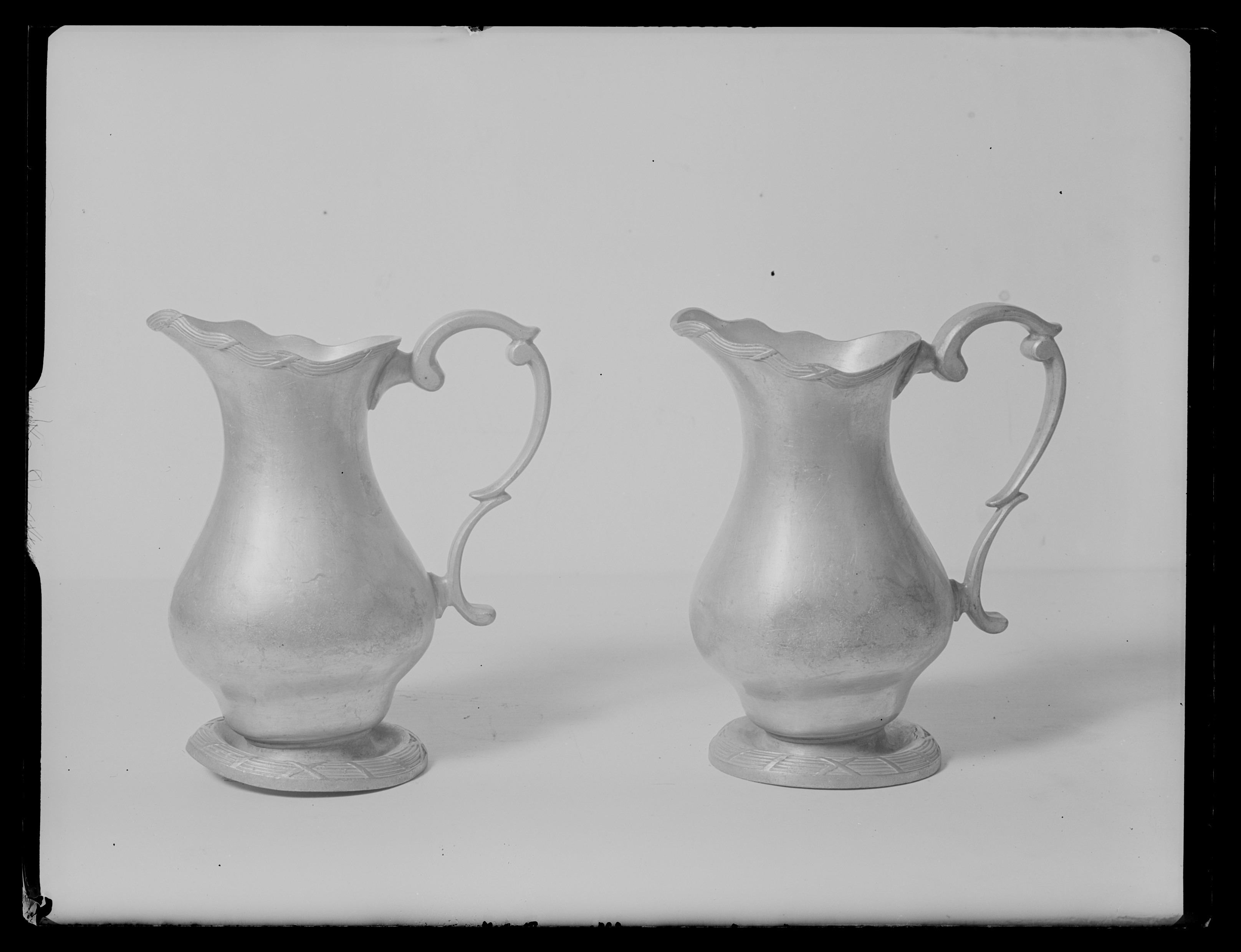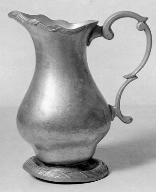 Päronformad, tennkanna, vågig mynning med repstav runt kanten. Oval fot med repstavskant. Lodgrepe formad som tre sammanhängande C-bågar.