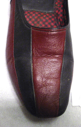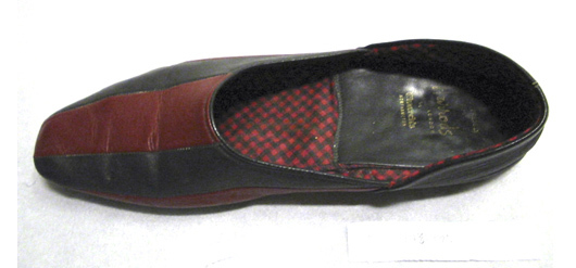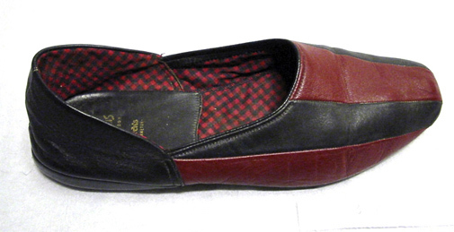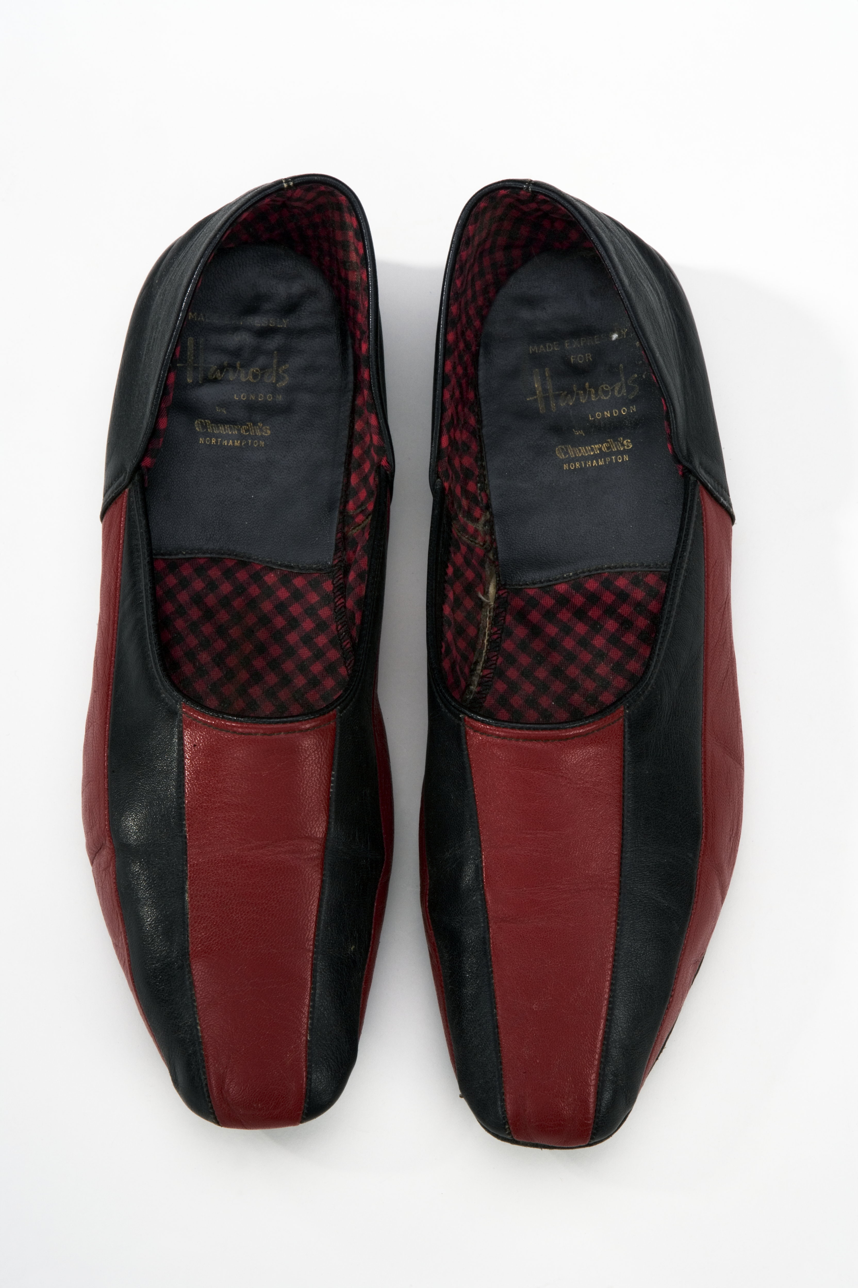 Högertoffel med tåhättan av hopsydda röda och svarta skinnremsor. Hälstycke av svart skinn. Mjuk, svart sula med låg klack. Fodrad med stickad ylle med svarta ränder mot röd botten. I hälen en svart skinnsula med firmanamnet: "MADE EXPRESSLY // FOR // Harrods // LONDON // by // Church's // NORTHAMPTON".