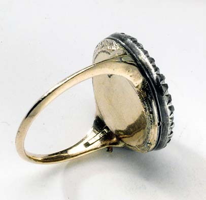 Gouache på elfenben(?). Bröstbild, fas h, blå ögon, hög frisyr, blå klänning med vit spets, juvelbesatta örhängen och halsband, gröngul bakgrund. Infattad bakom välvt glas(bergkristall) i fattning av silver med 31 små briljanter. Fattningens baksida täckt med guldplatta med två nedåtriktade tenar, fästade med stift i guldring med triangulärt tvärsnitt. Briljantslipning sägs ha uppfunnits i Venedig. Gamla briljantslipningar har 58 fasetter jämfört med den moderna versionen om 57 fasetter. Förr hade man svårt att få kuletten, stenens spetsiga underdel, perfekt varför man hellre gjorde en extra fasett. Den syns som en liten svart prick i stenens botten, som på Lovisa Ulrikas ring. Briljantslipningen hjälpte till att reflektera ljus och blev därför mycket attraktiv under rokokon på grund av sin vackra lyster. Folie bakom stenen kunde även användas för att förstärka effekten. elcr 2016-11-15